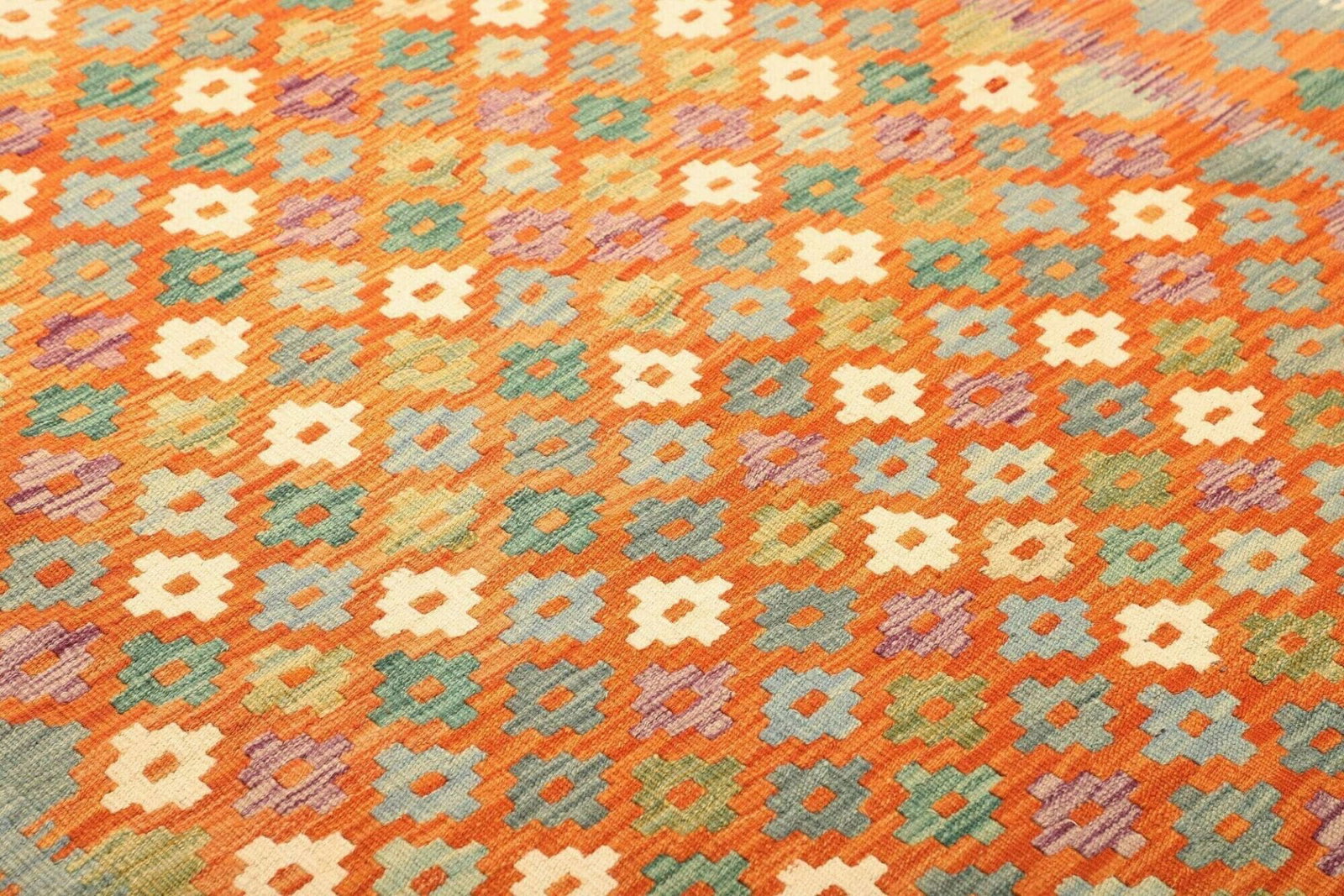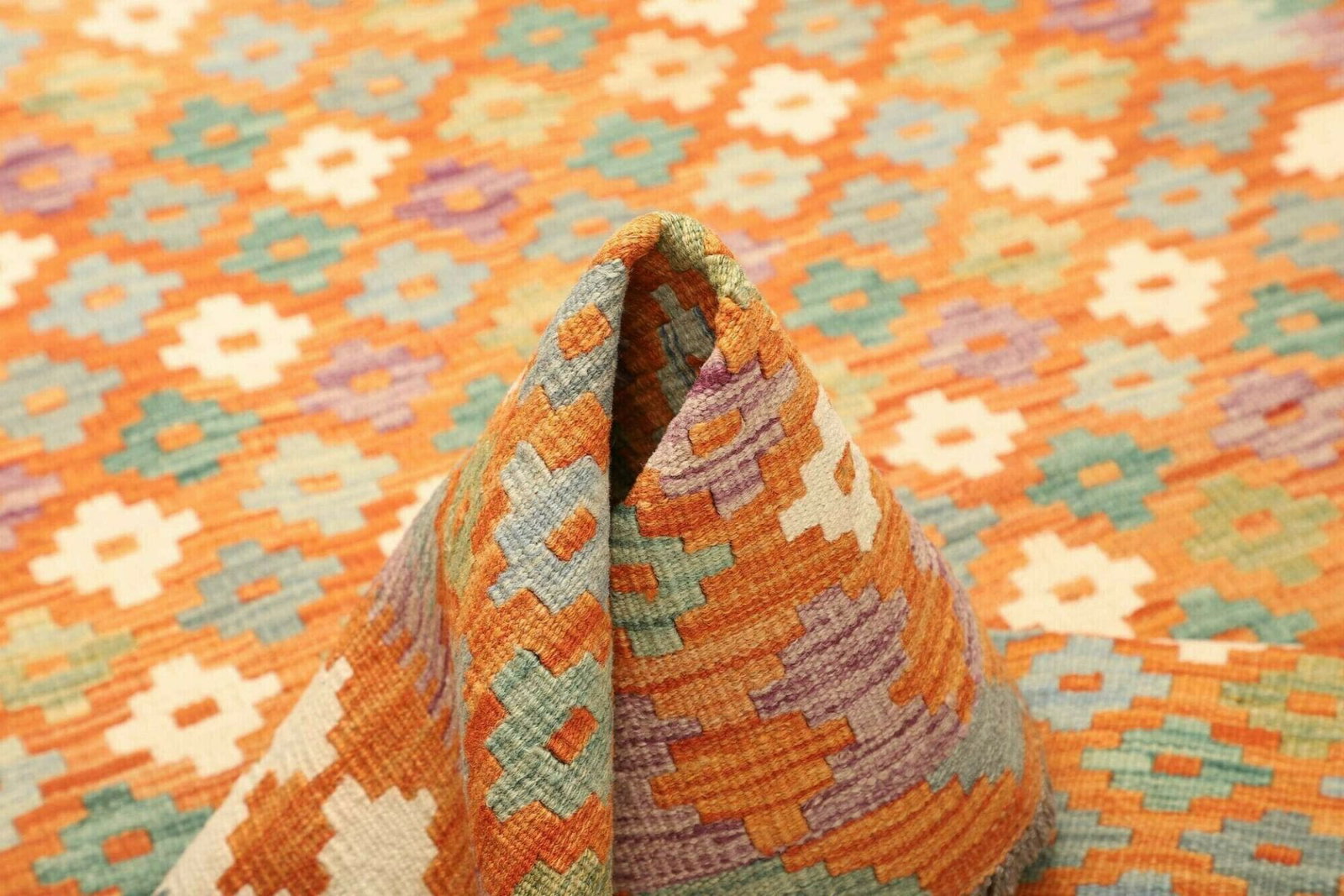 Die Pflege unseres Kelim Teppichs ist ebenfalls unkompliziert, da die Schurwolle von Natur aus schmutzabweisend ist. Eine regelmäßige Reinigung und Pflege reichen aus, um die Schönheit des Teppichs über Jahre zu bewahren. Ob im Wohnzimmer, Schlafzimmer oder Flur – dieser Teppich passt sich farblich und stilistisch verschiedenen Raumsituationen an und bereichert Ihr Zuhause in jeder Hinsicht.