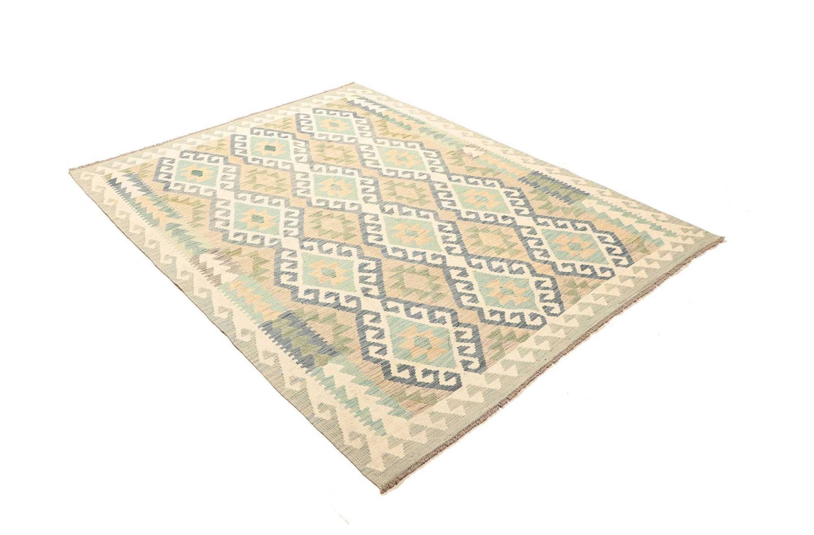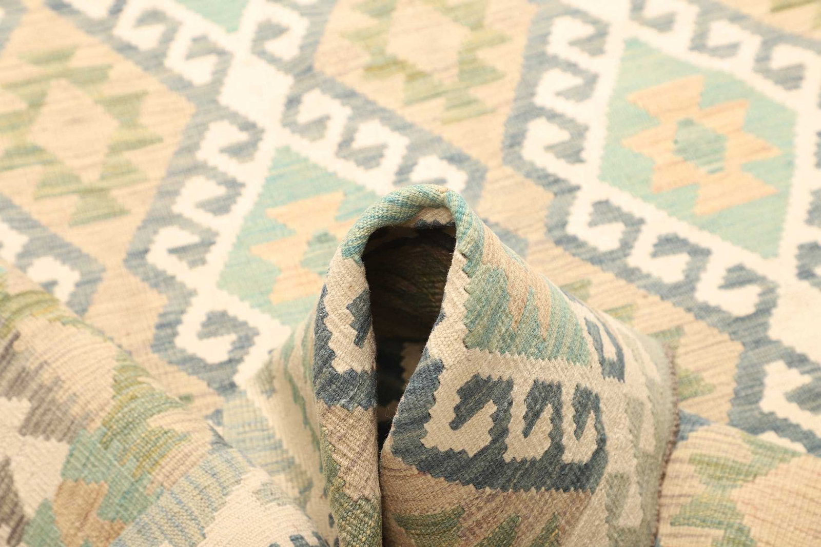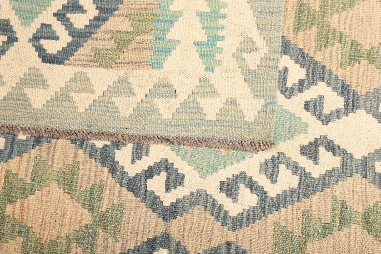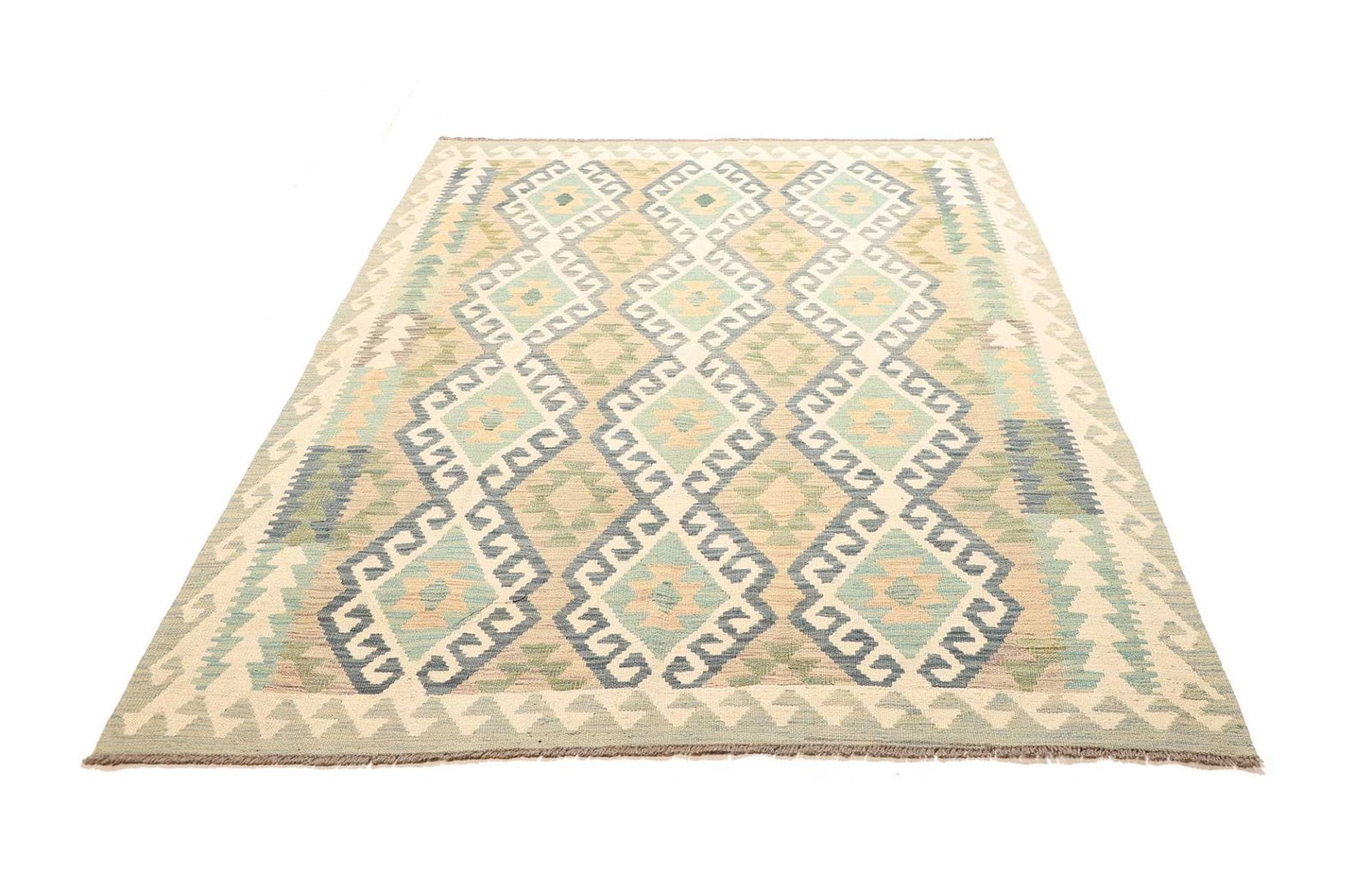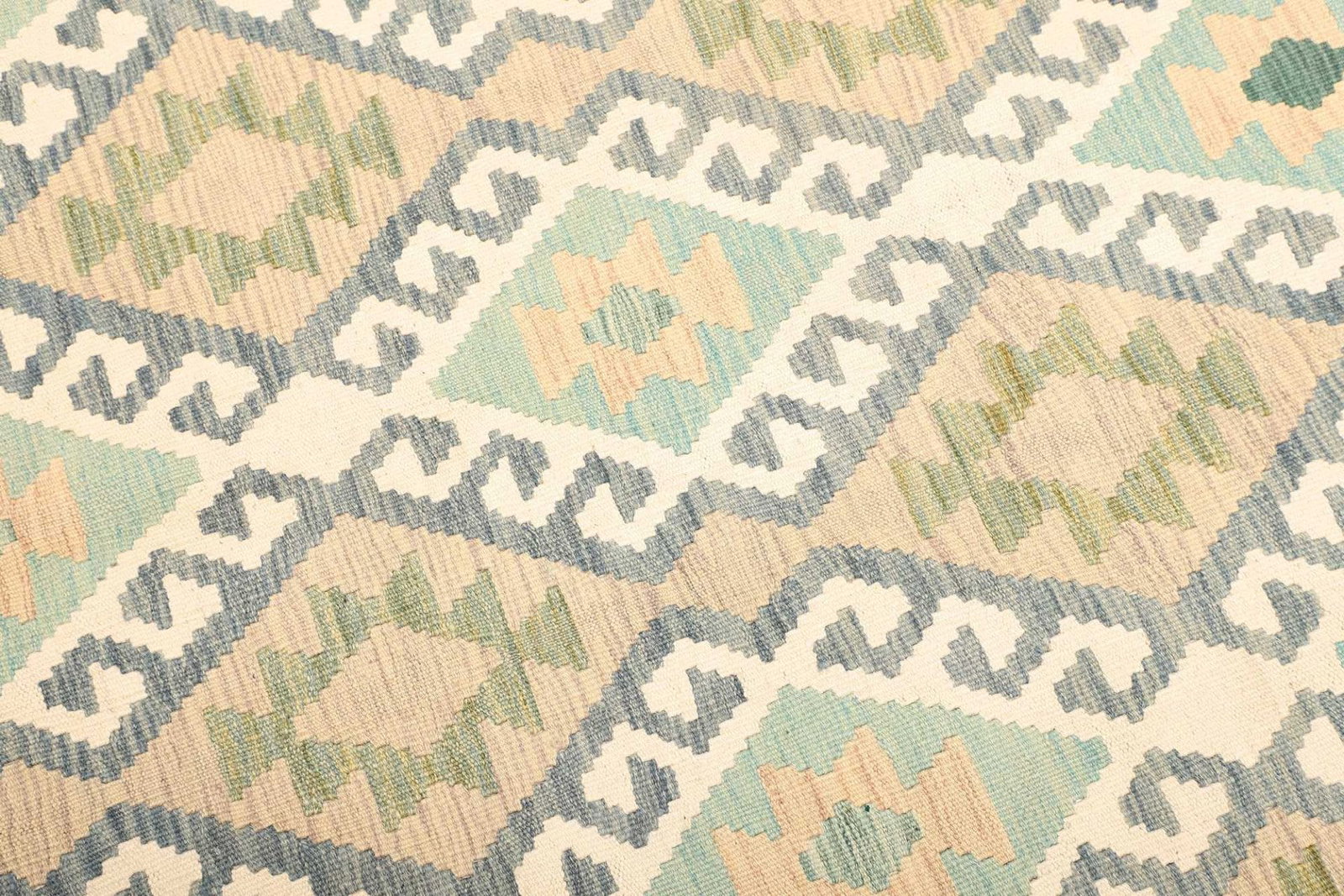 Der Kelim Teppich ist vollständig aus hochwertiger Wolle gefertigt, ein Material, das für seine Langlebigkeit und seinen Komfort bekannt ist. Wolle hat hervorragende isolierende Eigenschaften, die sowohl im Winter für Wärme als auch im Sommer für eine kühlende Wirkung sorgen. Die handgewebte Technik sorgt nicht nur für die Einzigartigkeit jedes Exemplars, sondern garantiert auch, dass der Teppich robust und pflegeleicht ist. Kelim Teppiche sind typischerweise flach gewebt, was ihnen eine besondere Leichtigkeit und Flexibilität verleiht, wodurch sie sich ideal für verschiedene Raumgestaltungen eignen.
