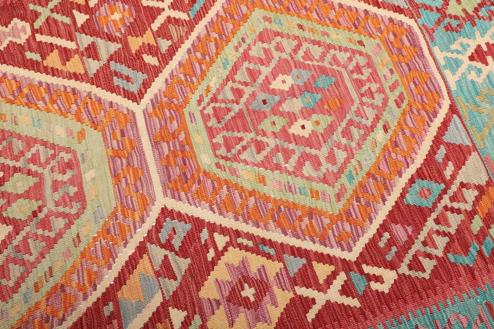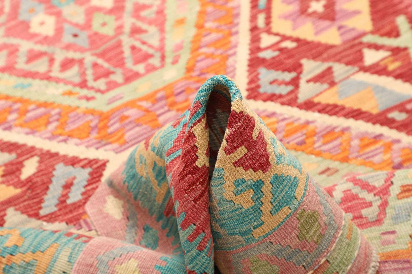 Der Teppich besteht aus 100% reiner Schurwolle, einem Material, das seit Jahrhunderten für seine Langlebigkeit und Pflegeleichtigkeit geschätzt wird. Schurwolle hat hervorragende isolierende Eigenschaften, die im Winter für Wärme und im Sommer für Kühle sorgen. Darüber hinaus ist Wolle von Natur aus schmutzabweisend und antistatisch, was bedeutet, dass Ihr Teppich auch nach vielen Jahren noch frisch und einladend wirkt. Die handgewebte Technik, die für diesen Kelim Teppich verwendet wird, erfordert viel Geschick und Geduld. Bei der Herstellung werden die Teppiche auf traditionellen Webstühlen von erfahrenen Handwerkern gewebt, die nicht nur ihre Fertigkeiten, sondern auch ihre kulturellen Wurzeln in das Produkt einfließen lassen.