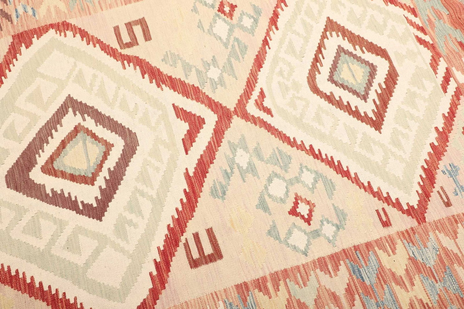 Ein besonderes Merkmal des Kelim Teppichs ist seine Vielseitigkeit. Da er flach gewebt und nicht aufwendig geknotet ist, ist er leicht, was ihn ideal für verschiedene Einsatzzwecke macht. Darüber hinaus kann der Teppich sowohl für den Innen- als auch für den Außenbereich verwendet werden, ohne dass seine Qualität leidet. Die Farben bleiben durch die Verwendung von qualitativ hochwertiger Wolle auch nach Jahren intensiv und frisch. Der handgewebte Teppich beeindruckt nicht nur durch seine Ästhetik, sondern auch durch seine Funktionalität, da er schadstofffrei und hypoallergen ist.