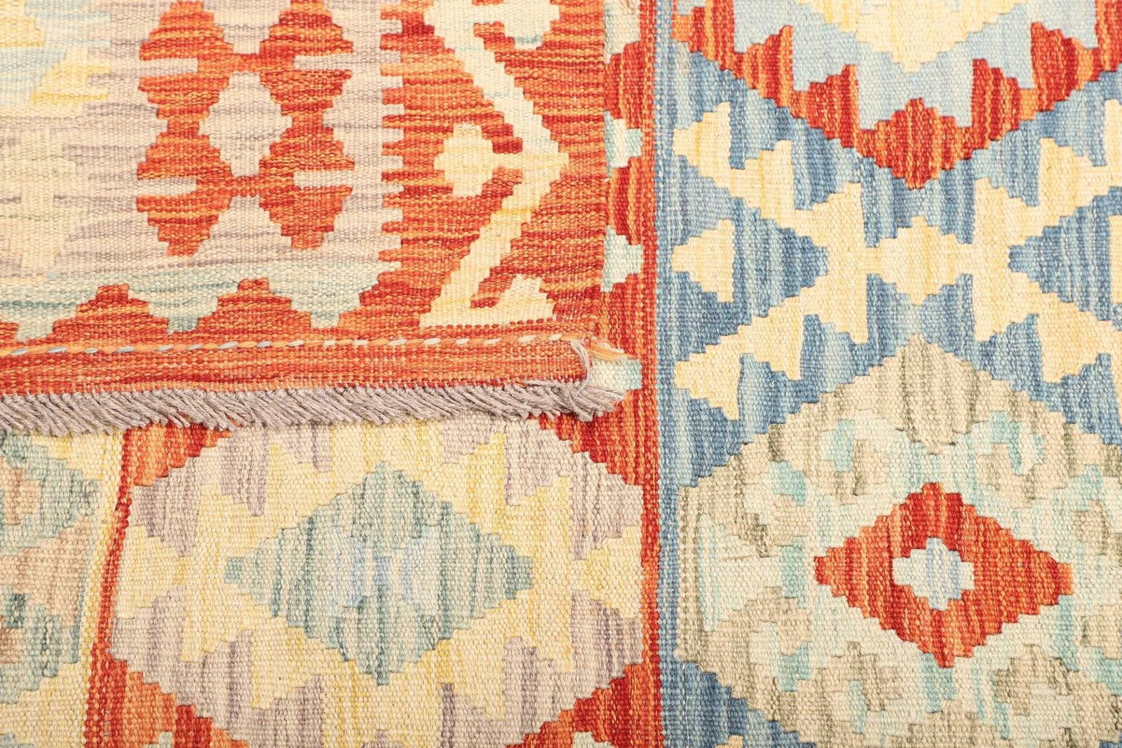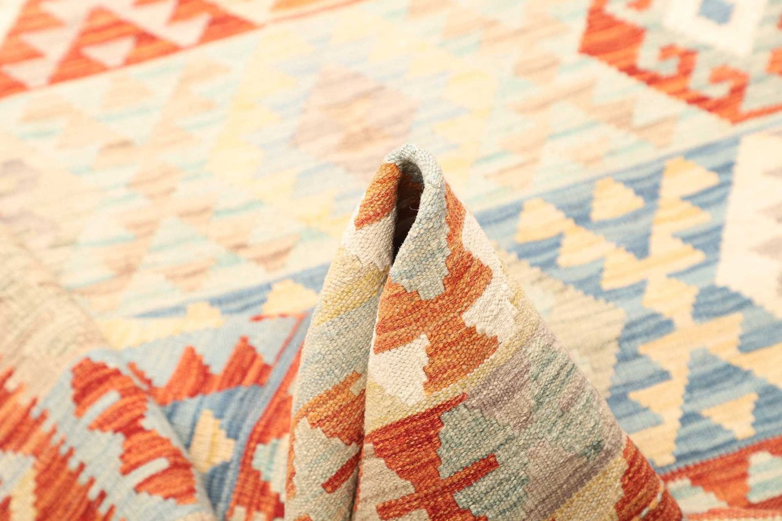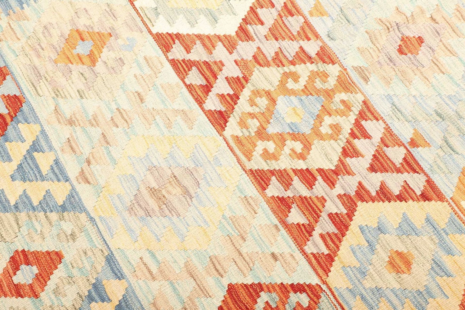 Der Kelim Teppich besticht durch seine traditionellen geometrischen Muster, die typisch für die afghanische Webkunst sind. Die Kombination aus kräftigen Farben und lebendigen Mustern funktioniert gut mit verschiedenen Einrichtungsstilen und schafft eine harmonische Atmosphäre. Jedes Stück erzählt seine eigene Geschichte und verleiht Ihrem Raum eine warme und einladende Note. Die Muster sind oft inspiriert von der Natur und symbolisieren Elemente wie Fruchtbarkeit, Wohlstand und Gastfreundschaft. Diese geschichtlichen und kulturellen Bezüge machen jeden Teppich zu einem besonderen Kunstwerk.