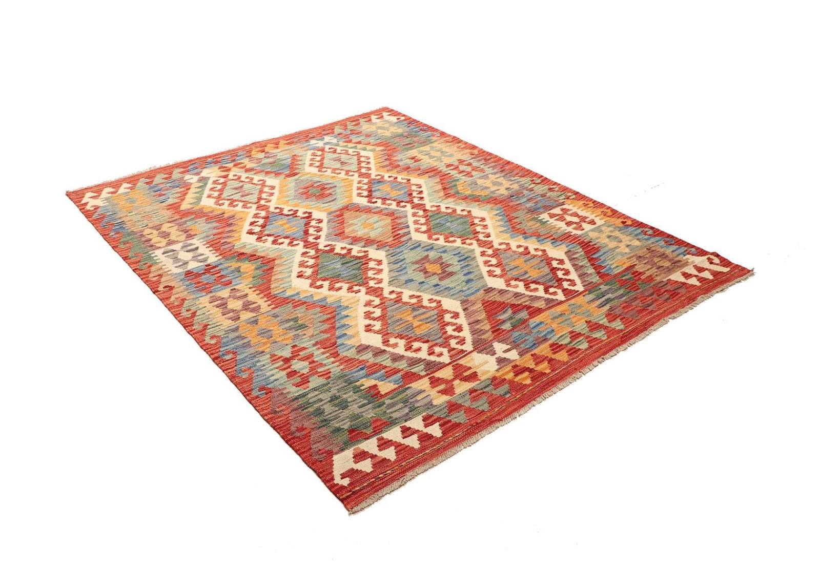 Kelim Teppich | Größe: 160 x 192 cm | Knotendichte: ca. 200.000 Knoten/m² | Flor: 100% Schurwolle | Kette: 100% Baumwolle | Herkunft: Pakistan | Verarbeitung: Handgewebt | Höhe: ca. 5 mm | Ideal für moderne und rustikale Einrichtungsstile