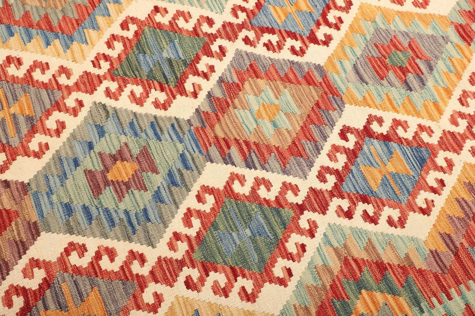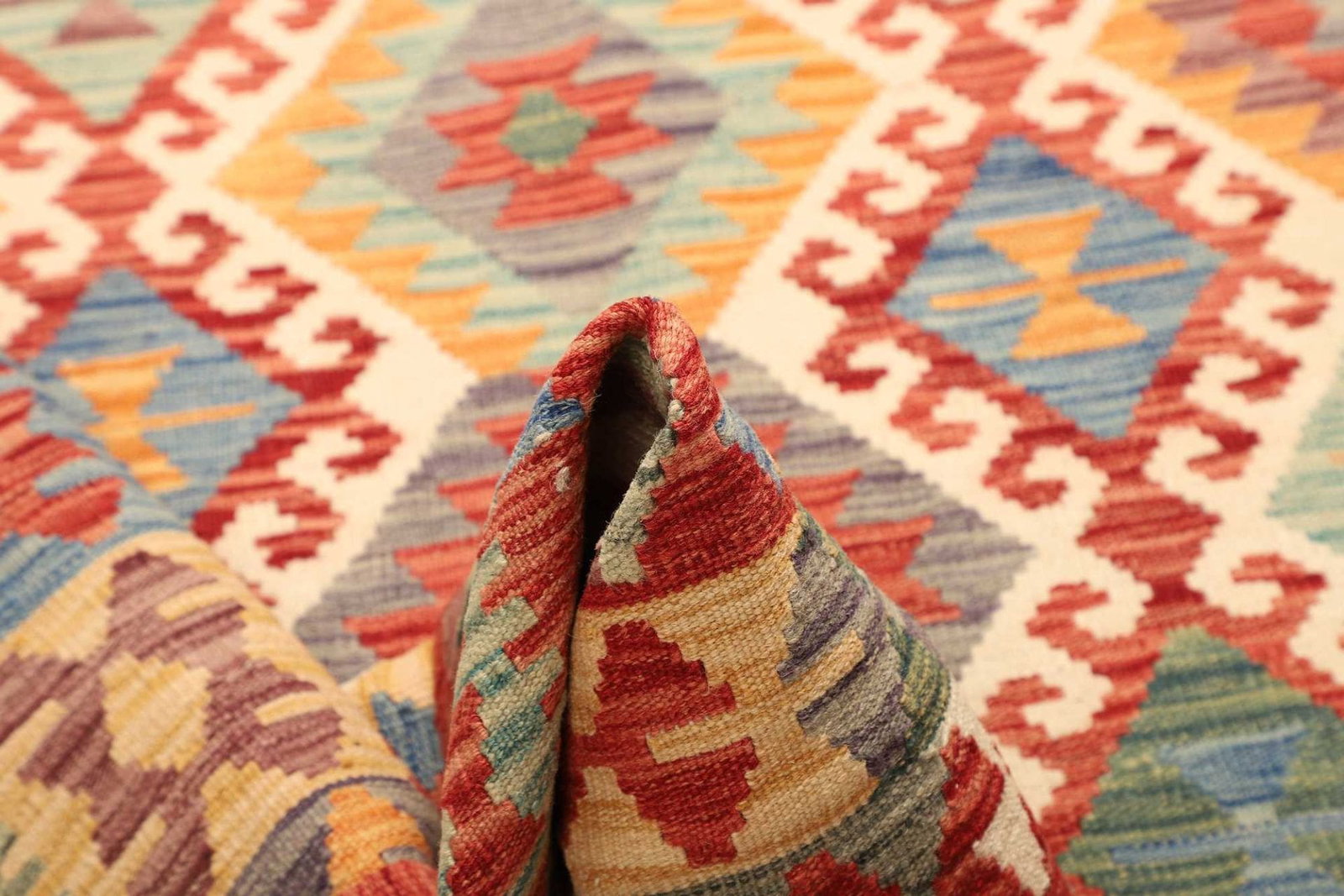Dieser Kelim Teppich besteht aus 100% Schurwolle, einem Material, das für seine Robustheit und natürliche Schönheit bekannt ist. Schurwolle ist nicht nur sehr weich und angenehm zu begehen, sondern hat auch die wunderbare Eigenschaft, das Raumklima zu regulieren. Der Teppich ist handgewebt, was bedeutet, dass jedes Stück mit viel Liebe zum Detail hergestellt wurde. Diese traditionelle Technik garantiert eine hohe Knotendichte, was ihm eine beeindruckende Langlebigkeit verleiht und die Farben und Muster lebendig hält, auch nach Jahren der Nutzung.