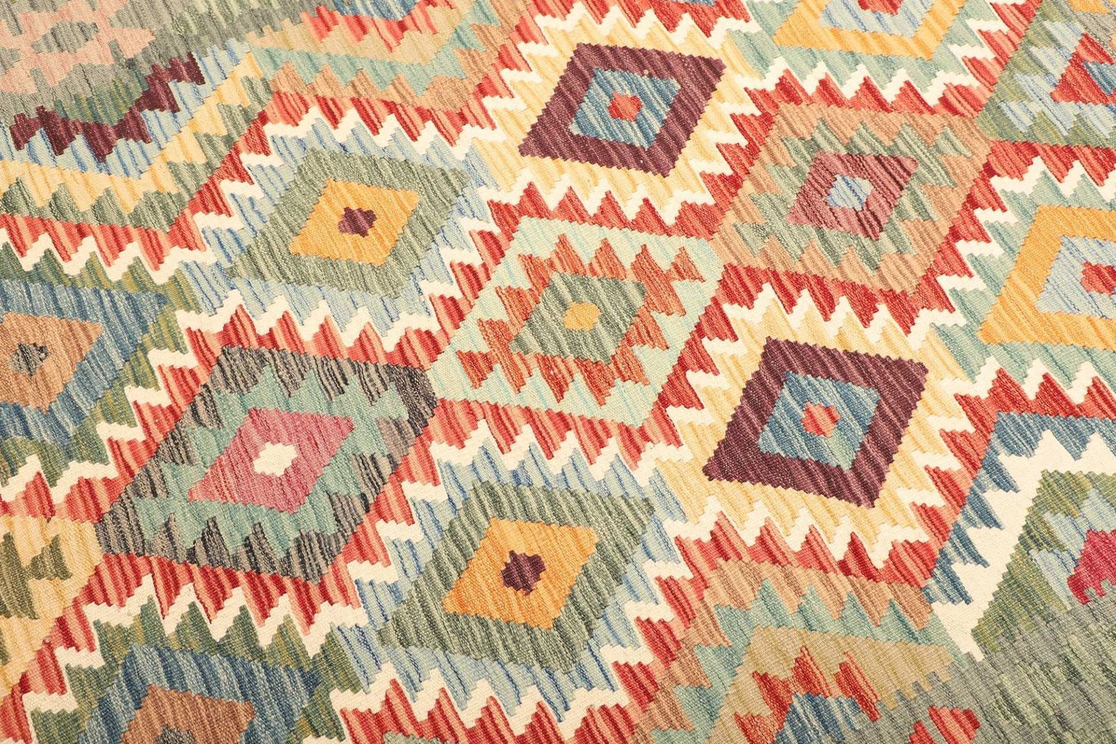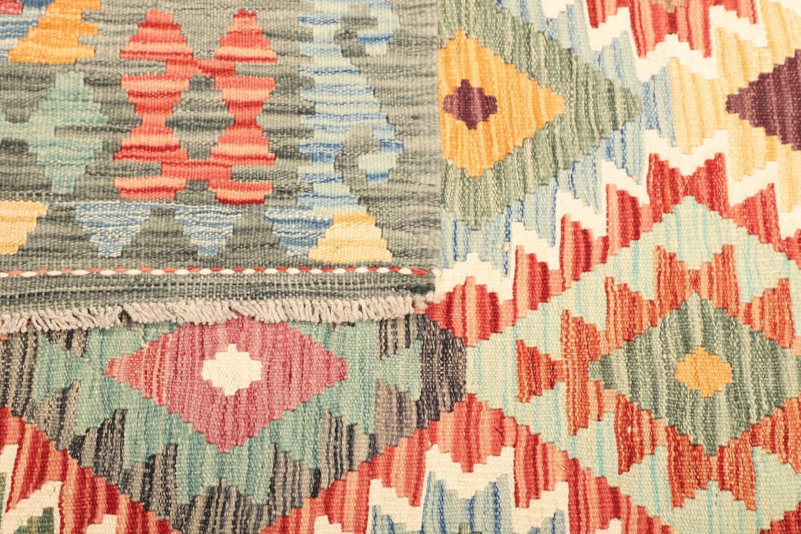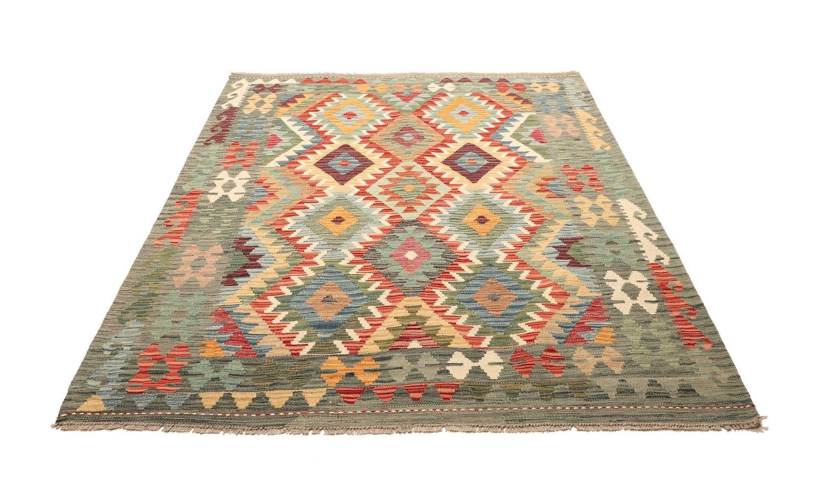 Handgewebter Kelim aus Pakistan | Knotendichte: ca. 200.000 Knoten/m² | Flor: 100% Schurwolle | Kette: 100% Baumwolle | Größe: 160×195 cm | Höhe: ca. 5 mm | Zustand: Handgewebte Qualität | Provenienz: Kelim | Rustikales Flair für moderne Einrichtungen