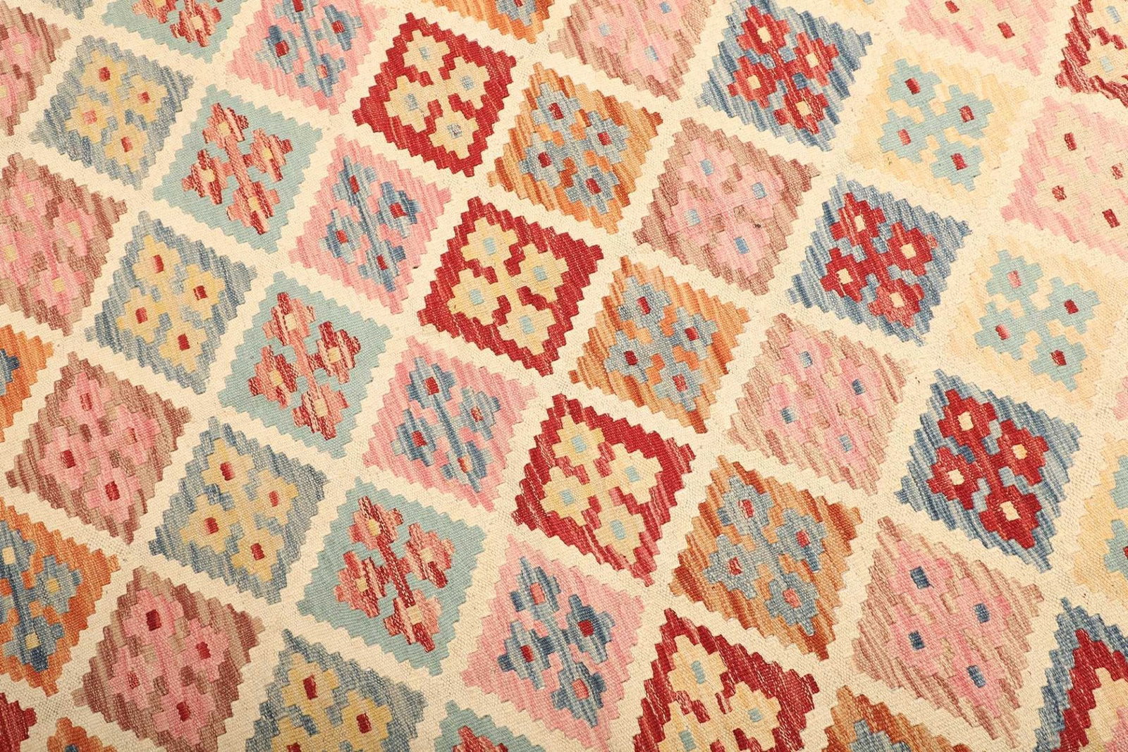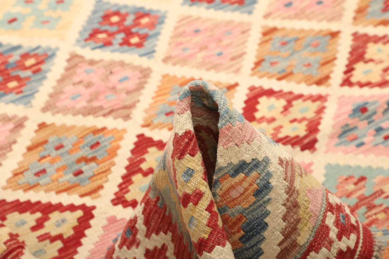 Ein besonderes Merkmal dieses handgewebten Kelim Teppichs ist seine Vielseitigkeit. Er lässt sich nicht nur als Bodenbelag verwenden, sondern kann auch als Wandbehang oder Tischdecke dienen. Durch seine robuste Beschaffenheit ist er für den täglichen Gebrauch geeignet und bleibt auch bei intensiver Beanspruchung in einem hervorragenden Zustand.