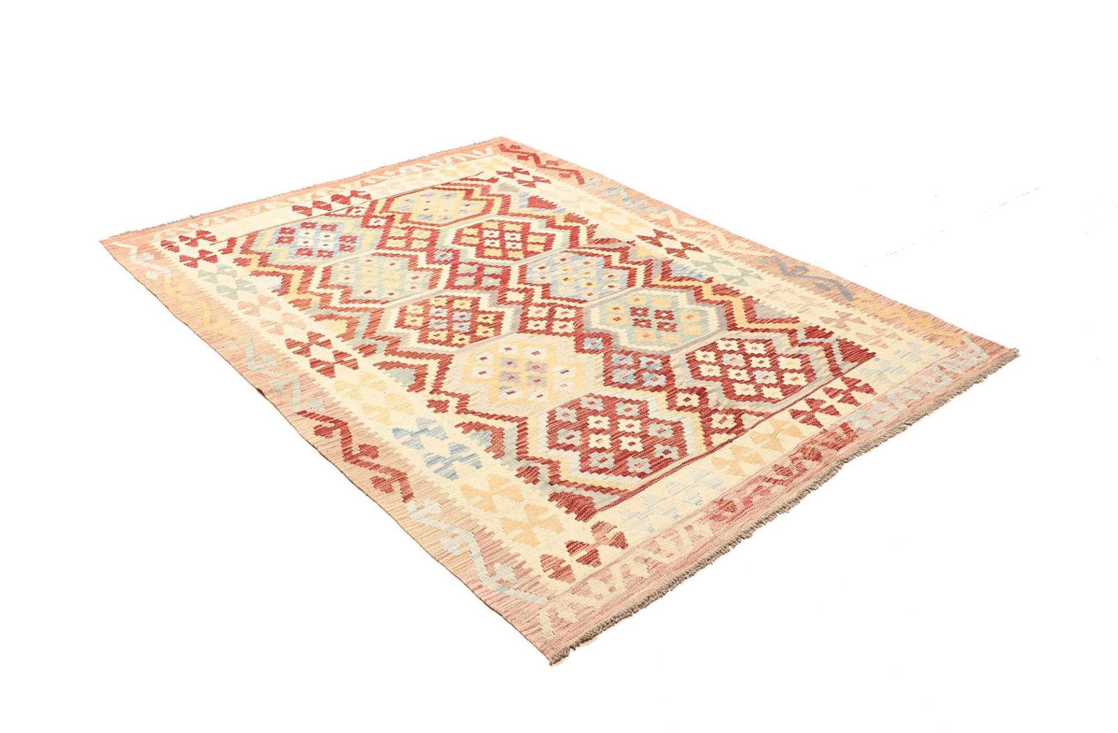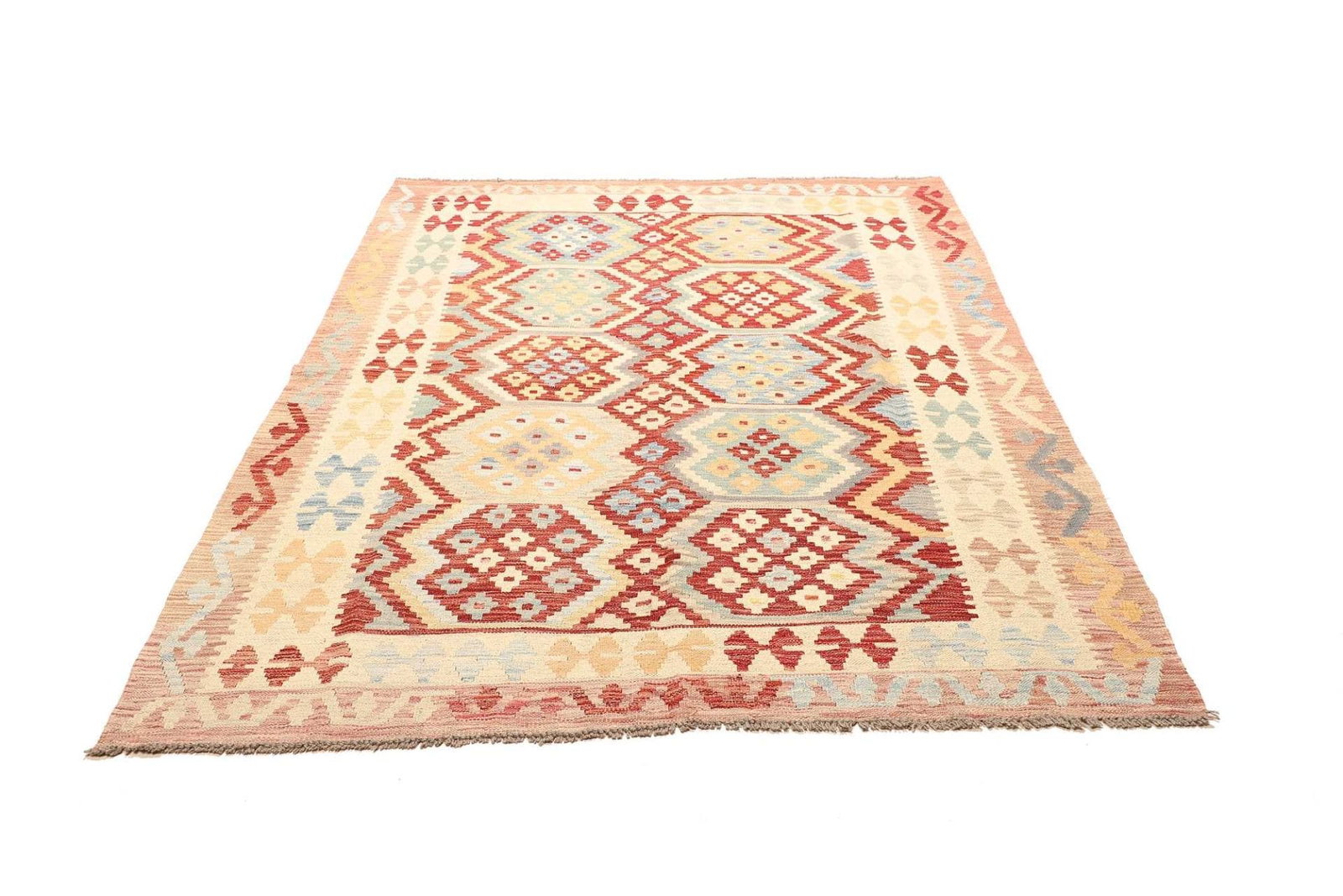Kelim Teppich | Knotendichte: ca. 200.000 Knoten/m² | Material: 100% Schurwolle (Flor), 100% Baumwolle (Kette) | Größe: 161 x 212 cm | In gutem Zustand | Herkunft: Pakistan | Handgewebte Qualität mit rustikalem Flair