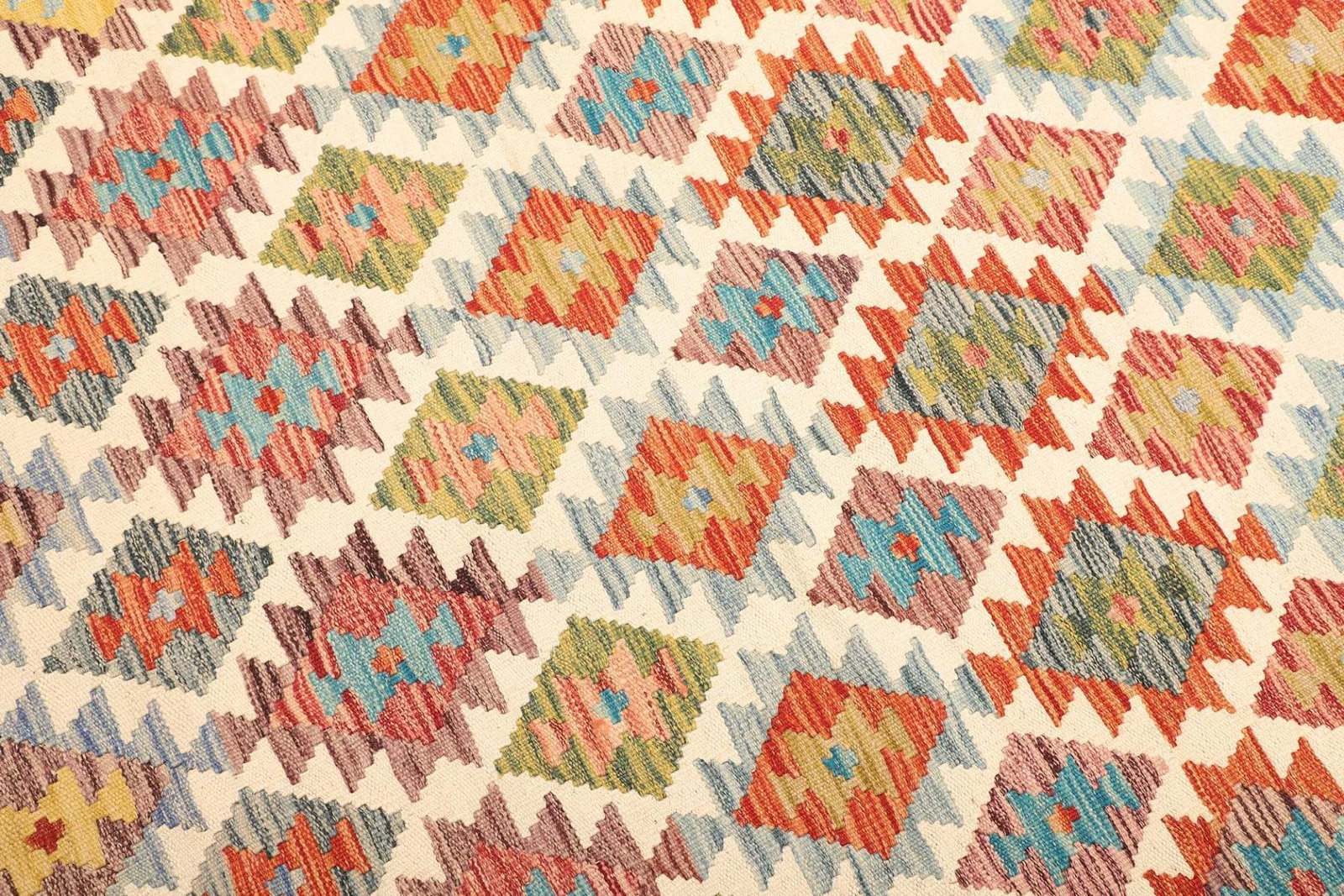 Der Kelim Teppich besticht durch ein einprägsames Muster, das mit lebendigen Farben und geometrischen Formen gestaltet ist. Die geometrischen Designs sind typisch für das Kelim-Handwerk und zielen darauf ab, Harmonie und Balance in den Raum zu bringen. Diese Muster sind nicht nur ästhetisch ansprechend, sondern haben oft auch tiefere Bedeutungen und Geschichten, die von Generation zu Generation weitergegeben werden.