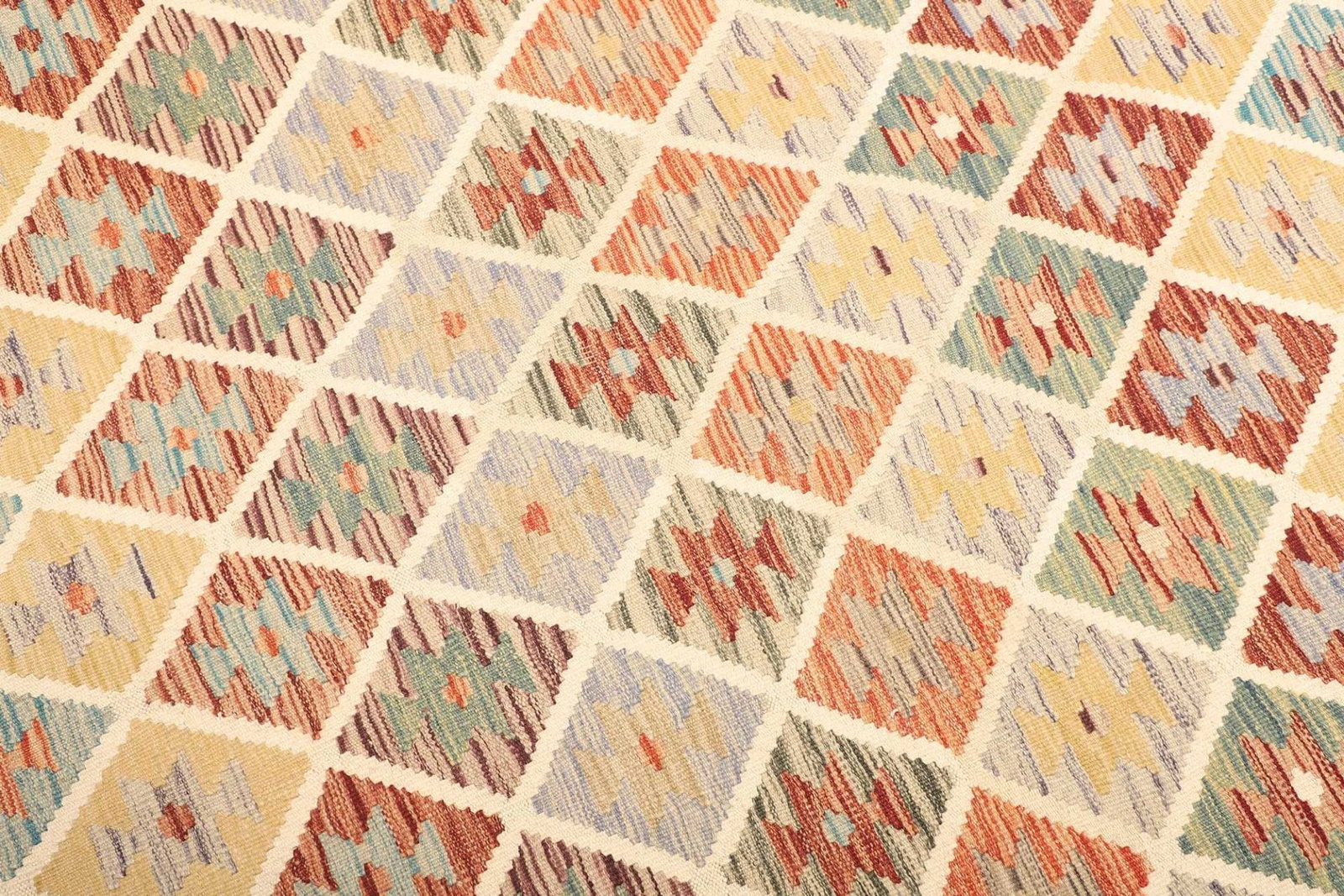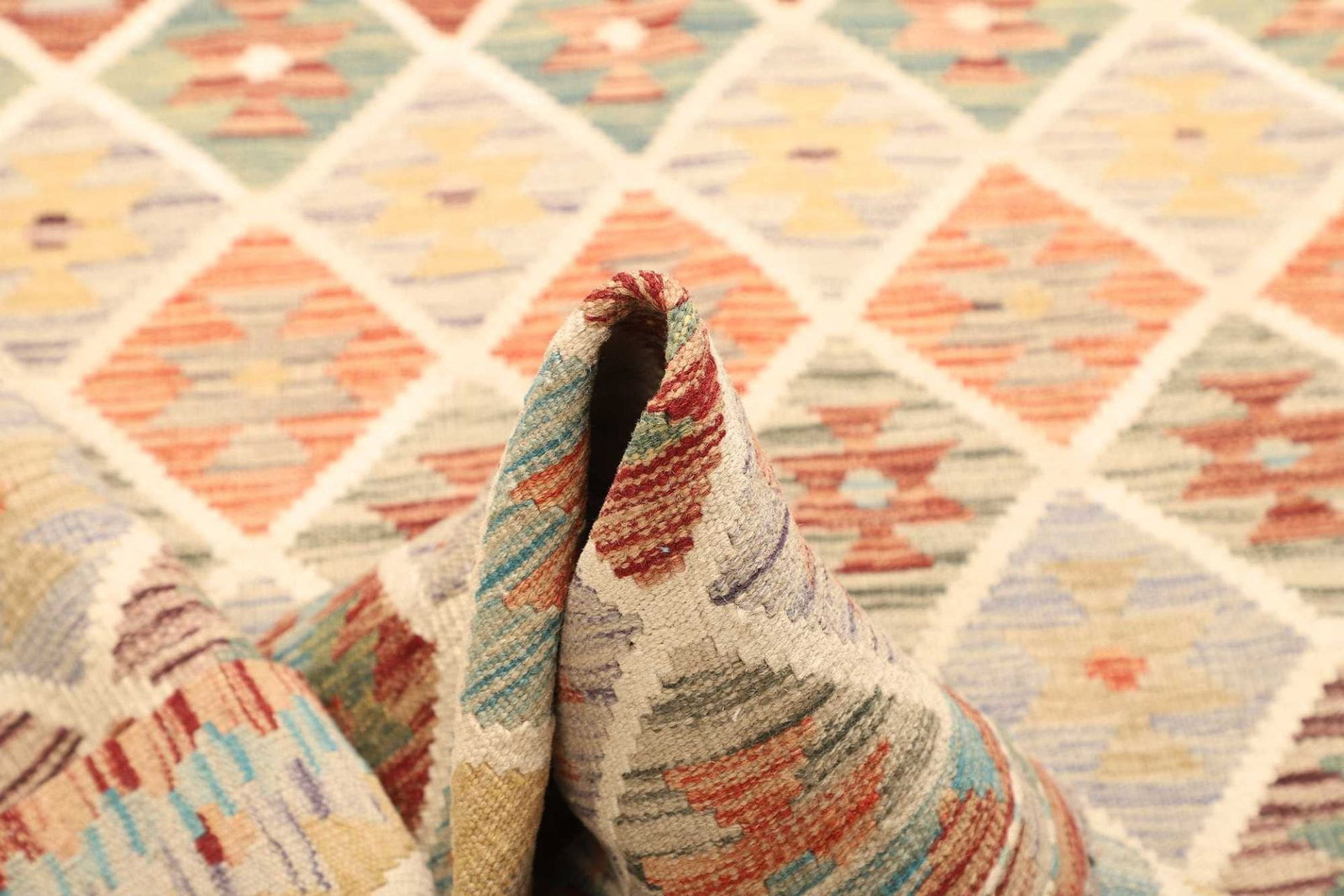 Der Kelim Teppich ist aus hochwertiger Wolle gefertigt, einem Material, das für seine Robustheit und Langlebigkeit bekannt ist. Wolle bietet zahlreiche Vorteile, darunter gute Isolierung und eine natürliche Schmutzabweisung. Die handgewebte Technik sorgt dafür, dass jeder Teppich ein Unikat ist, das sorgfältig von erfahrenen Kunsthandwerkern hergestellt wird. Bei der Herstellung werden traditionelle Webtechniken verwendet, die über Generationen hinweg überliefert wurden. Diese Technik verleiht dem Teppich nicht nur seine charakteristische Struktur, sondern auch eine besondere visuelle Tiefe, die in Kombination mit den verwendeten Farben und Mustern zur Geltung kommt. Die Knotendichte ist ideal, um die Strapazierfähigkeit zu gewährleisten und gleichzeitig einen weichen, einladenden Teppich zu schaffen.