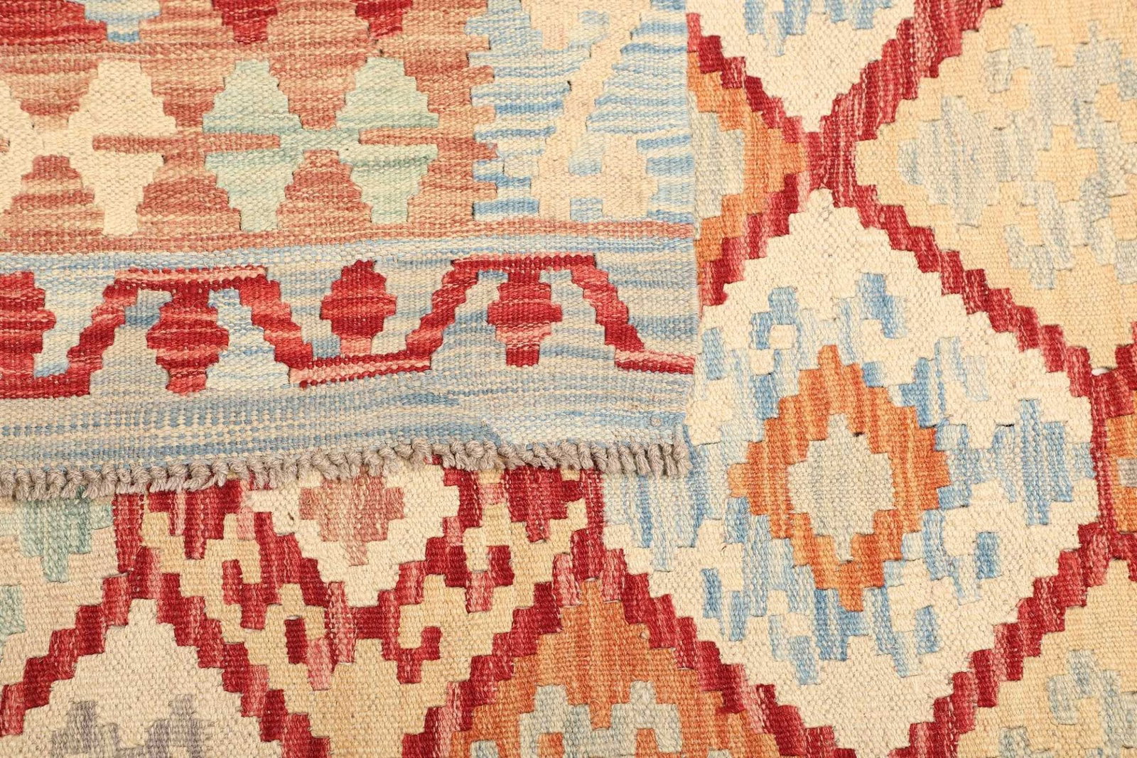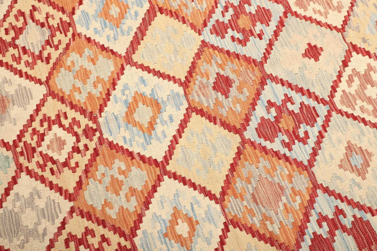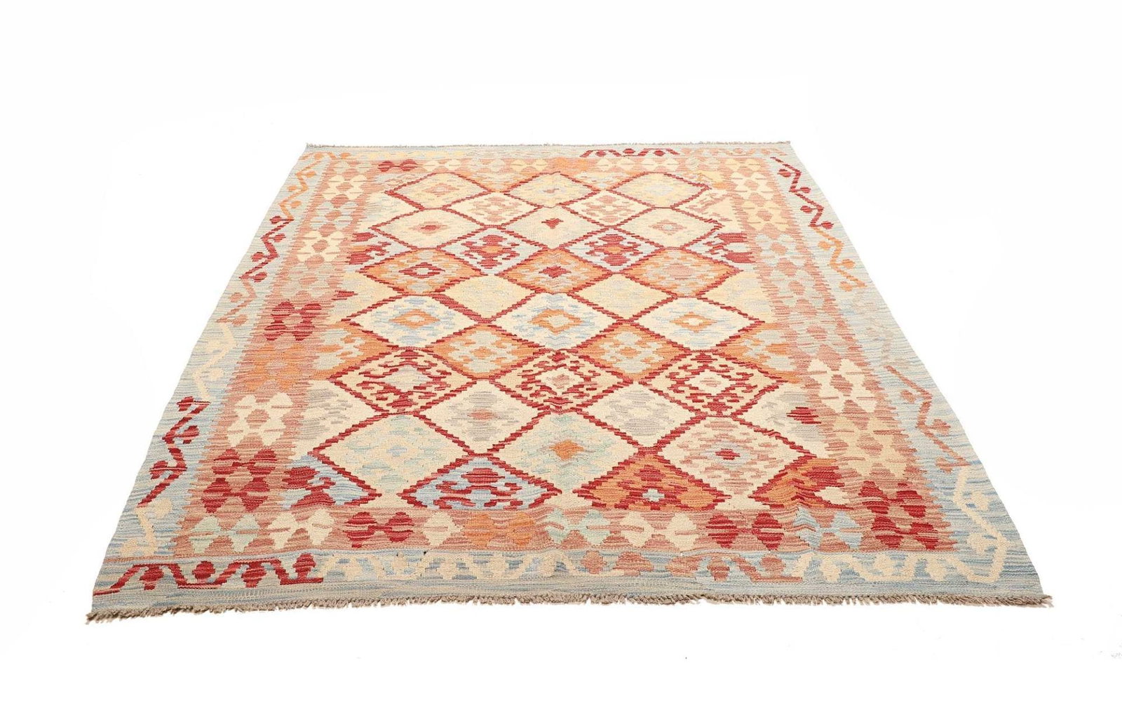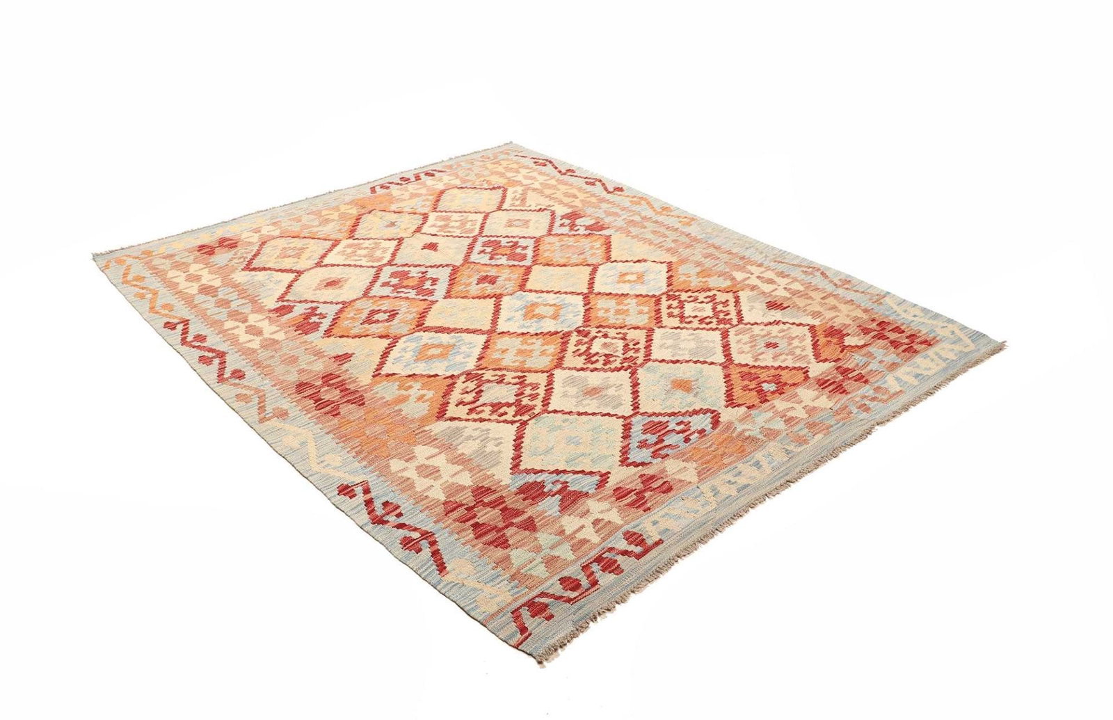 Kelim Teppich | Knotendichte: ca. 200.000 Knoten/m² | Material: 100% Schurwolle (Flor), 100% Baumwolle (Kette) | Größe: 168 x 198 cm | Verarbeitung: Handgewebt | Herkunft: Pakistan | Höhe: ca. 5 mm | Vielseitig einsetzbar als Teppich, Vorhang oder Wandschmuck