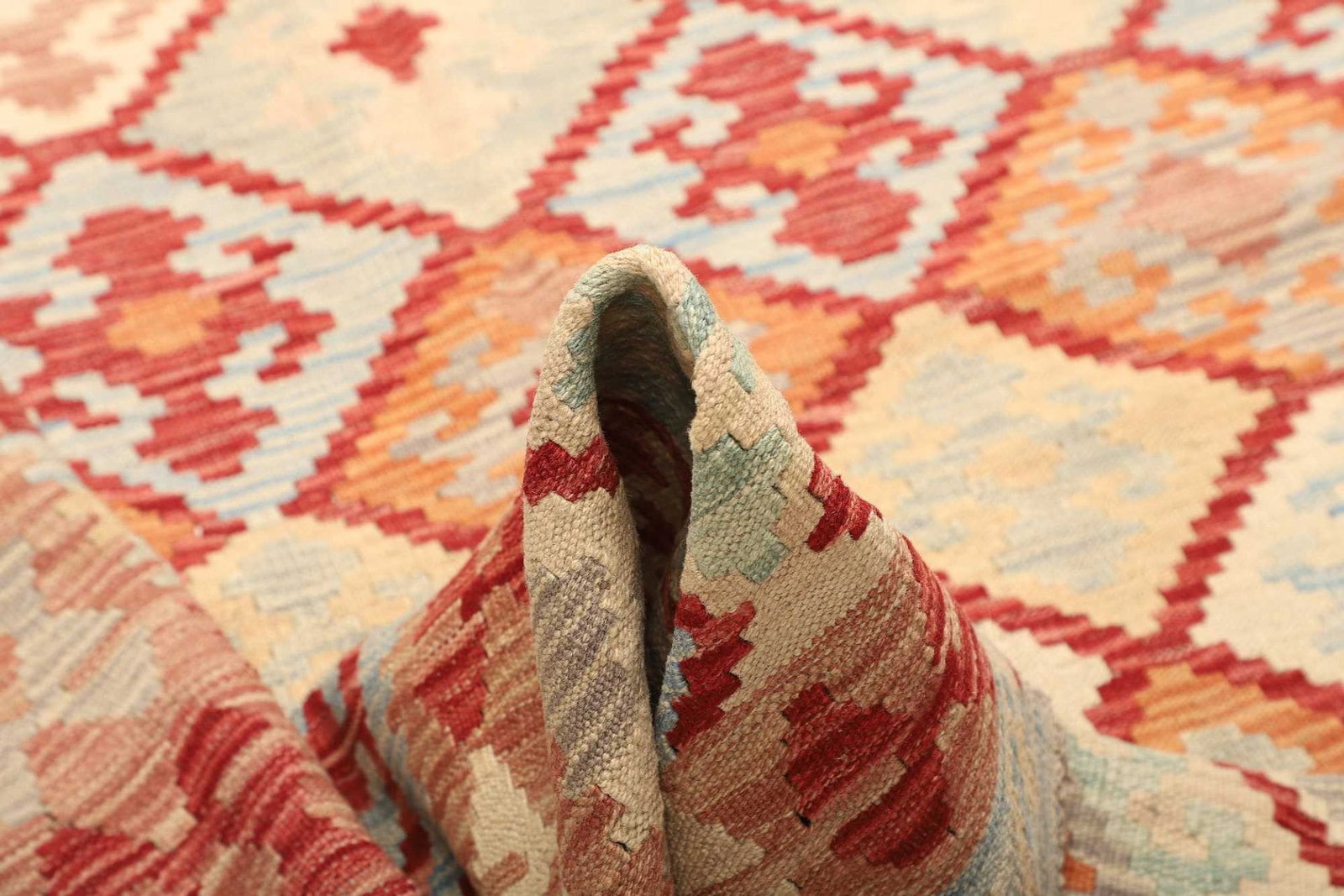 Der Kelim Teppich ist aus hochwertigen, natürlichen Materialien gefertigt, die für ihre Langlebigkeit und Strapazierfähigkeit bekannt sind. Durch die Verwendung von reiner Wolle entsteht ein angenehm weicher und gleichzeitig robuster Teppich, der sowohl für Wohnräume als auch für Eingangsbereiche geeignet ist. Die handgewebte Technik verleiht dem Teppich eine bemerkenswerte Struktur und unterscheidet ihn von industriell gefertigten Teppichen. Die Knotendichte dieses Teppichs ist ein Zeichen für die gute Verarbeitung, die notwendig ist, um die klassischen Muster und das rustikale Flair zu erzeugen.
