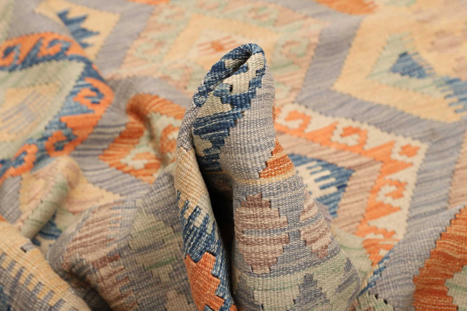 Ein weiterer Vorteil des Kelim Teppichs ist seine Pflegeleichtigkeit. Die Schurwolle ist schmutzabweisend und kann einfach gereinigt werden, was ihn ideal für Haushalte mit Kindern oder Haustieren macht. Darüber hinaus trägt der handgewebte Teppich dazu bei, ein gesundes Raumklima zu fördern, da Wolle von Natur aus hypoallergen ist und Feuchtigkeit regulieren kann.