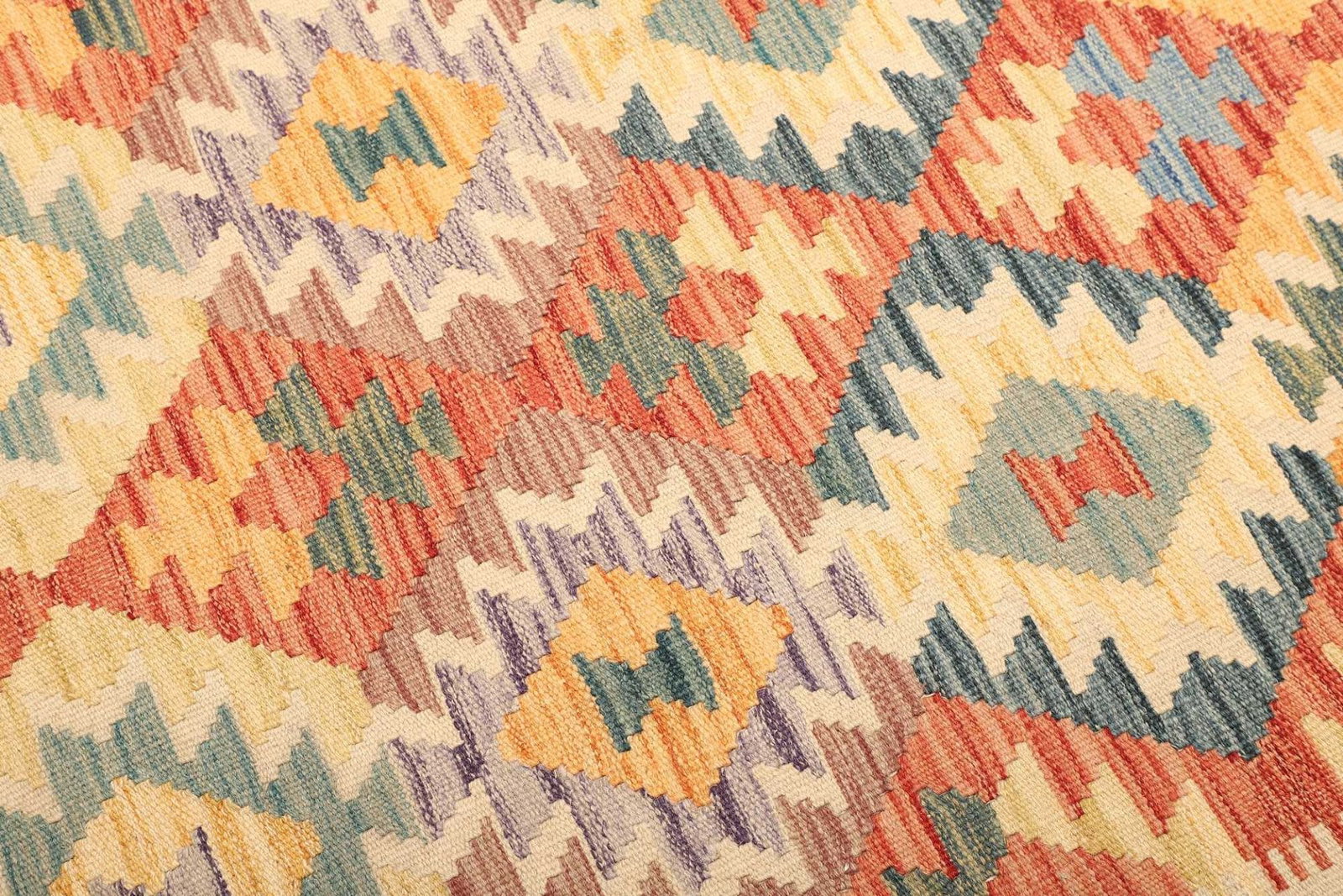 Hergestellt aus hochwertigen, natürlichen Materialien bietet dieser Kelim Teppich sowohl Robustheit als auch Komfort. Die Verwendung von reiner Wolle, die bekannt für ihre Weichheit und Strapazierfähigkeit ist, gewährleistet, dass der Teppich nicht nur ästhetisch ansprechend, sondern auch langlebig ist. Die handgewebte Technik verstärkt die Exklusivität und Individualität jedes Teppichs, da kein Stück exakt gleich ist. Jedes Detail wird mit Sorgfalt und Liebe zum Handwerk verarbeitet, sodass Sie einen authentischen und besonderen Teppich in Ihrer Wohnung haben.