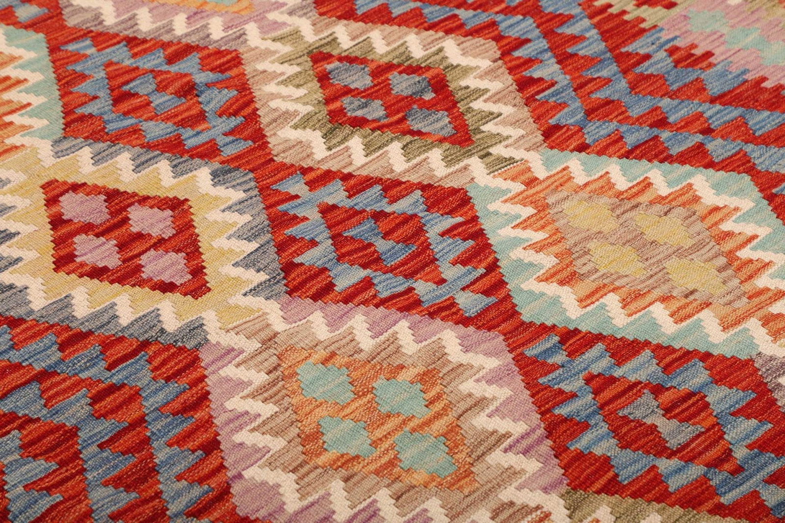 Unser Kelim Teppich wird aus 100 % Schurwolle hergestellt, einem der geschätztesten Materialien in der Teppichherstellung. Schurwolle ist bekannt für ihre Langlebigkeit, Strapazierfähigkeit und natürliche Wärme. Der Teppich ist nicht nur weich und angenehm im Gefühl, sondern sorgt auch für eine angenehme Atmosphäre in Ihrem Zuhause. Die handgewebte Technik verleiht ihm zudem eine einzigartige Textur und einen individuellen Charakter. Die Verwendung von Schurwolle erlaubt es zudem, die Farben besonders lebendig und strahlend zu halten, was eine langfristige Freude an diesem Kunstwerk gewährleistet.