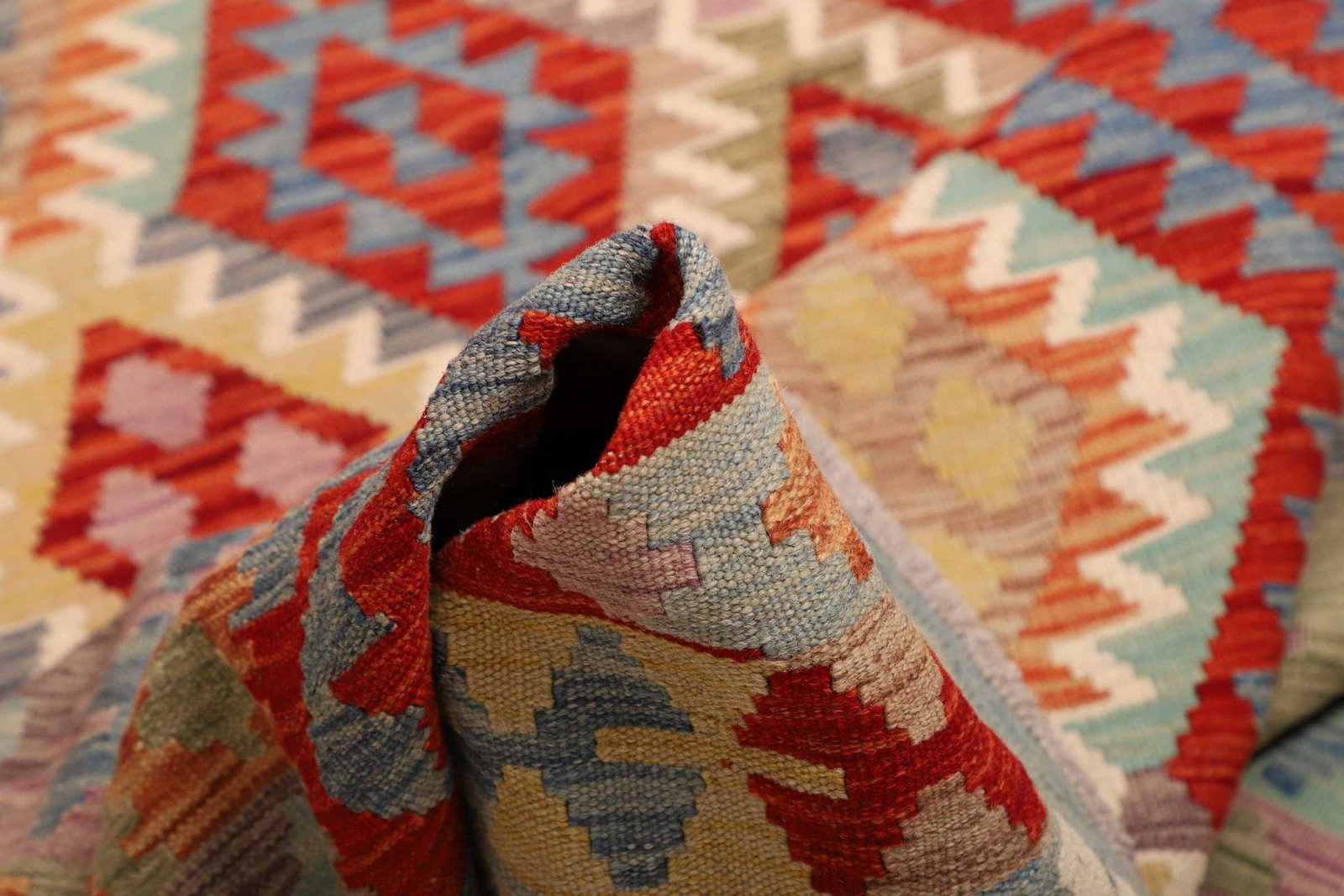Ein wesentliches Merkmal dieses Kelim Teppichs ist seine handgewebte Konstruktion. Anders als maschinell hergestellte Teppiche besitzt er einen unvergleichlichen Charakter und eine Wärme, die den Raum sofort belebt. Die Knotendichte und die hohe Verarbeitungsqualität garantieren, dass der Teppich nicht nur optisch ansprechend ist, sondern auch eine lange Lebensdauer hat. Er ist leicht zu reinigen und pflegeleicht, was ihn zu einem idealen Begleiter in Ihrem Zuhause macht.