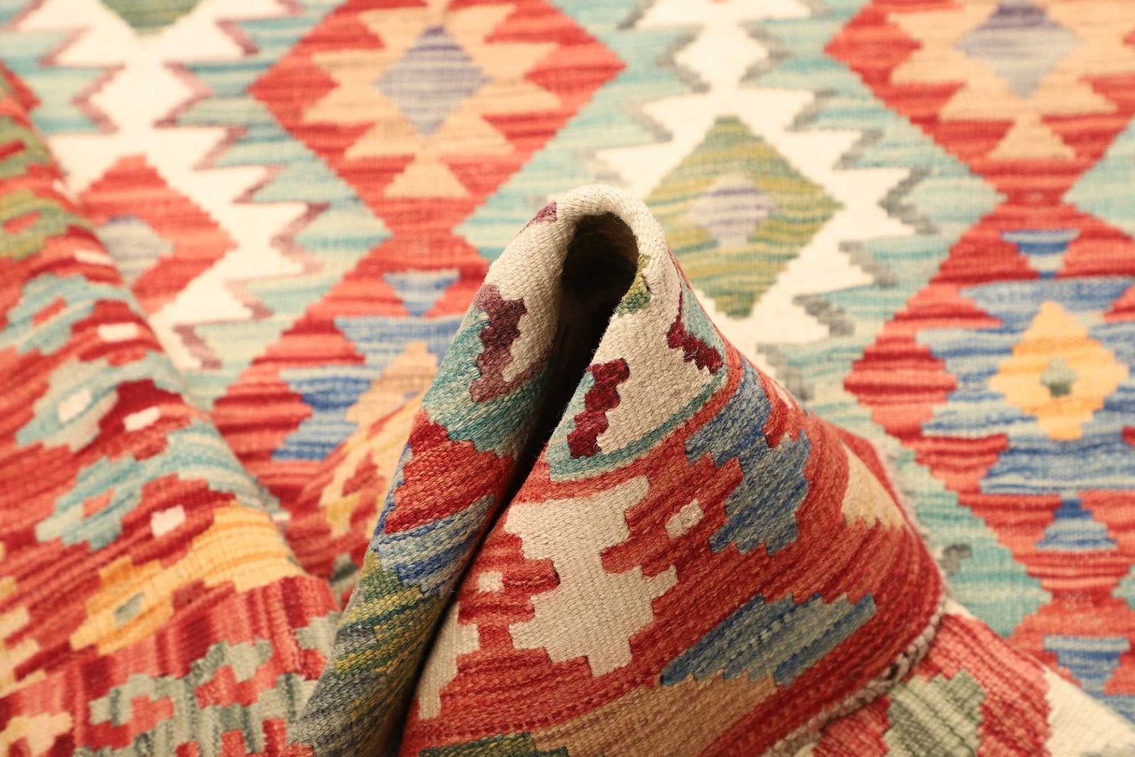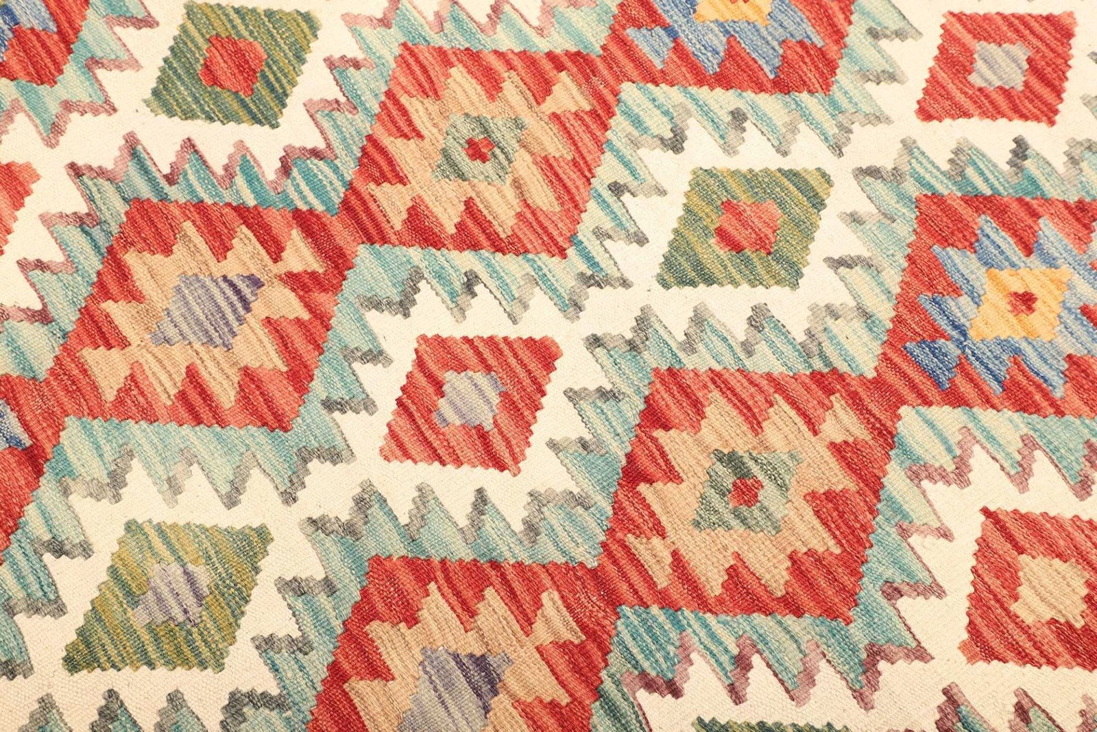 Der Kelim Teppich wird aus hochwertigen natürlichen Materialien gefertigt. Typischerweise wird Wolle verwendet, die nicht nur langlebig, sondern auch pflegeleicht ist. Wolle hat zudem den Vorteil, dass sie Feuchtigkeit reguliert und somit für ein angenehmes Raumklima sorgt. Bei der handgewebten Technik werden die Garne ohne Knotung zu einem dichten Gewebe verarbeitet. Diese Fertigungsmethode verleiht den Teppichen eine besondere Stabilität und ist gleichzeitig ein Zeichen für die hohe Handwerkskunst der Teppichweber. Die spezielle Webart sorgt für eine flache Oberfläche, die sich nicht nur gut anfühlt, sondern auch sehr stilvoll aussieht.