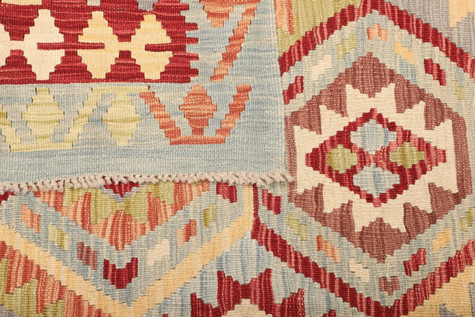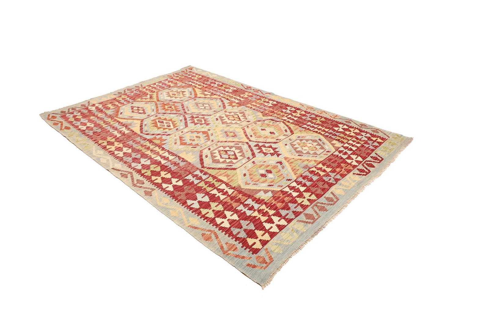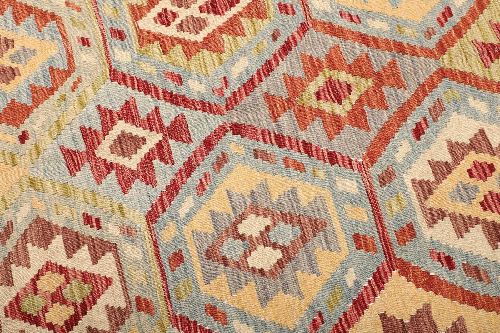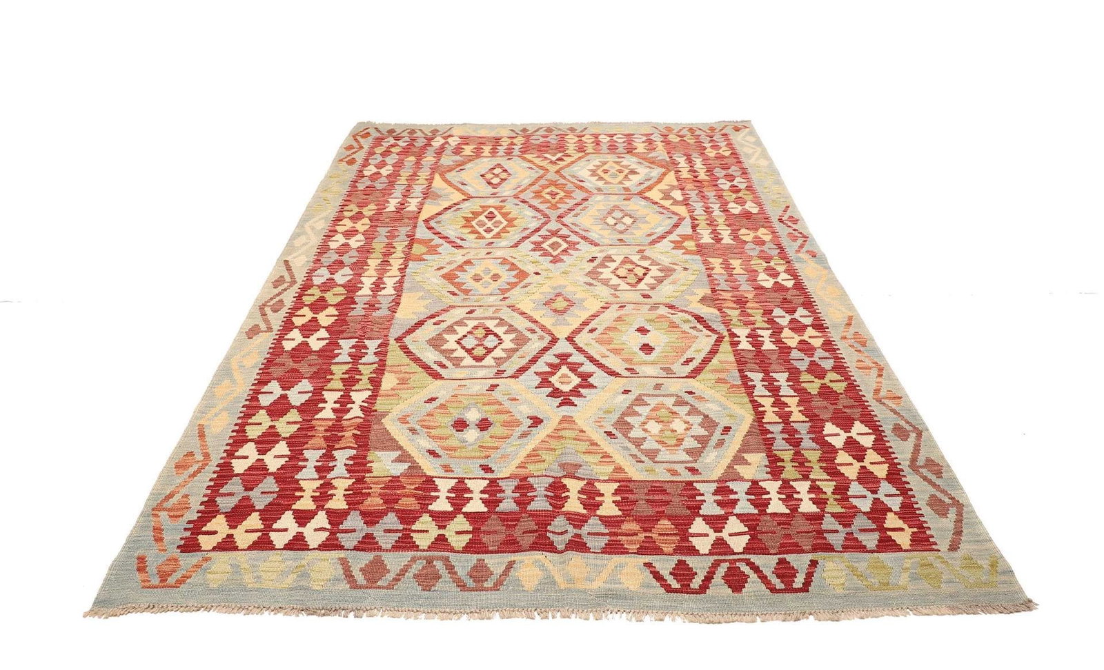 Kelim Teppich | Größe: 174 x 242 cm | Knotendichte: ca. 200.000 Knoten/m² | Flor: 100% Schurwolle | Kette: 100% Baumwolle | Herkunft: Pakistan | Verarbeitung: Handgewebt | Höhe: ca. 5 mm | Rustikales Flair, ideal für moderne Wohnräume