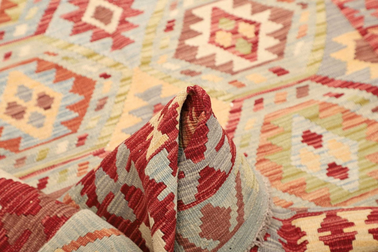 Die handgewebte Technik verleiht dem Teppich seine besondere Note und unterscheidet ihn von maschinell gefertigten Produkten. Jeder Teppich ist ein Unikat, das die individuelle Geschicklichkeit des Kunsthandwerkers widerspiegelt. Das Weben von Kelim Teppichen erfolgt in einem aufwendigen manuellen Prozess, der viel Erfahrung und Geduld erfordert.