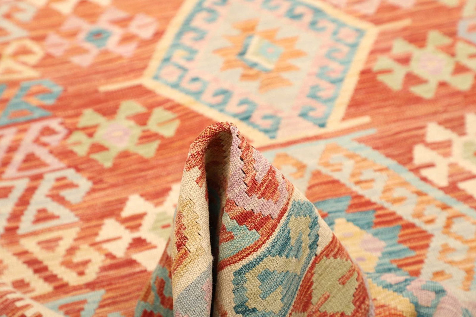 Ein herausragendes Merkmal dieses Kelim Teppichs ist seine Vielseitigkeit. Er eignet sich nicht nur für Wohnräume, sondern kann auch in Büros oder Geschäftsräumen eingesetzt werden, um eine warme und einladende Atmosphäre zu schaffen. Die flach gewebte Struktur macht den Teppich leicht zu handhaben und zu reinigen, was ihn zu einer praktischen Wahl für jeden Haushalt macht. Darüber hinaus sorgt die Verwendung von Naturfasern dafür, dass der Teppich atmet und somit ein angenehmes Raumklima unterstützt.