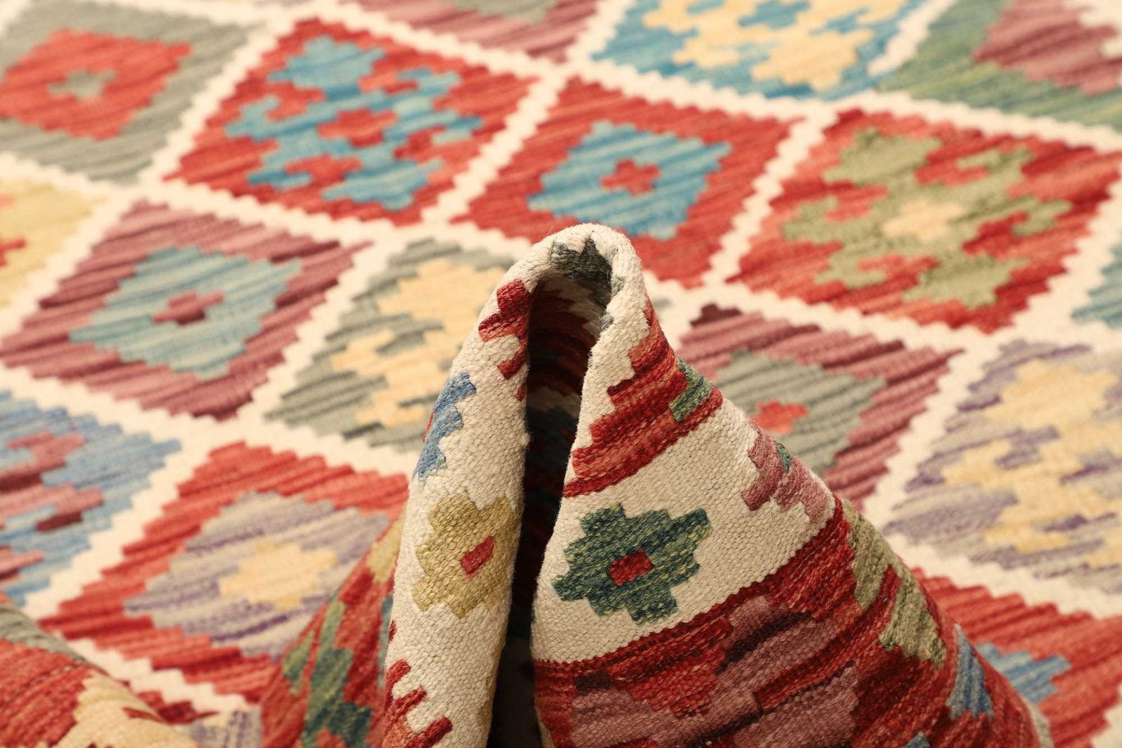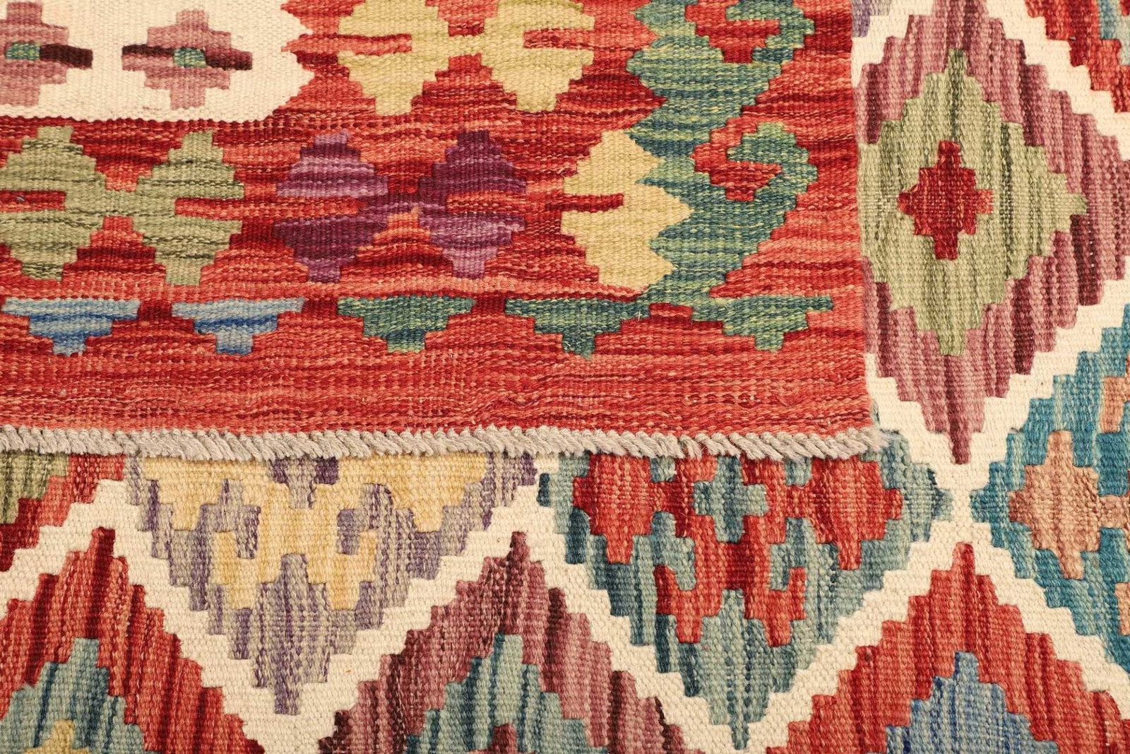 Ein weiterer Vorteil dieses handgewebten Kelim Teppichs ist die Vielseitigkeit. Er kann sowohl in modernen als auch in traditionellen Einrichtungskonzepten integriert werden. Dank seiner robusten Beschaffenheit eignet er sich ideal für stark frequentierte Räume, sei es im Wohnbereich oder im Eingangsbereich.