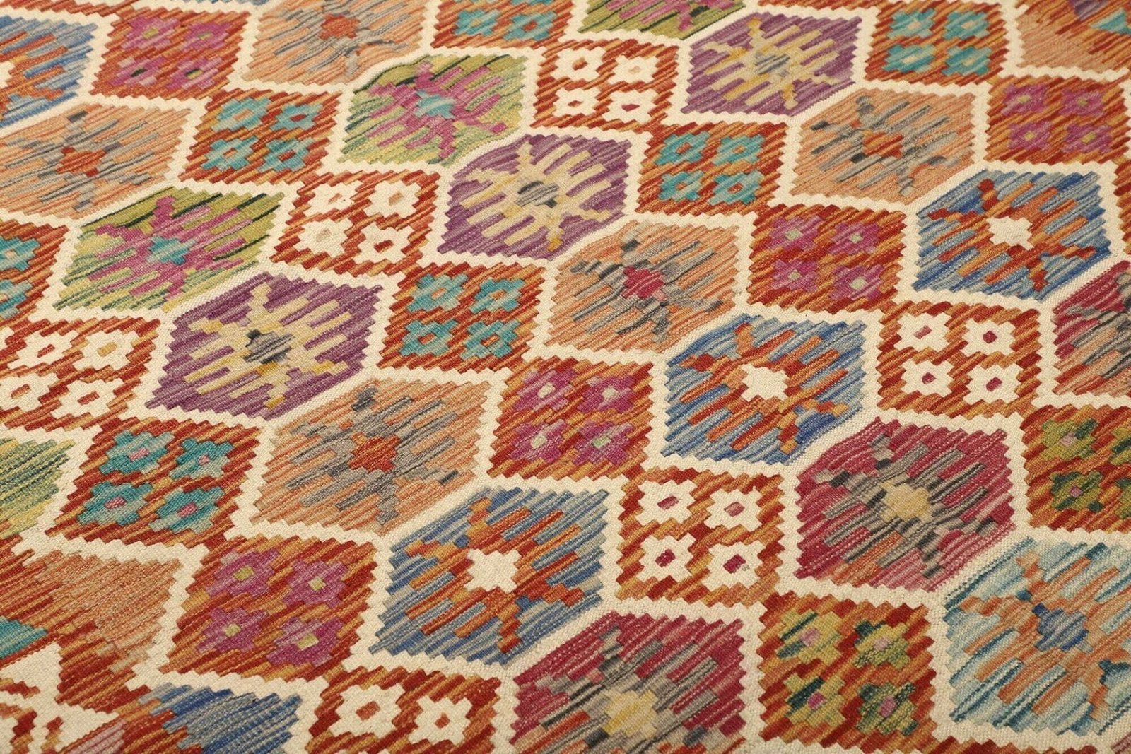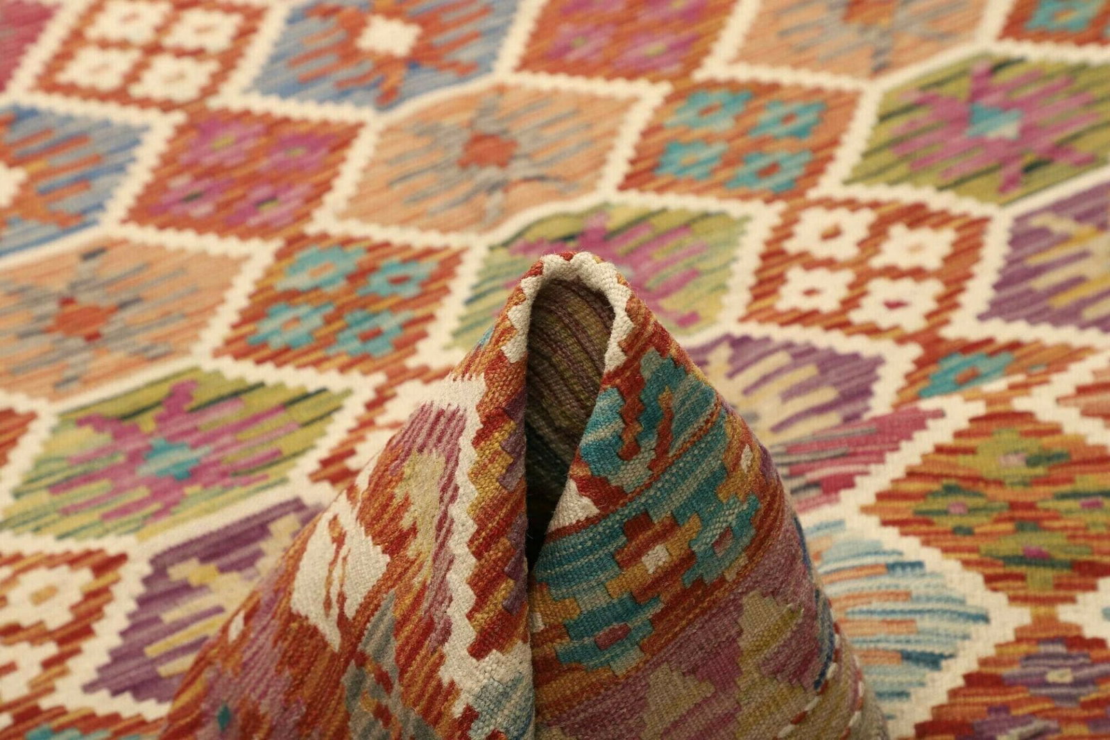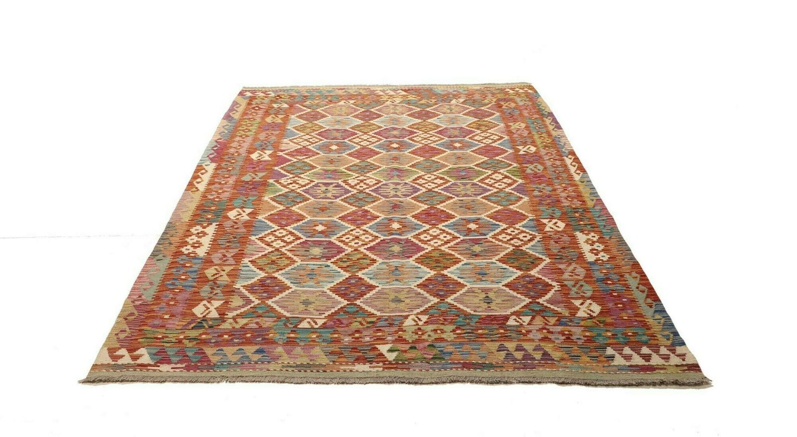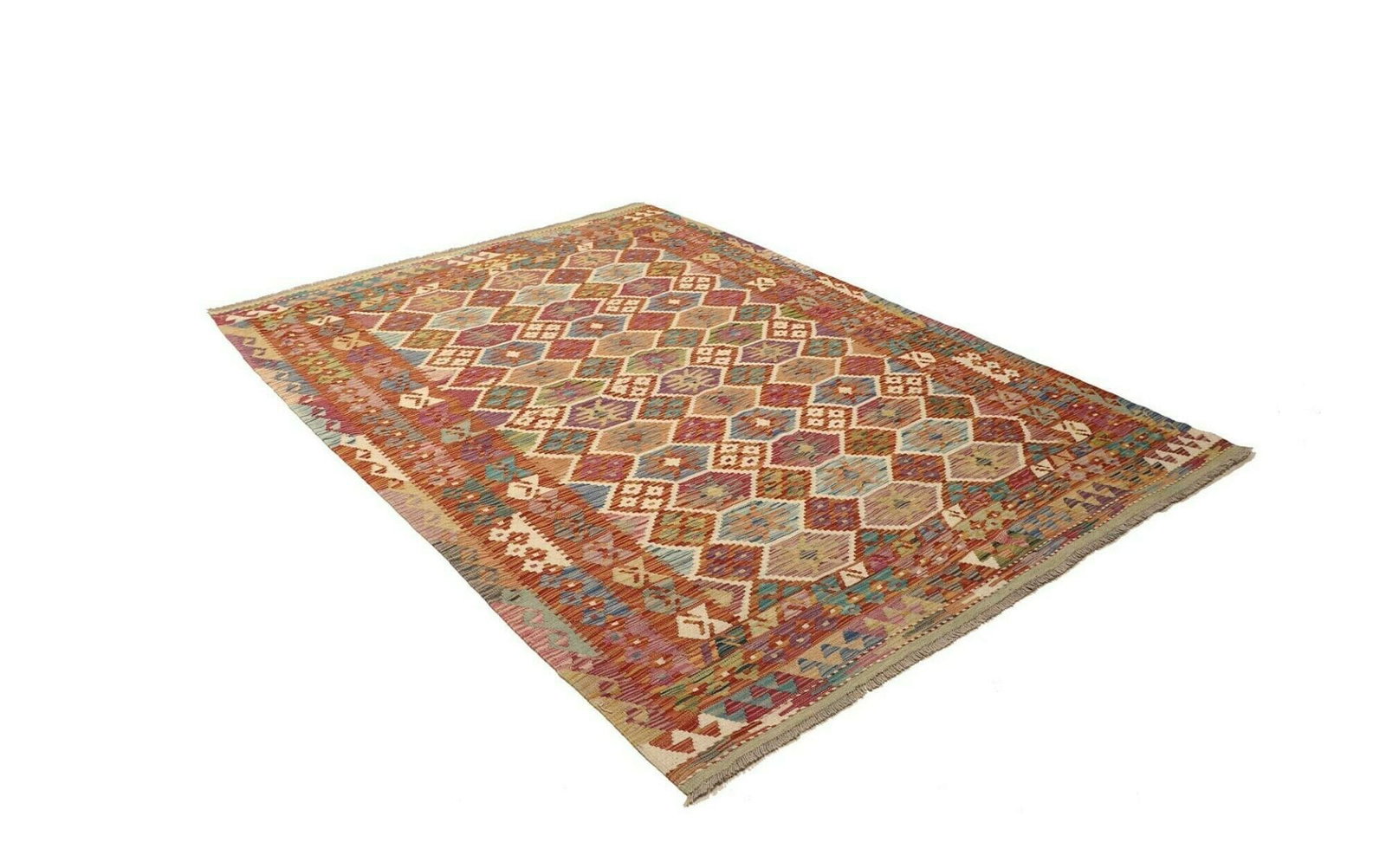 Kelim Teppich | Knotendichte: ca. 200.000 Knoten/m² | Material: 100% Schurwolle (Flor), 100% Baumwolle (Kette) | Größe: 175 x 240 cm | Zustand: Handgewebt | Herkunft: Pakistan | Höhe: ca. 5 mm | Vielseitig einsetzbar als Teppich, Vorhang oder Wandschmuck