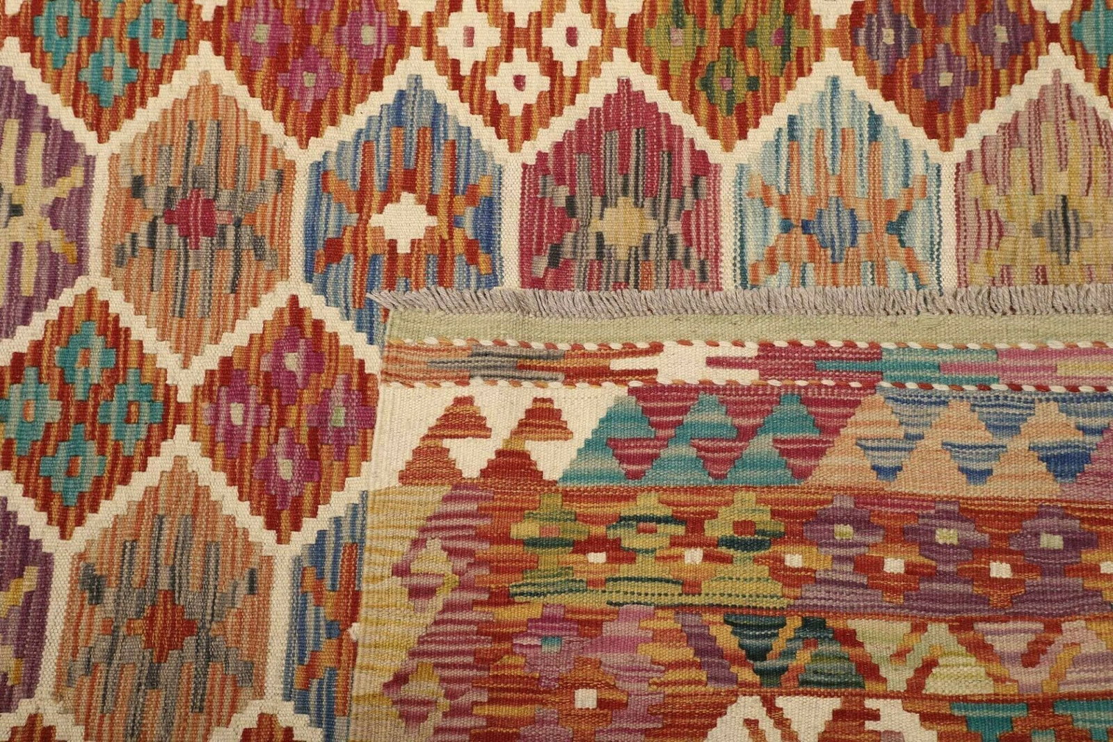 578$ In den WarenkorbKelim 215 x 144 cm – Handgewebt mit identischem Muster auf Vorder- und Rückseite – Orientteppich