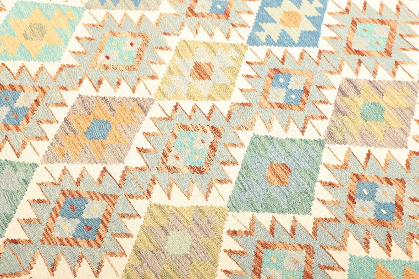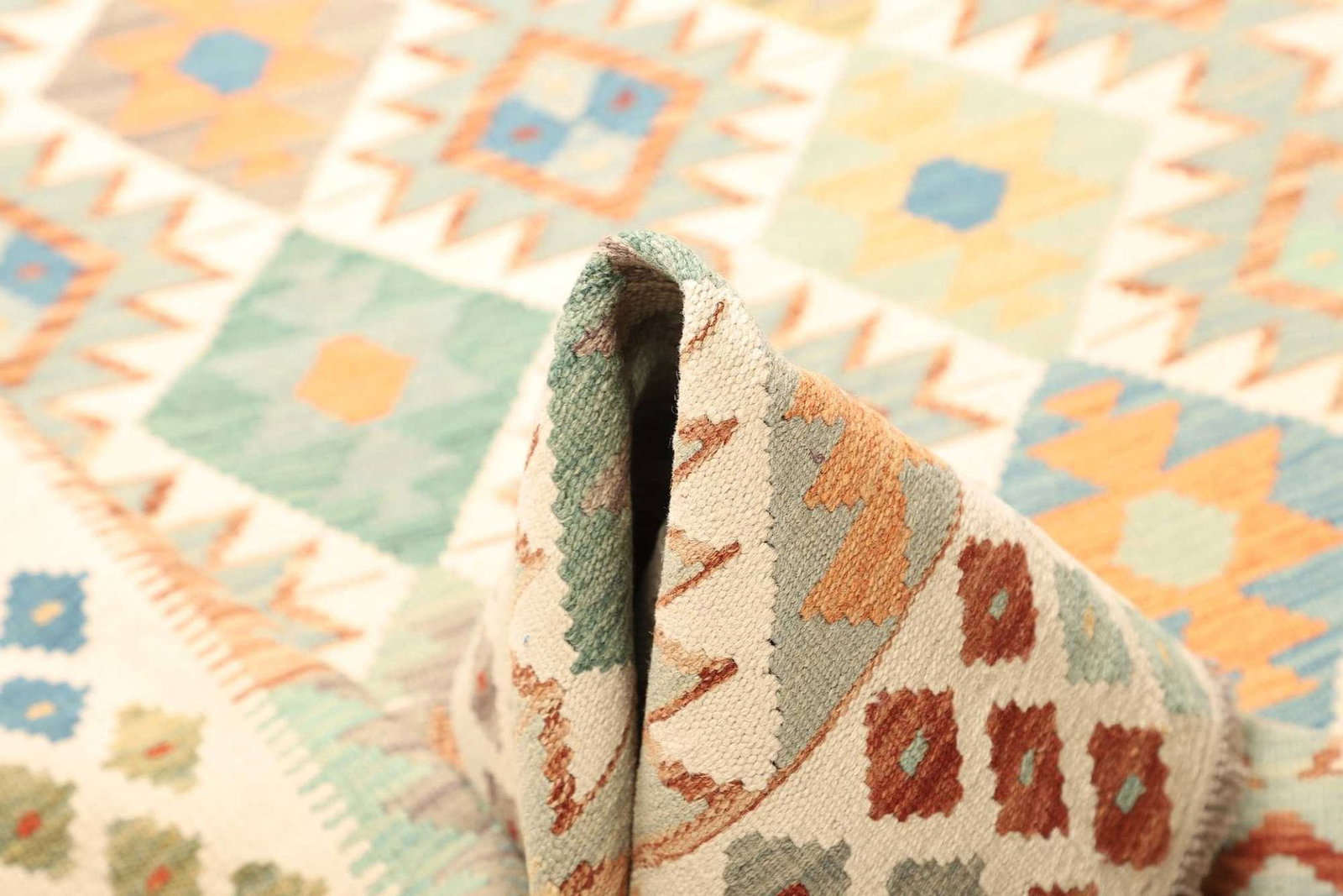 Der exquisite Kelim Teppich, der hier präsentiert wird, ist ein authentisches Stück Handwerkskunst aus Afghanistan. Er wurde aus hochwertiger Schurwolle gefertigt, was nicht nur für seine Beständigkeit und Langlebigkeit sorgt, sondern auch für ein angenehmes und weiches Gefühl unter den Füßen. Diese Teppichart ist nicht nur ein zeitloses Wohnaccessoire, sondern auch ein Symbol für die reiche Kultur und die Geschichte der Region, aus der er stammt. Handgewebt durch talentierte Kunsthandwerker, zeigt dieser Teppich die außergewöhnliche Qualität und Sorgfalt, die in jedes einzelne Stück fließt.