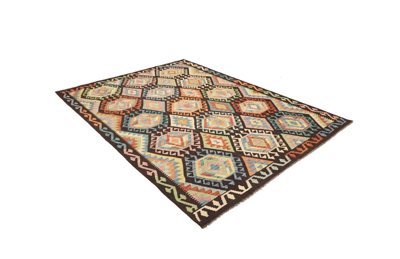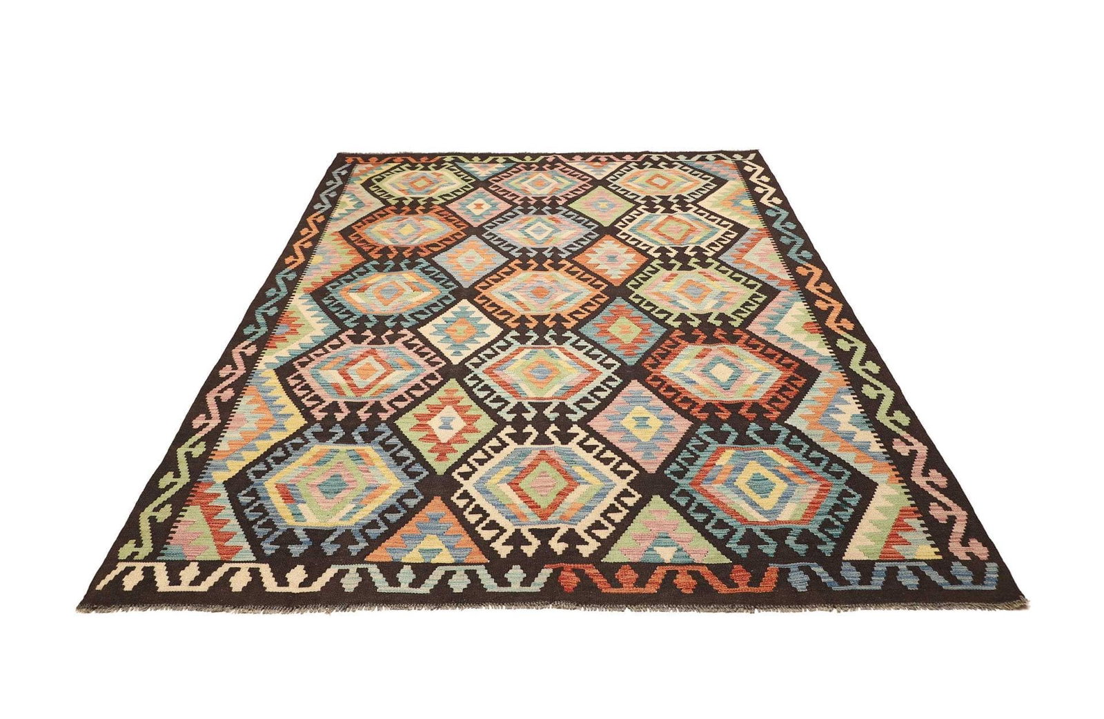 687$Ursprünglicher Preis war: 687$511$Aktueller Preis ist: 511$Kelim Teppich | Größe: 176 x 239 cm | Knotendichte: ca. 200.000 Knoten/m² | Flor: 100% Schurwolle | Kette: 100% Baumwolle | Verarbeitung: Handgewebt | Herkunft: Pakistan | Zustand: Sehr gut