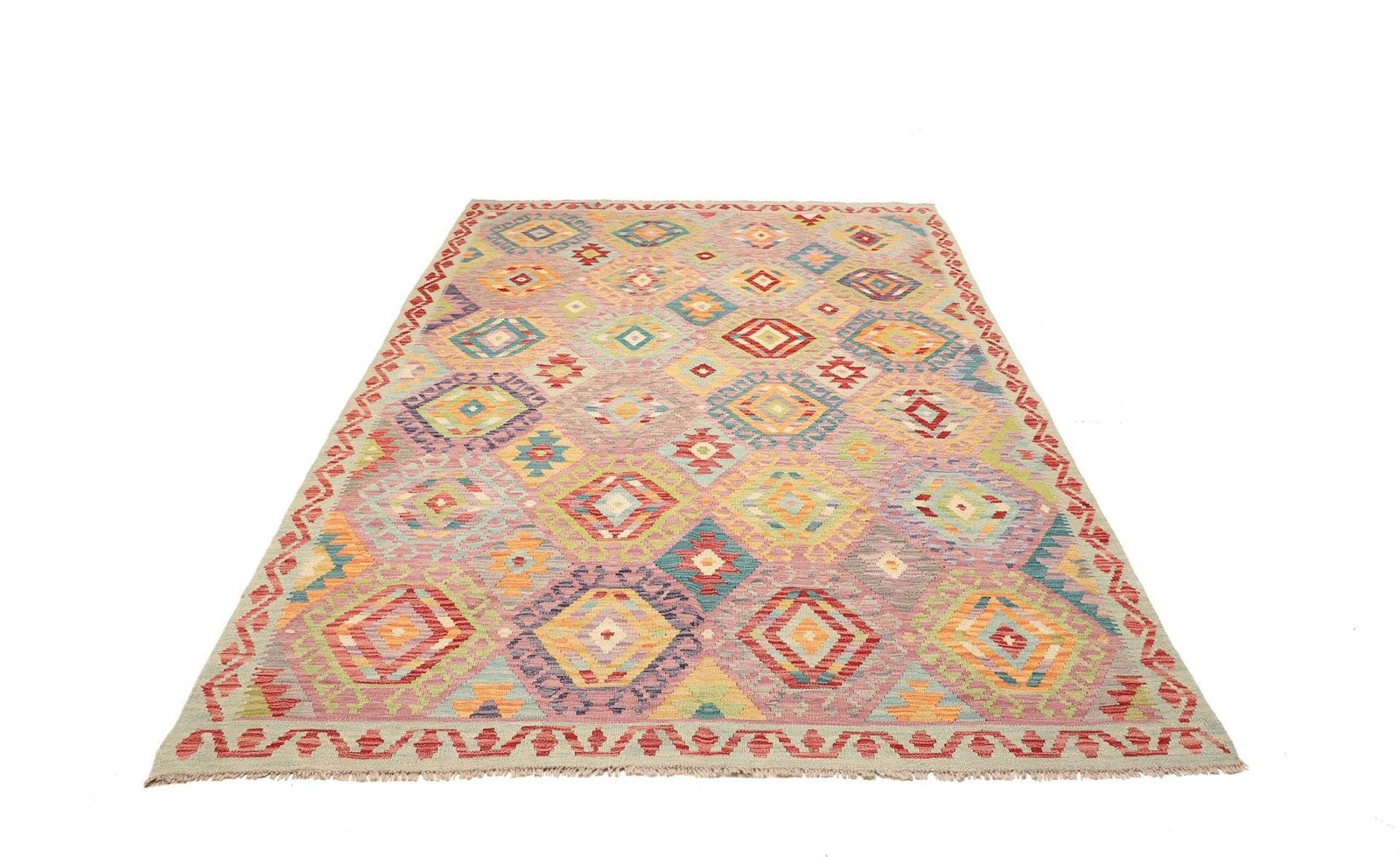 743$Ursprünglicher Preis war: 743$598$Aktueller Preis ist: 598$Kelim Teppich | Knotendichte: ca. 200.000 Knoten/m² | Material: 100% Schurwolle (Flor), 100% Baumwolle (Kette) | Größe: 176 x 247 cm | Handgewebte Qualität | Herkunft: Pakistan | Höhe: ca. 5 mm | Vielseitig einsetzbar als Teppich, Vorhang oder Wandschmuck