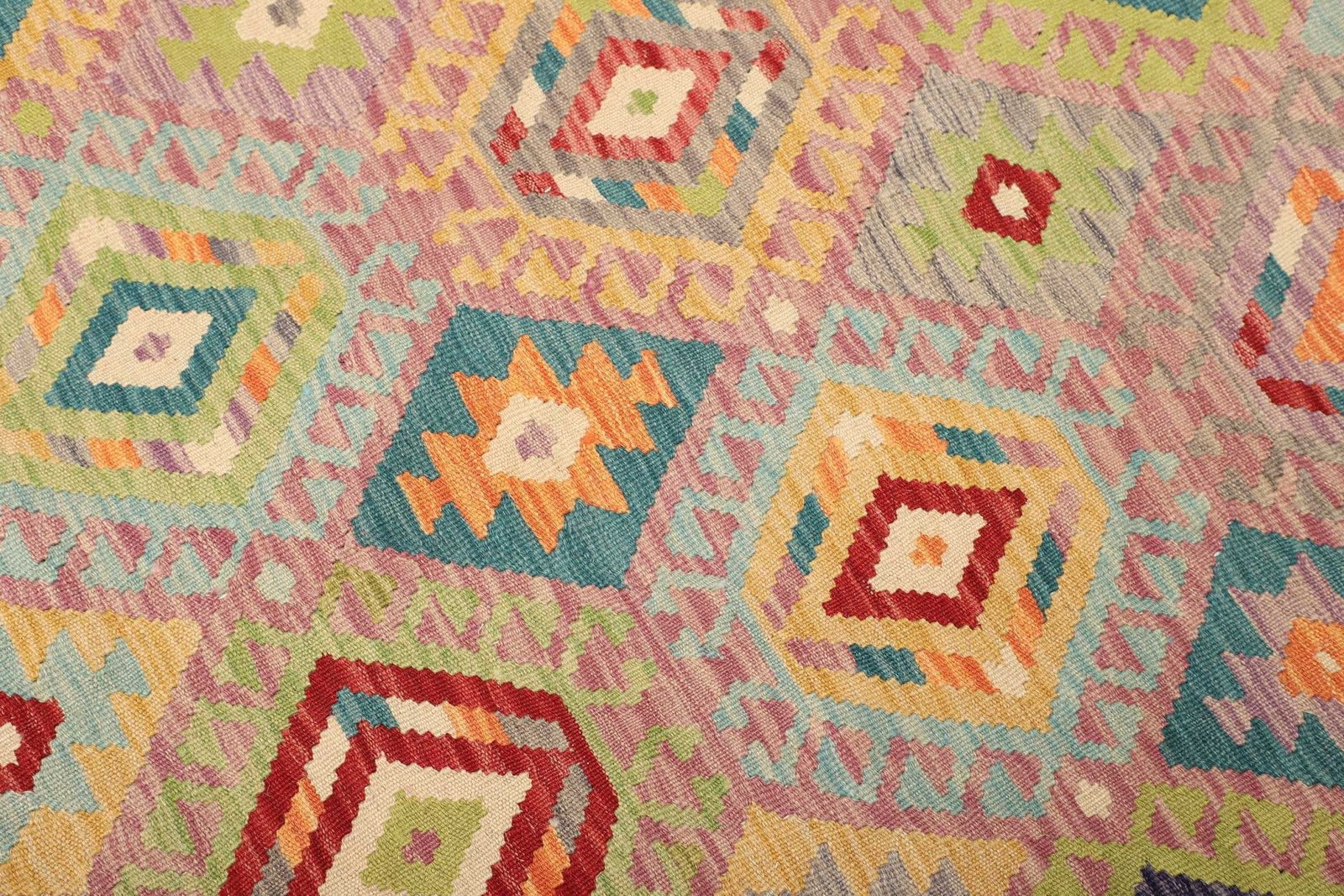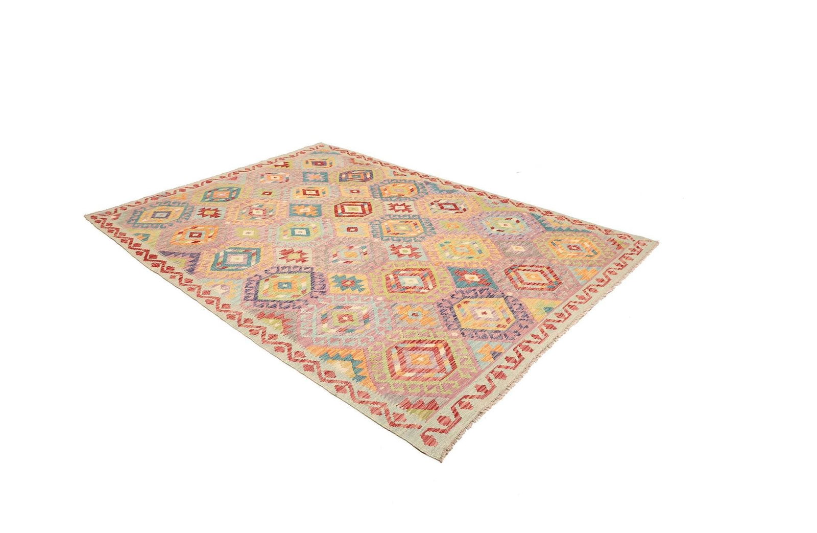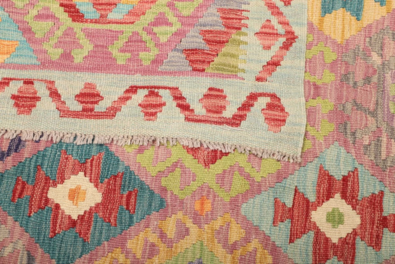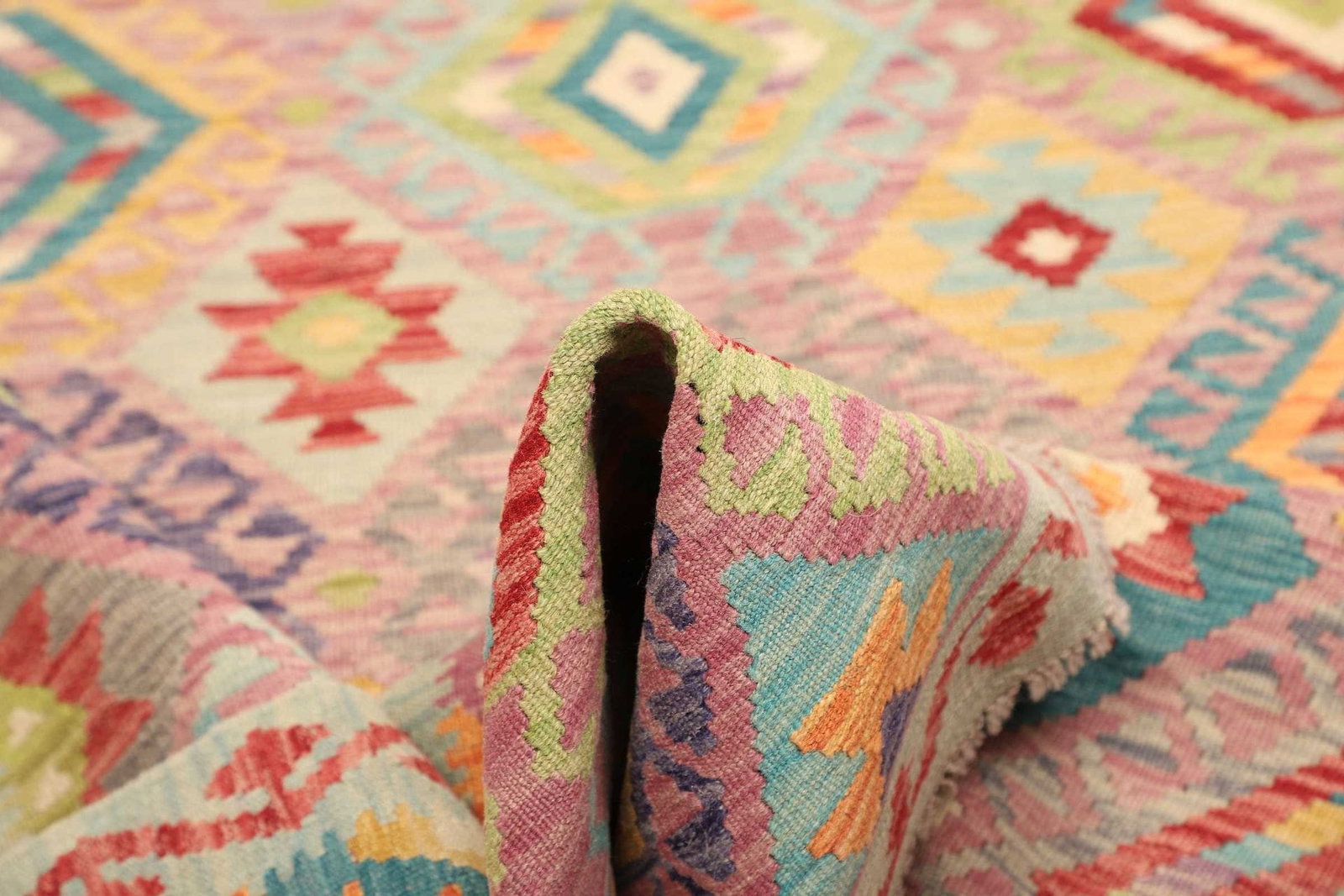 Die Verwendung von hochwertiger Wolle als Hauptmaterial verleiht diesem Kelim Teppich nicht nur eine angenehme Haptik, sondern sorgt auch für eine bemerkenswerte Beständigkeit. Wolle ist bekannt für ihre Fähigkeit, Wärme zu speichern und gleichzeitig Feuchtigkeit abzuleiten, wodurch der Teppich in jedem Raum ein behagliches Ambiente schafft. Das handgewebte Verfahren garantiert, dass jeder Teppich ein Unikat darstellt, das mit viel Liebe und Präzision hergestellt wurde. Die Knotendichte ist Ausdruck der Kunstfertigkeit und sorgt dafür, dass der Teppich über Jahre hinweg seine Schönheit behält, auch bei intensiver Nutzung.