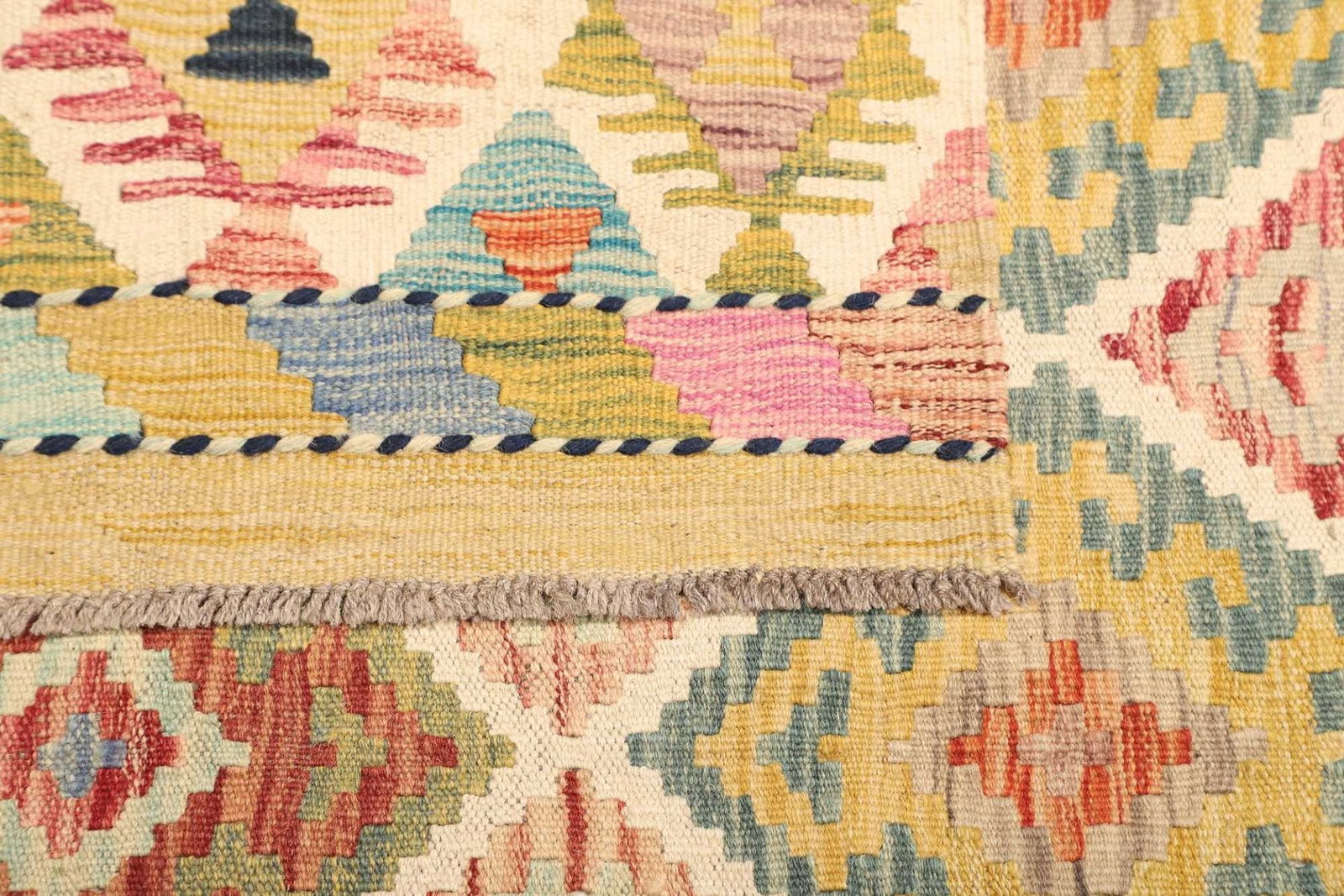 Der verwendete Rohstoff, Schurwolle, ist bekannt für seine erstaunliche Strapazierfähigkeit und natürlichen Eigenschaften. Wolle hat eine isolierende Wirkung, die sowohl bei Hitze als auch bei Kälte für ein angenehmes Raumklima sorgt. Dies macht unseren Kelim Teppich zu einer idealen Wahl für Wohnbereiche, Schlafzimmer oder Eingangsbereiche.
