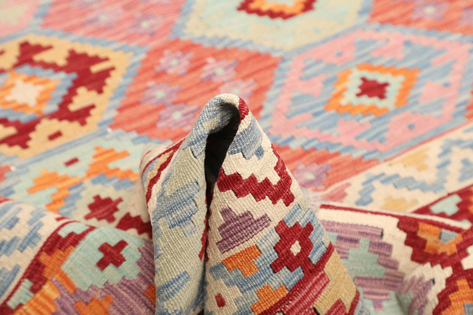 Dieser Teppich wurde handgewebt, was bedeutet, dass jeder Teppich ein Unikat ist, das mit viel Sorgfalt und Hingabe gefertigt wurde. Die Handwebtechnik, die für Kelim Teppiche typisch ist, zeichnet sich durch flache, geometrische Muster aus, die die Möglichkeit bieten, kreativ mit Farben und Designs umzugehen. Die Knotendichte ist bei Kelim Teppichen in der Regel geringer, was ihnen eine besondere Leichtigkeit verleiht und den rustikalen Charme zusätzlich unterstreicht.