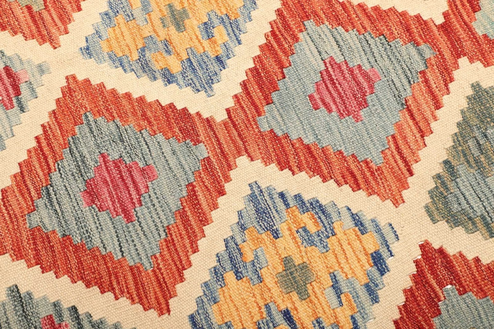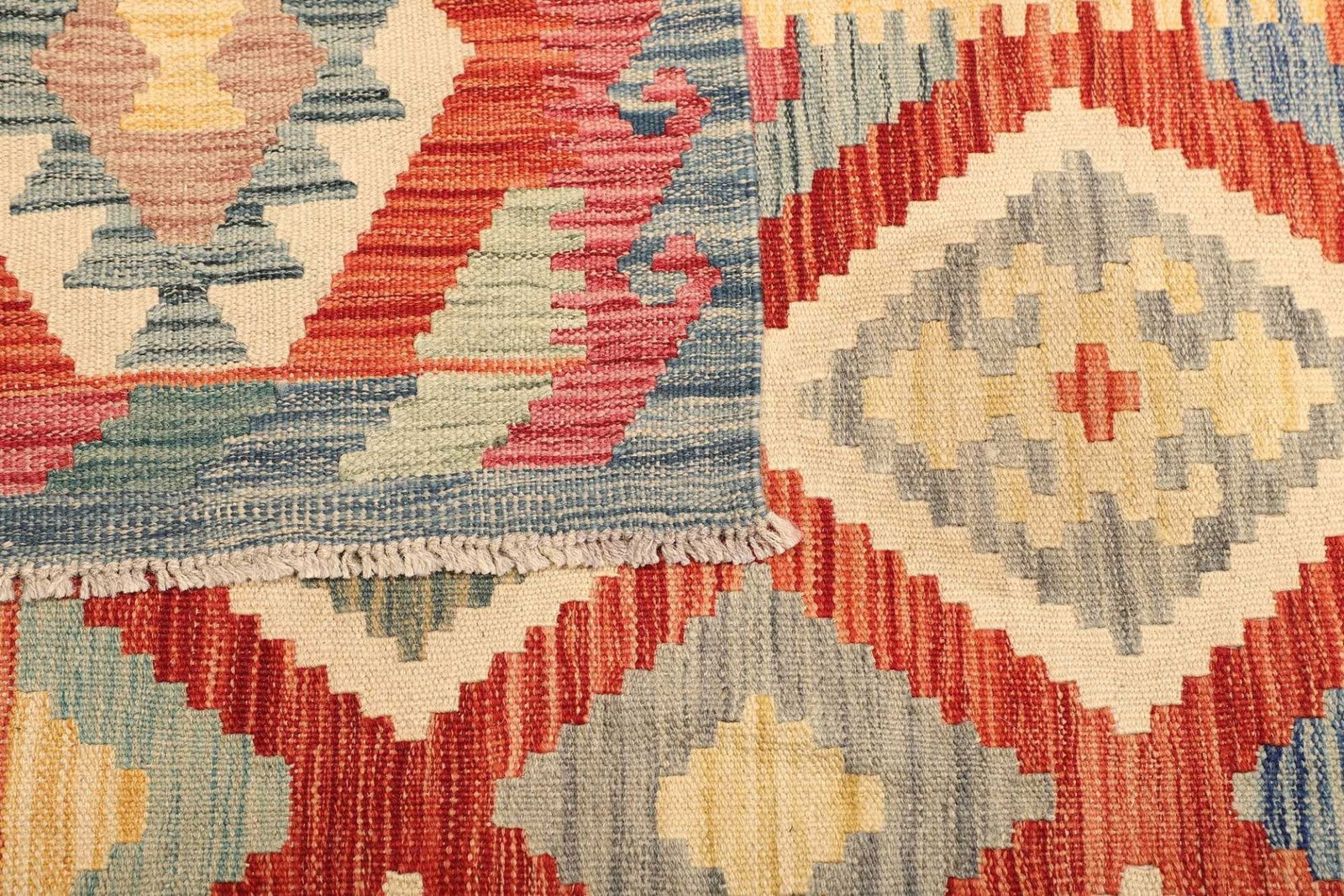 Der Teppich besteht aus 100% natürlicher Schurwolle, die für ihre Strapazierfähigkeit und ihre hervorragenden isolierenden Eigenschaften bekannt ist. Schurwolle ist ein idealer Rohstoff für die Teppichproduktion, da sie nicht nur schmutzabweisend ist, sondern auch Feuchtigkeit reguliert, wodurch ein angenehmes Raumklima geschaffen wird. Die handgewebte Technik des Kelims verleiht dem Teppich eine besondere Flachgewebestruktur, die sich hervorragend für stark frequentierte Räume eignet. Die Verwendung von Schurwolle sorgt dafür, dass die Farben lebendig und die Muster markant zur Geltung kommen.