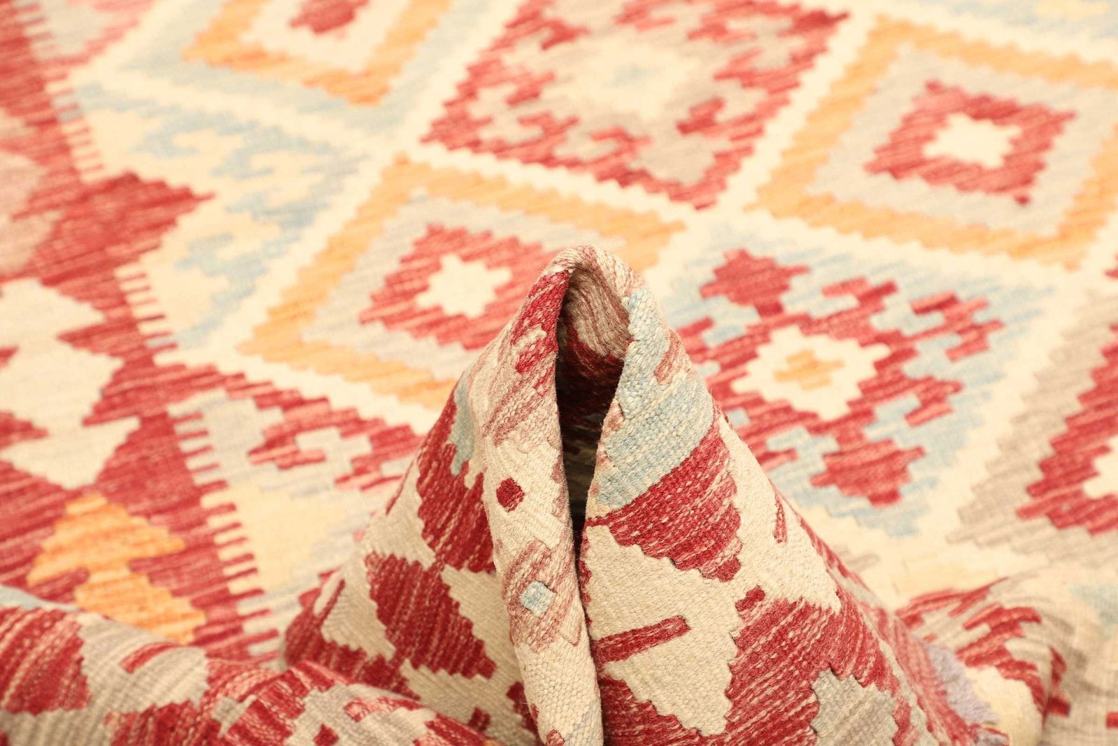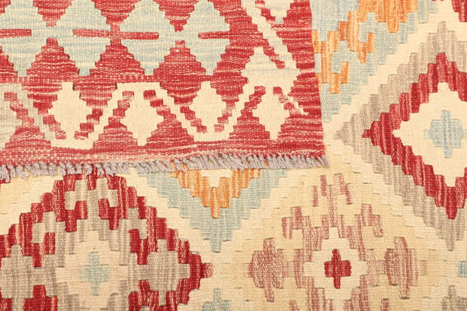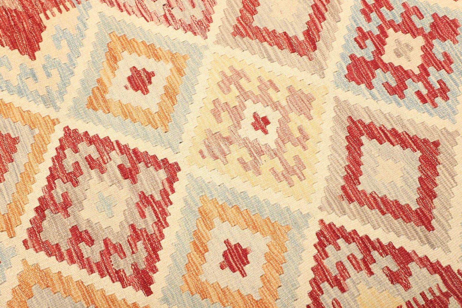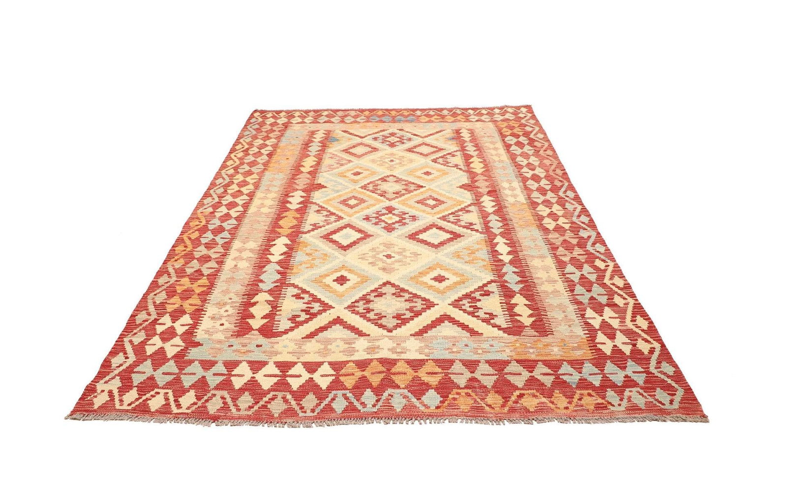 Der Kelim Teppich besteht aus 100 % Schurwolle, einem Material, das für seine Langlebigkeit und Widerstandsfähigkeit geschätzt wird. Schurwolle ist nicht nur angenehm weich und warm, sondern auch schmutzabweisend und pflegeleicht. Die Handwebtechnik sorgt dafür, dass jeder Teppich ein Unikat ist, gefertigt von erfahrenen Kunsthandwerkern, die ihre Fähigkeiten über Generationen hinweg perfektioniert haben. Die hohe Knotendichte garantiert eine robuste Qualität und ermöglicht es, die prächtigen Muster und Designs detailgetreu darzustellen.