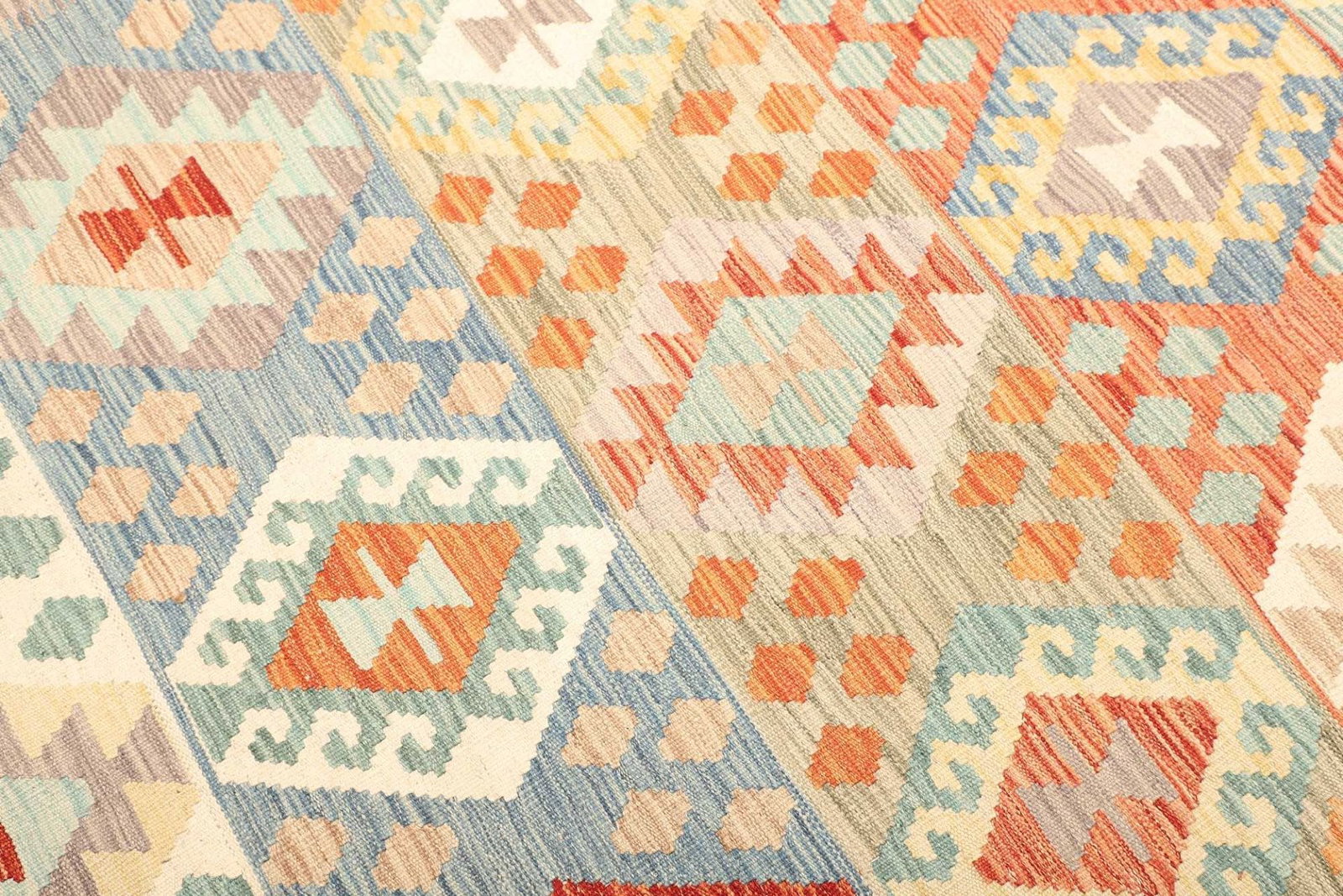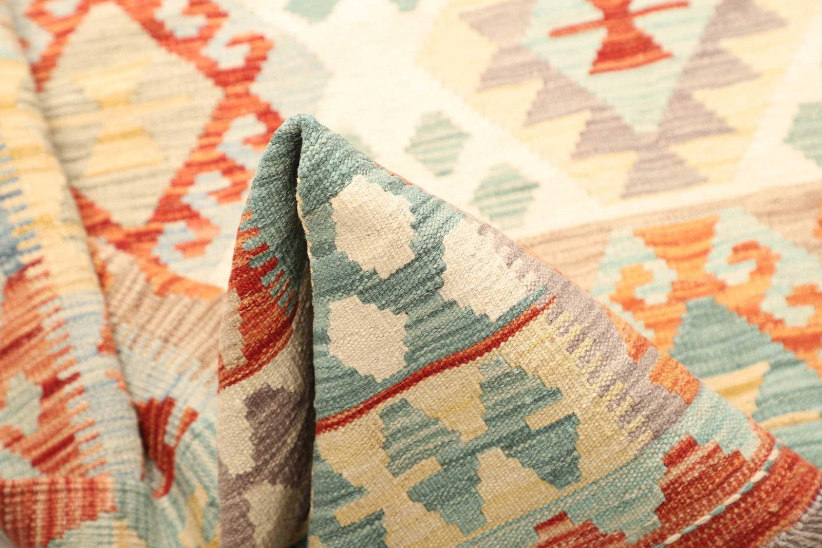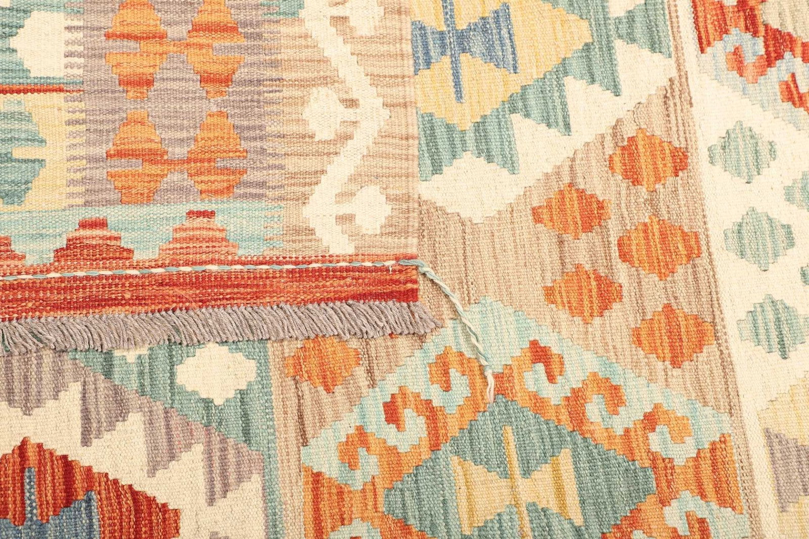 Als Afghanischer Teppich spiegelt dieser Kelim die reichen Traditionen und das Handwerk der Region wider. Afghanische Teppiche zeichnen sich durch ihre lebendigen Farben und klaren geometrischen Muster aus. Die Vielfalt an Designs ist oft durch die kulturellen Einflüsse der verschiedenen ethnischen Gruppen in Afghanistan geprägt – insbesondere von den Nomaden, die die Teppiche traditionell weben. In Afghanistan wird das Teppichweben oft von Generation zu Generation weitergegeben, was eine tiefe kulturelle Verbindung und ein wertvolles Handwerk garantiert.