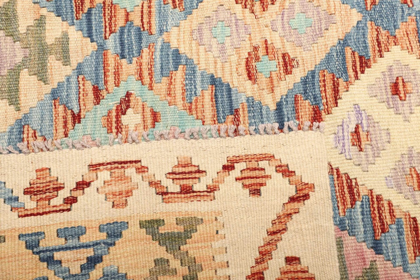 Der Kelim Teppich ist vollständig aus hochwertiger Wolle gefertigt, was ihm eine weiche und angenehme Textur verleiht. Wolle ist nicht nur ein natürliches Material, das für seine Strapazierfähigkeit bekannt ist, sondern bietet auch hervorragende Isolationseigenschaften. Die handgewebte Technik verleiht dem Teppich eine einzigartige Charakteristik, die in maschinell hergestellten Teppichen oft nicht zu finden ist. Jeder Teppich ist ein Unikat, das die Liebe und das handwerkliche Können der Weber widerspiegelt.