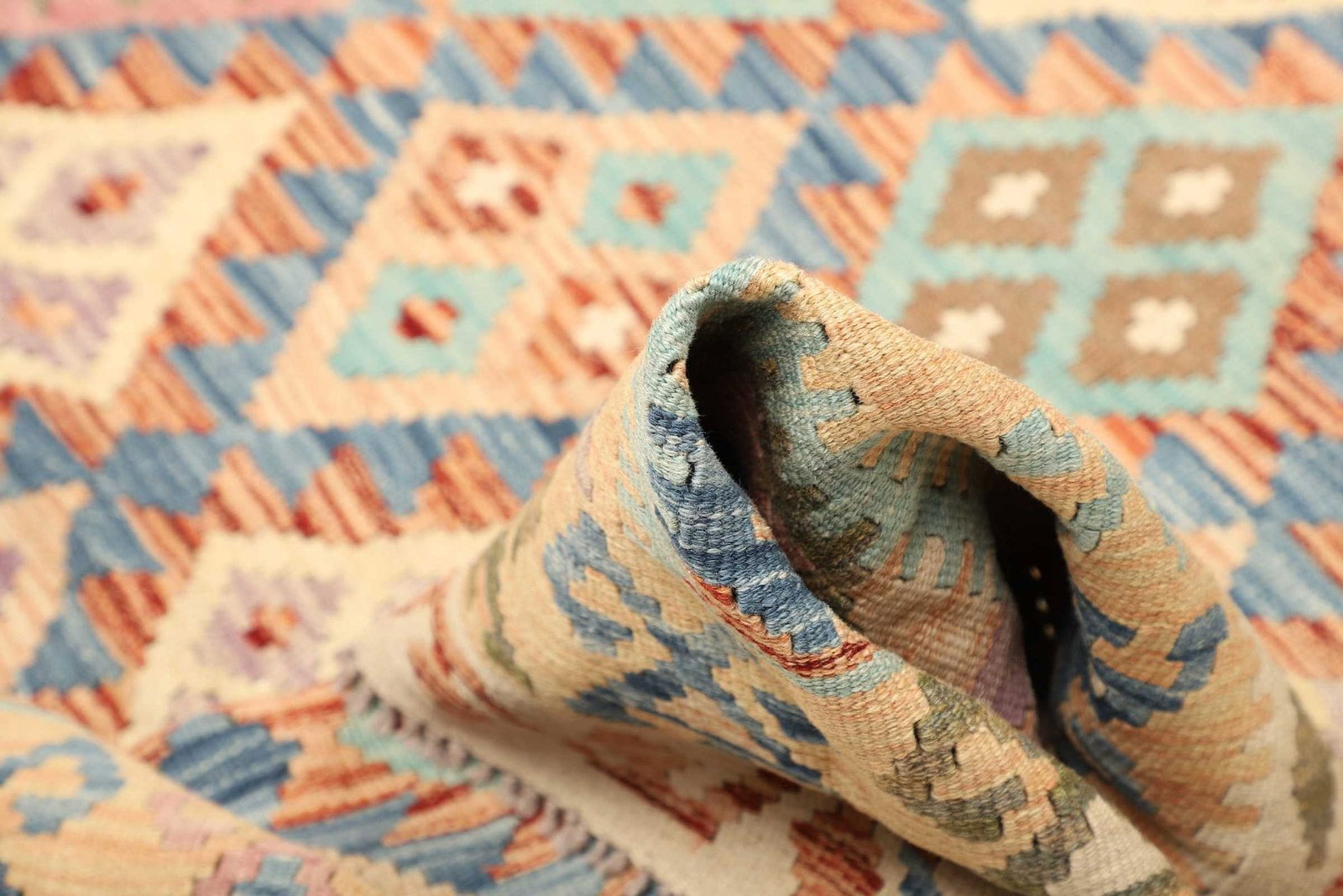 Ein weiteres bemerkenswertes Merkmal des handgewebten Kelim Teppichs ist die Knotendichte, die durch die spezifische Webtechnik beeinflusst wird. Dies sorgt dafür, dass der Teppich sowohl robust als auch flexibel ist, was ihn ideal für stark frequentierte Räume macht. Zudem ist Wolle ein schmutzabweisendes Material, welches leicht zu reinigen ist und so für eine hohe Lebensdauer sorgt.
