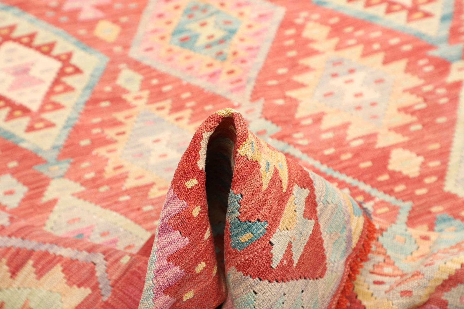 Der Kelim Teppich wird ausschließlich aus hochwertiger Wolle hergestellt. Wolle ist ein natürlicher Rohstoff, der für seine Festigkeit und Langlebigkeit bekannt ist. Darüber hinaus hat Wolle die Fähigkeit, Feuchtigkeit zu regulieren und ist schmutzabweisend, was diesen Teppich besonders pflegeleicht macht. Die handgewebte Technik sorgt dafür, dass jeder Teppich nicht nur ästhetisch ansprechend, sondern auch robust ist.