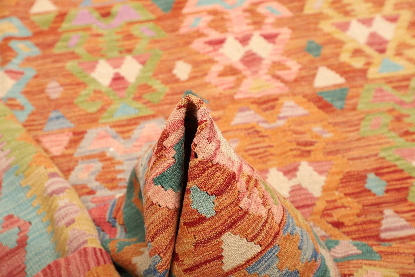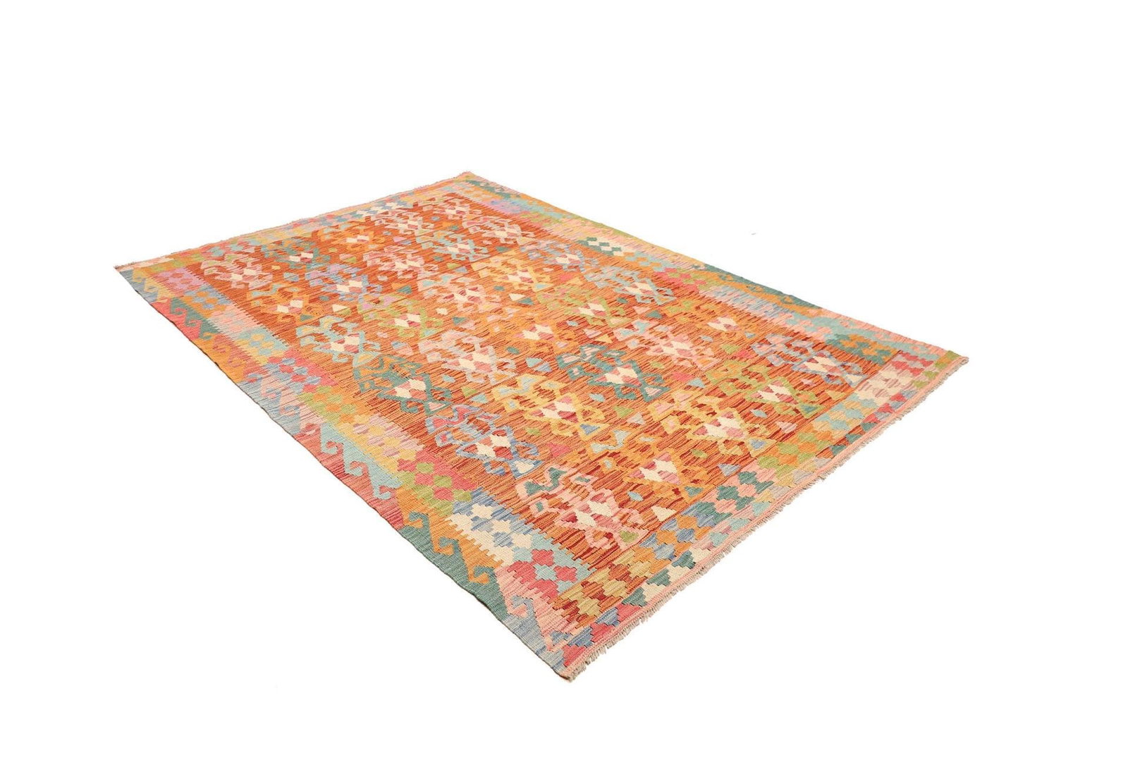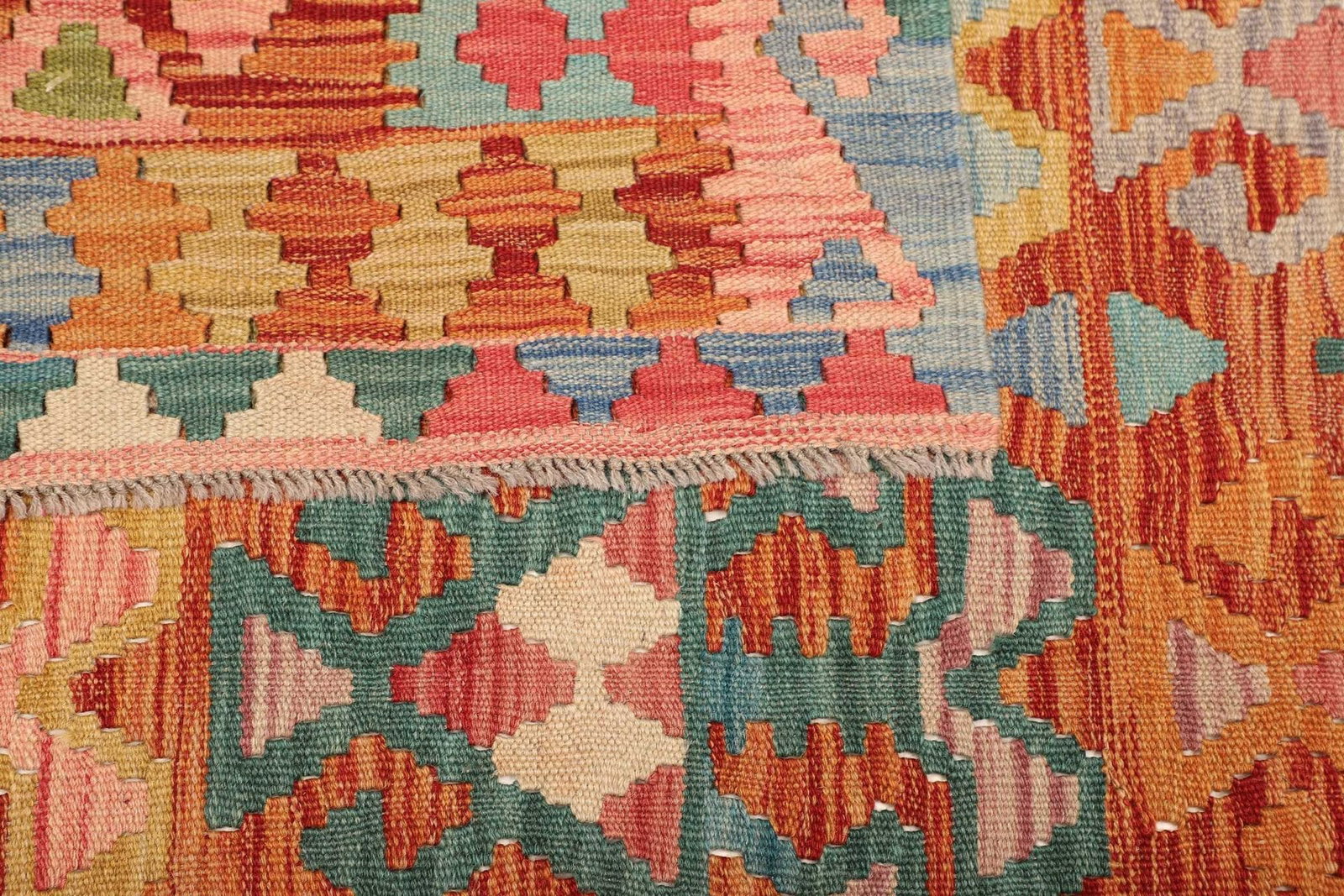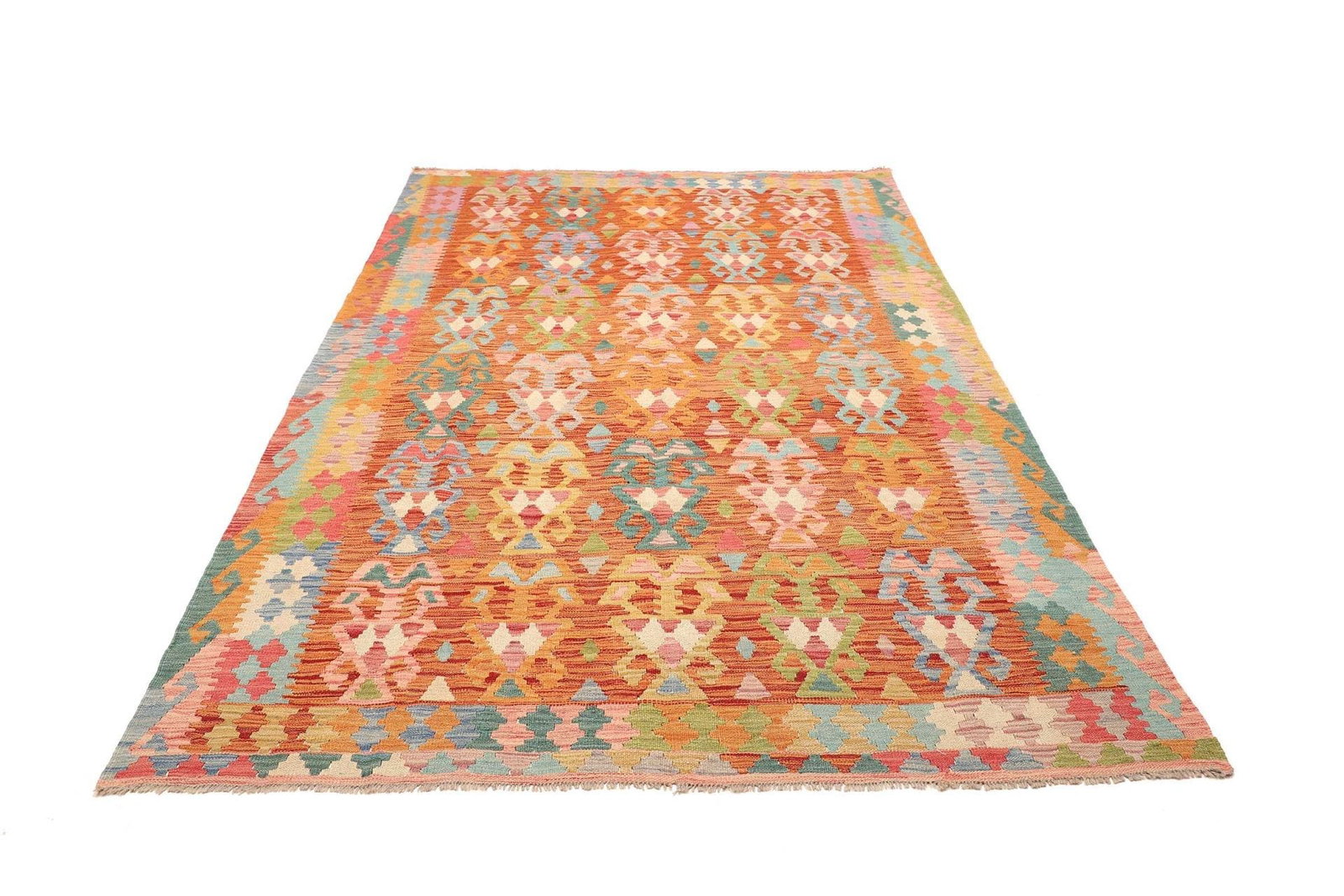 Kelim Teppich | Knotendichte: ca. 200.000 Knoten/m² | Material: 100% Schurwolle (Flor), 100% Baumwolle (Kette) | Größe: 179×250 cm | Zustand: Handgewebte Qualität | Herkunft: Pakistan | Höhe: ca. 5 mm | Vielseitig einsetzbar als Teppich, Vorhang oder Wandschmuck