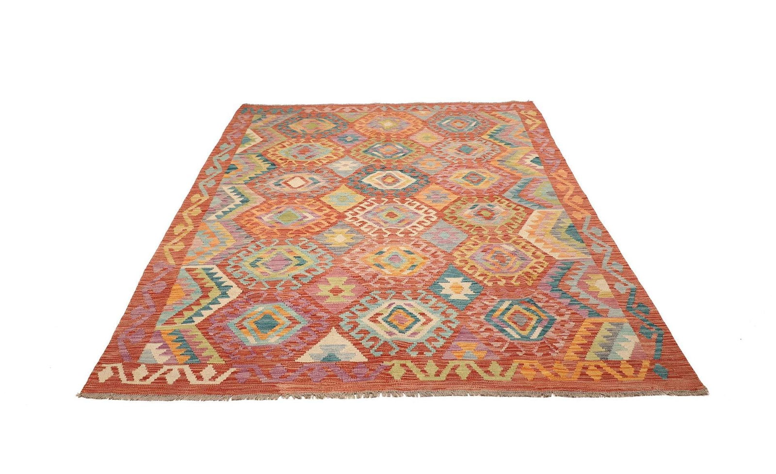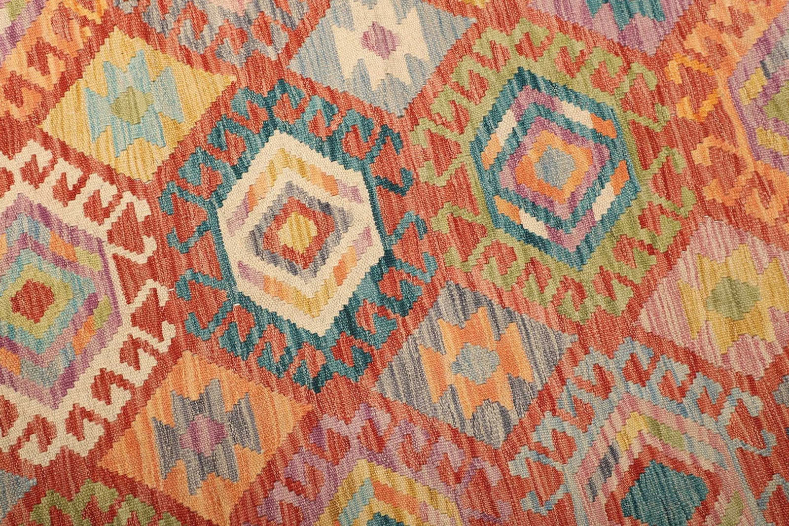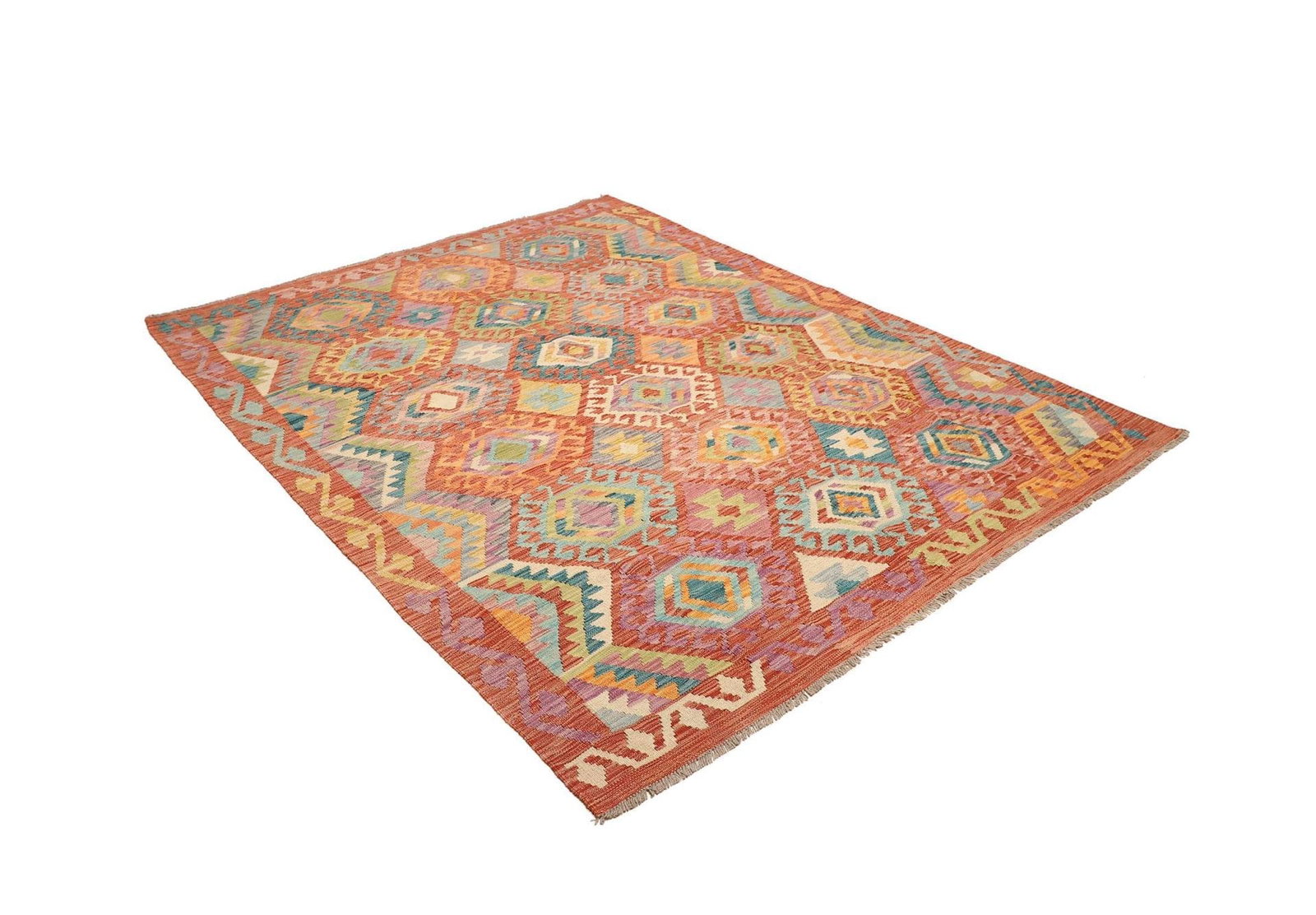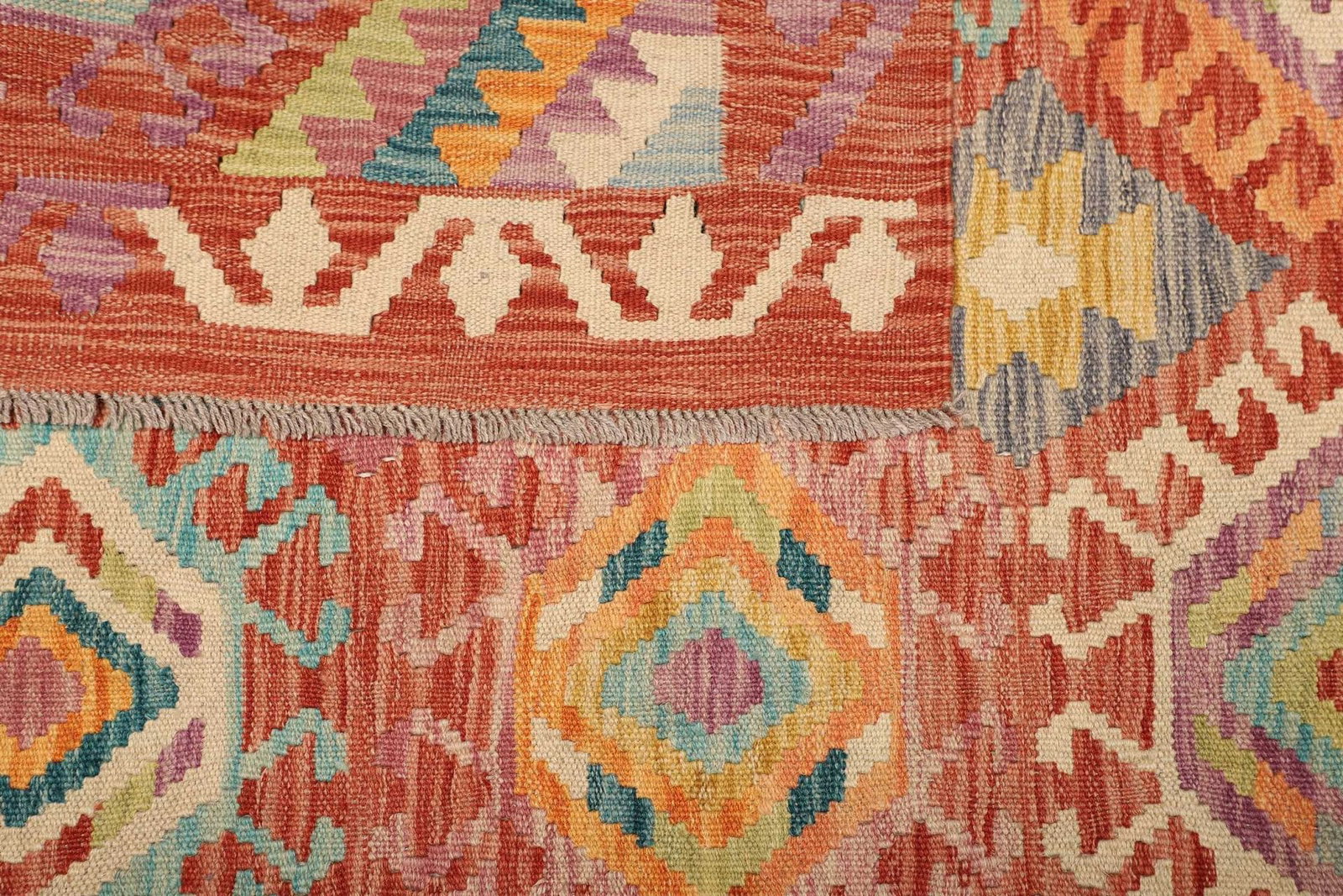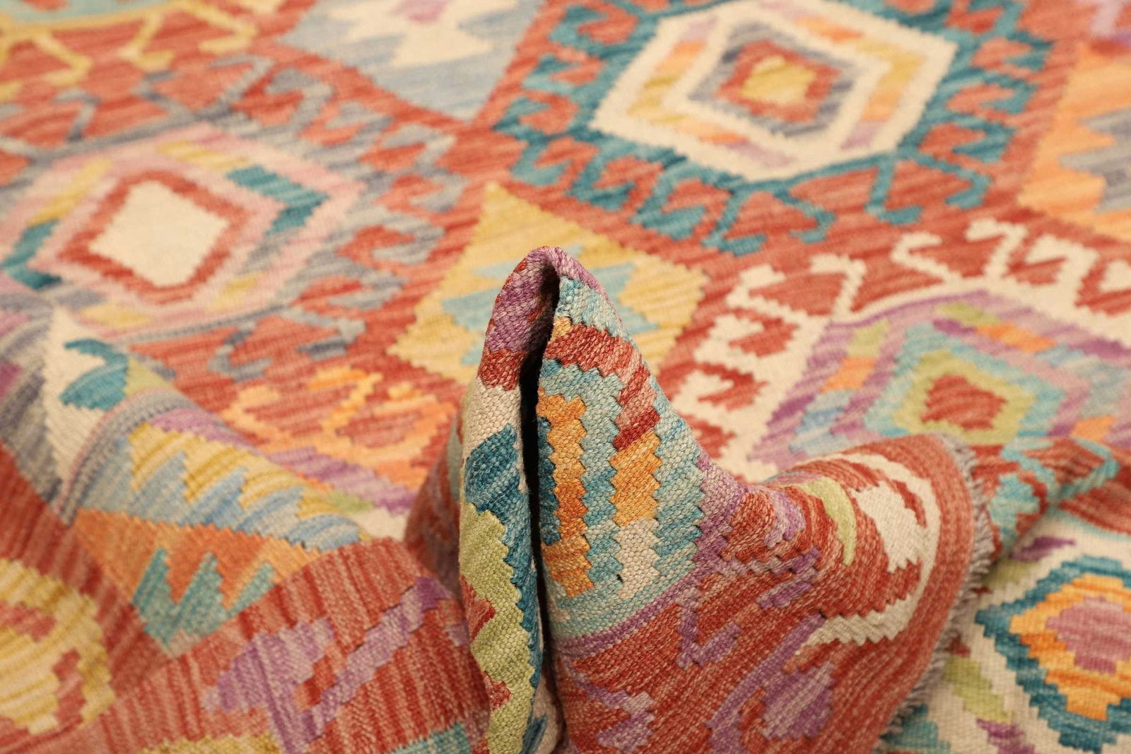 Der Kelim Teppich wird traditionell handgewebt, was jedem Stück seinen einzigartigen Charakter verleiht. Bei der Fertigung kommen nur die feinsten Materialien zum Einsatz, sodass der Teppich nicht nur optisch, sondern auch in der Haptik überzeugt. Schurwolle, bekannt für ihre natürliche Elastizität und Widerstandsfähigkeit, ist ideal für die Herstellung von Teppichen geeignet und bietet eine hervorragende Farbbeständigkeit. Die üppige Textur der Wolle sorgt zudem für eine warme Atmosphäre in jedem Raum.