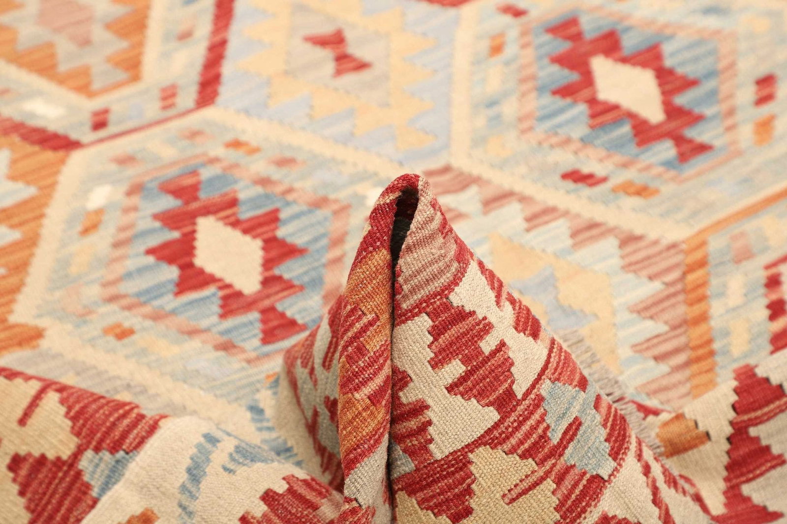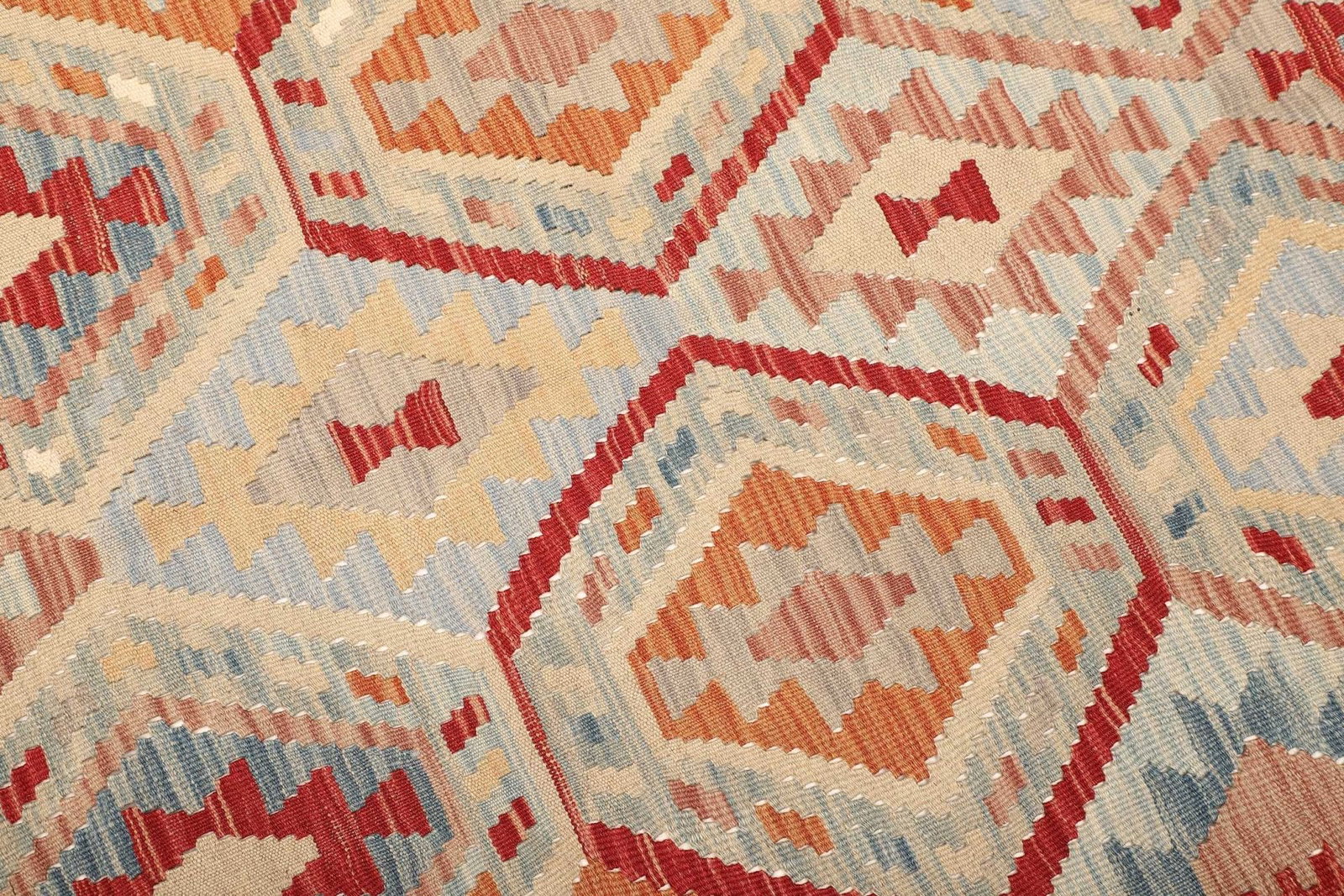 Dieser Kelim Teppich besticht durch die Verwendung hochwertiger Naturmaterialien. Typischerweise werden für die Herstellung von Kelim-Teppichen Wolle und Baumwolle verwendet. Wolle sorgt für Robustheit und Strapazierfähigkeit, während Baumwolle ein weiches Gefühl vermittelt und sich angenehm anfühlt. Die handgewebte Technik, die beim Kelim zum Einsatz kommt, bedeutet, dass jeder Teppich ein Unikat ist. Mit viel Geschick und Tradition werden die Teppiche in sorgfältiger Handarbeit gefertigt, was sich in der Qualität und dem Detailreichtum der Muster widerspiegelt.