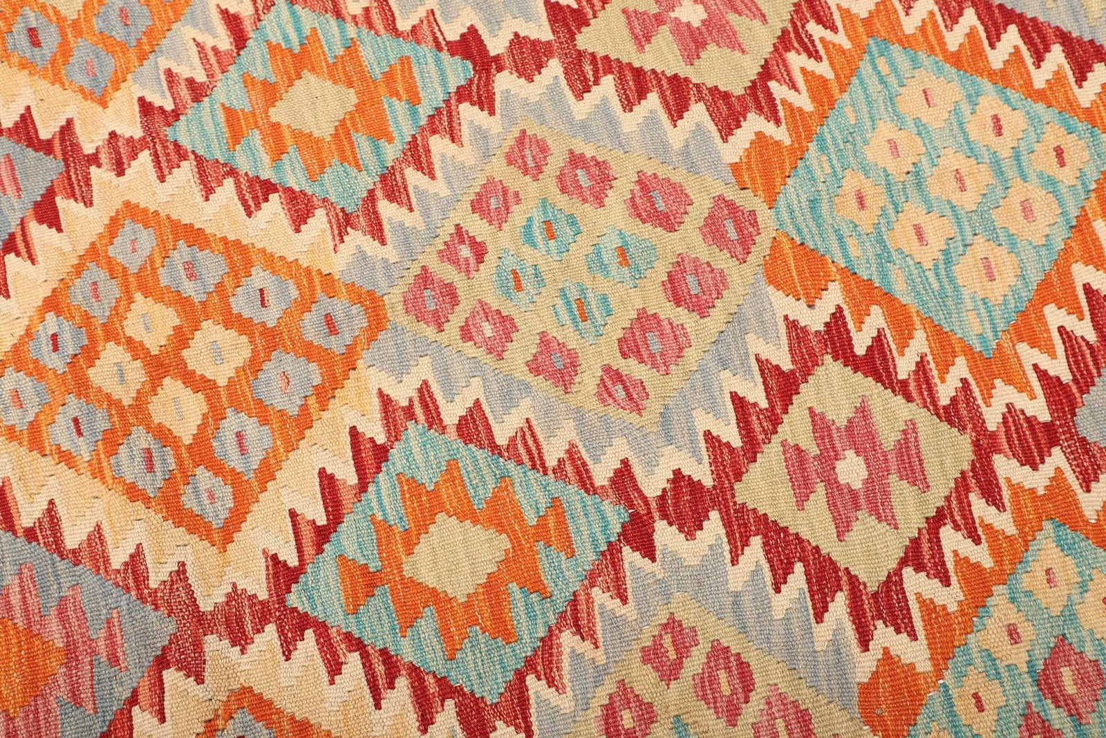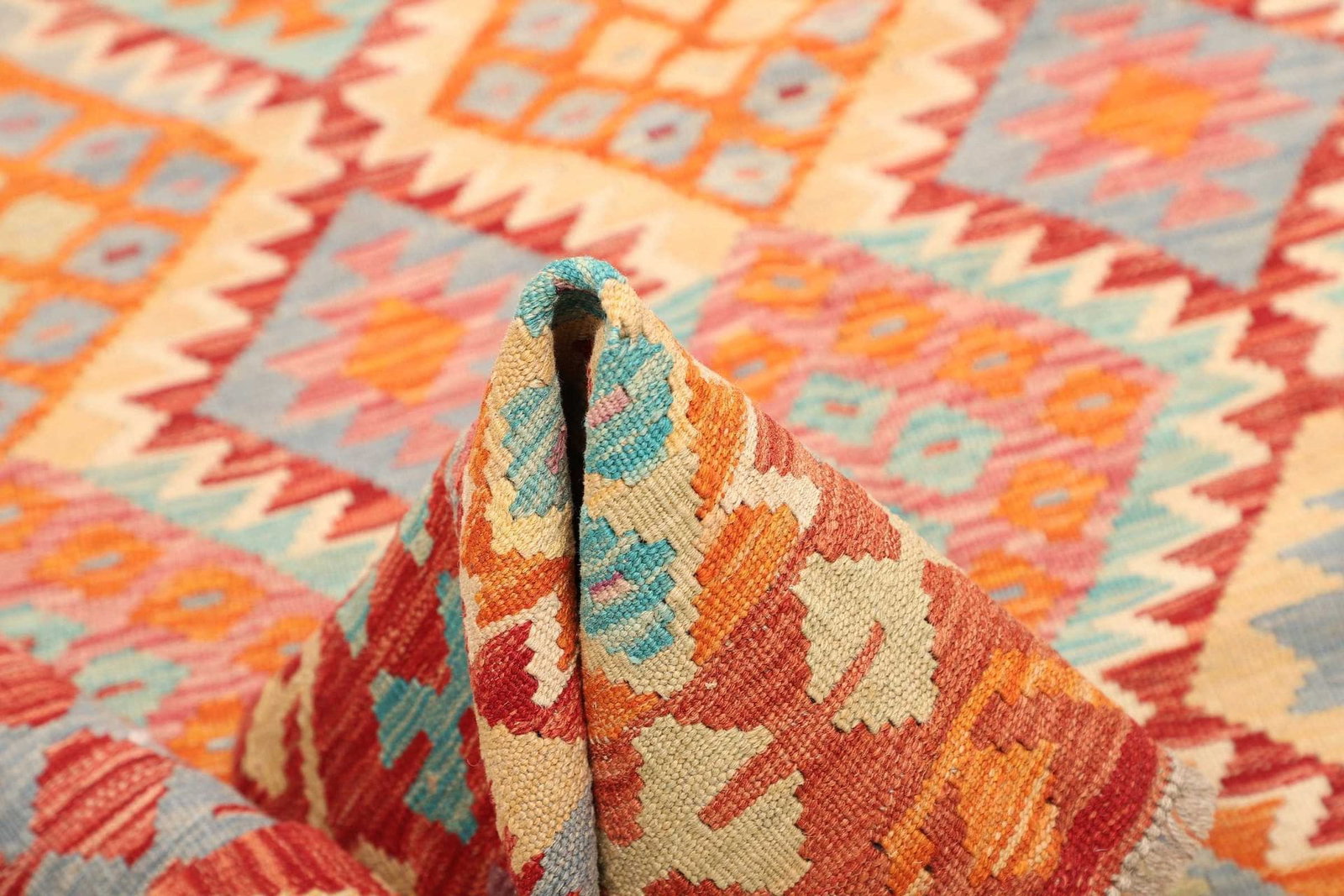 Der rustikale Charakter dieses Kelim Teppichs wird durch ein ausgeklügeltes Muster unterstrichen, das sowohl modern als auch zeitlos wirkt. Die natürlichen Erdtöne und kräftigen Akzentfarben harmonieren perfekt miteinander und verleihen jedem Raum eine besondere Note. Geschickt kombinierte geometrische Formen und traditionelle Muster machen den Teppich zu einem kunstvollen Gestaltungselement, das nicht nur Füße, sondern auch Augen erfreut.