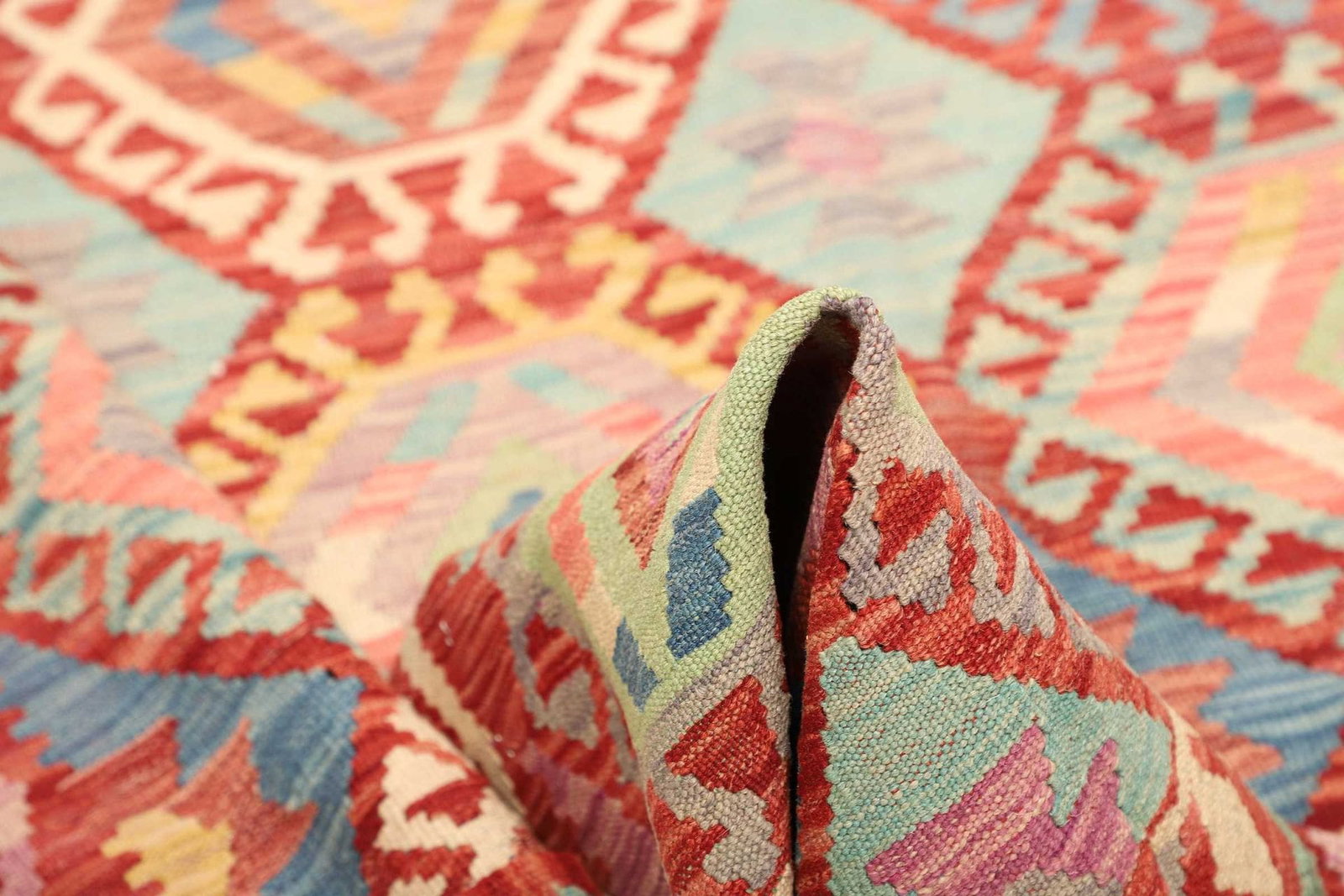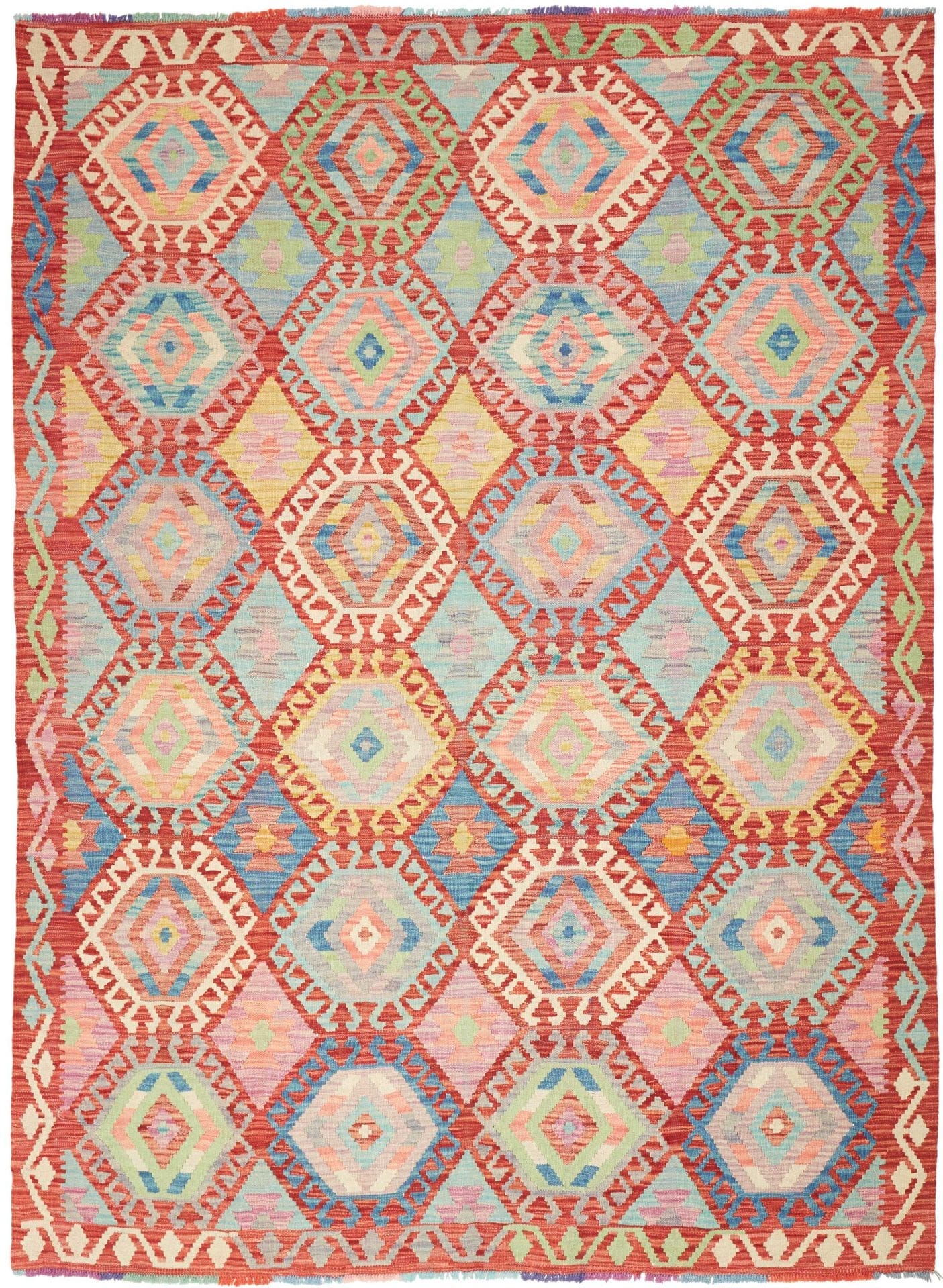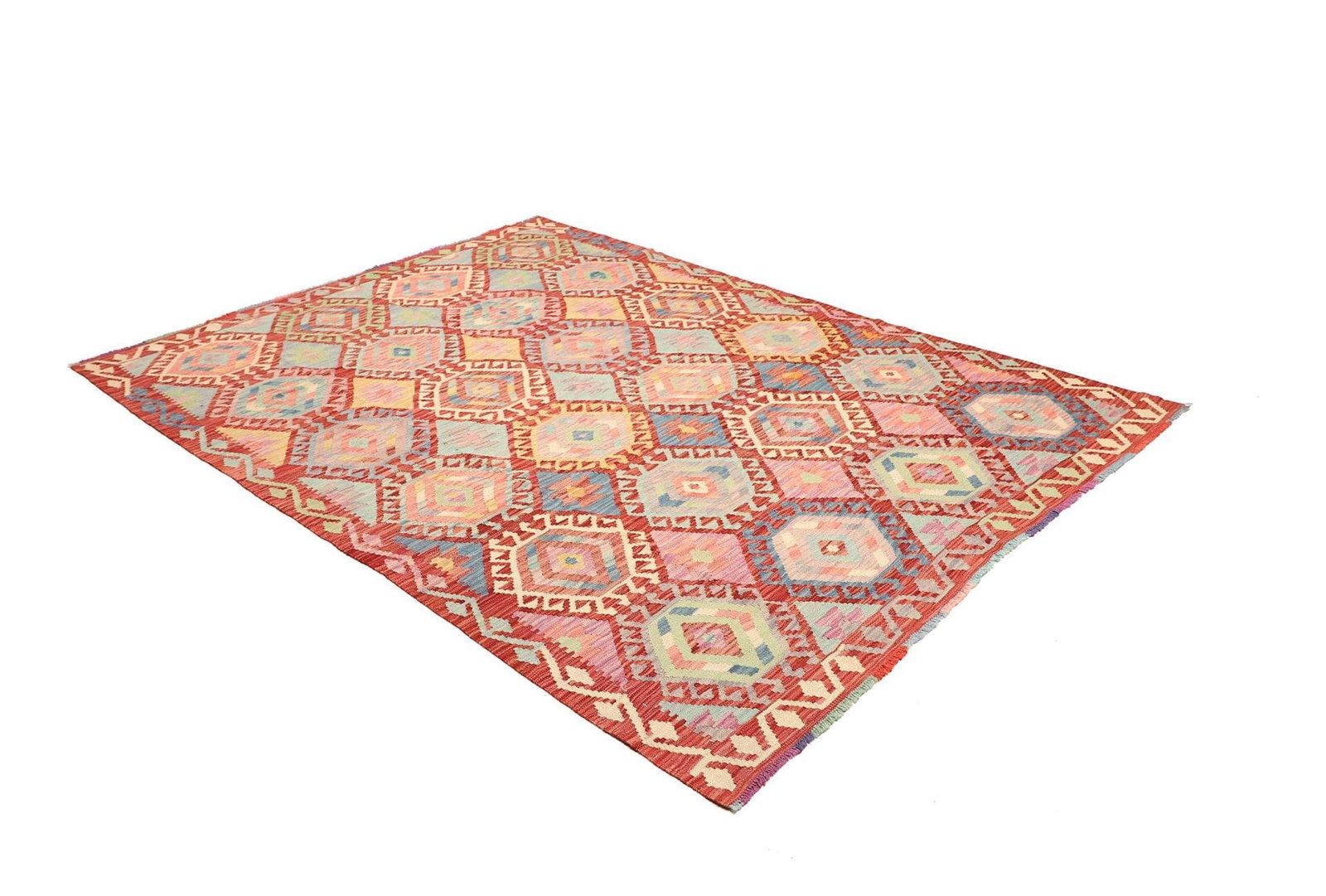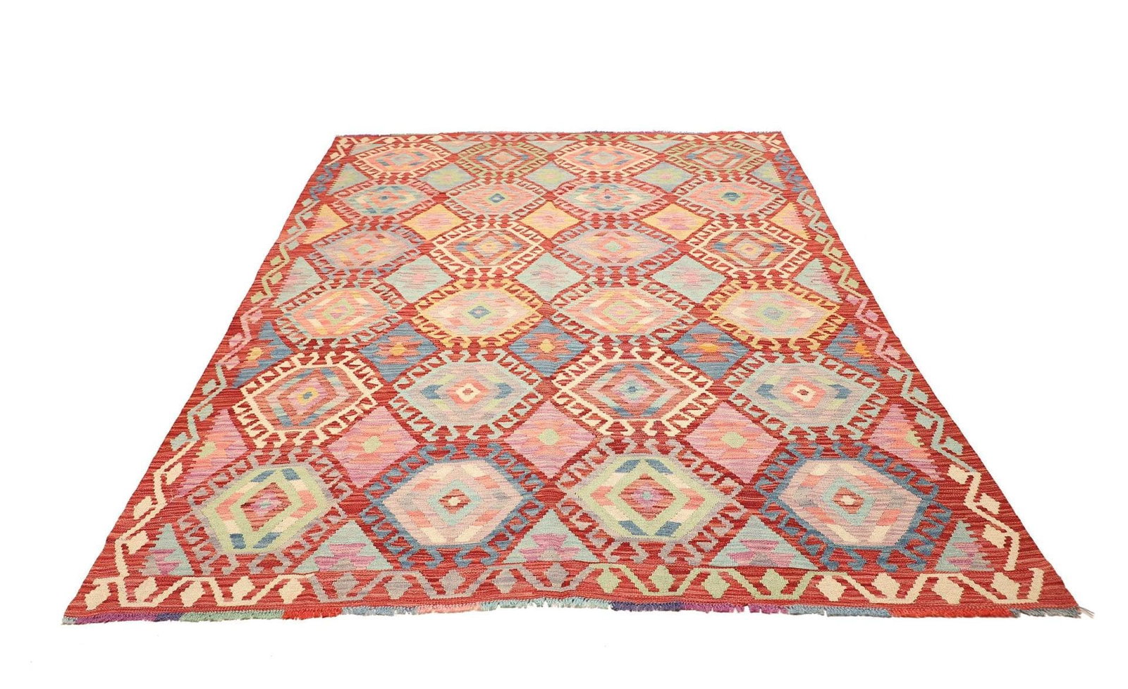 639$Ursprünglicher Preis war: 639$522$Aktueller Preis ist: 522$Kelim Teppich | Knotendichte: ca. 200.000 Knoten/m² | Material: 100% Schurwolle | Größe: 182 x 242 cm | Herkunft: Pakistan | Zustand: Handgewebt | Florhöhe: ca. 5 mm | Kette: 100% Baumwolle