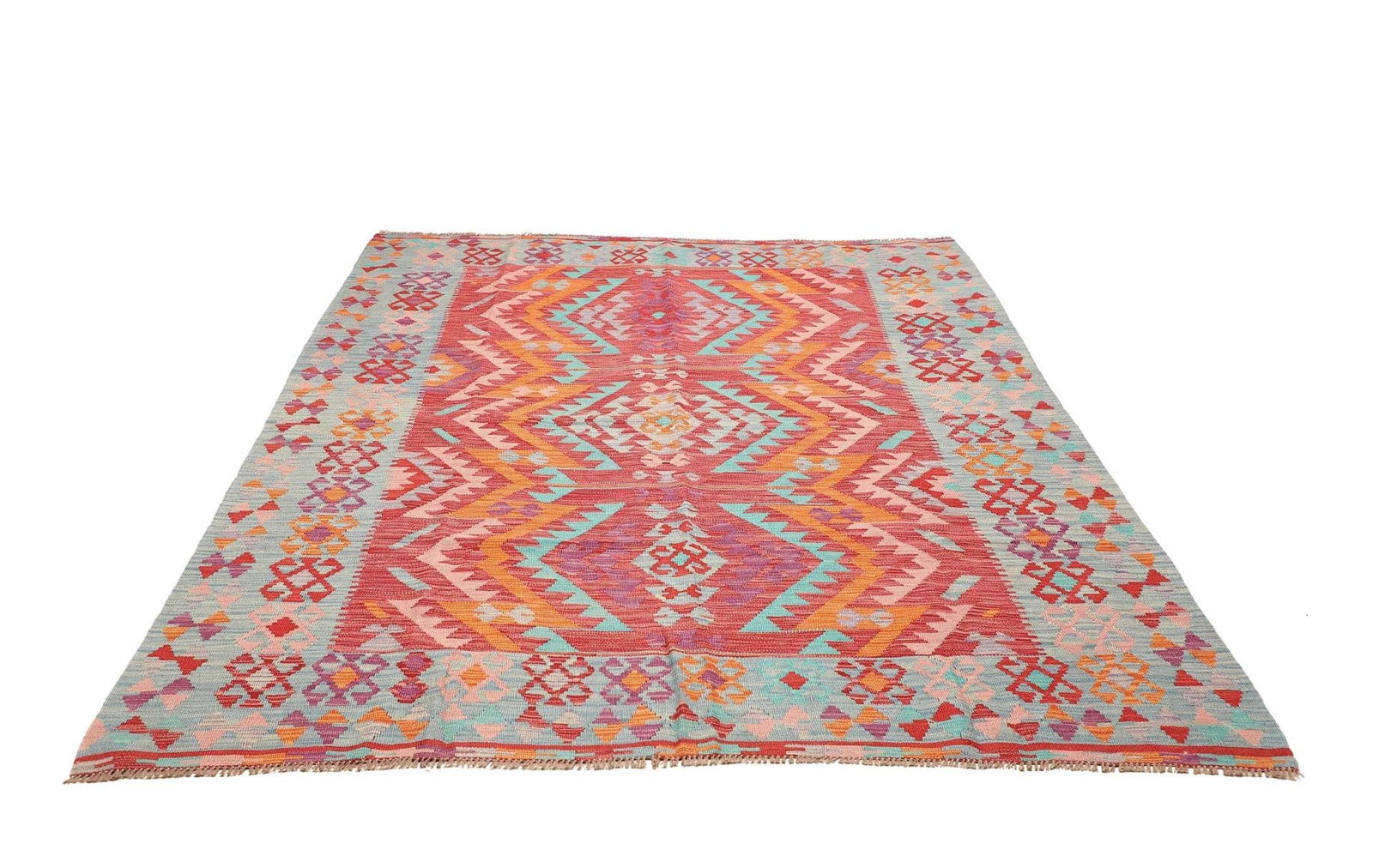 639$Ursprünglicher Preis war: 639$505$Aktueller Preis ist: 505$Handgewebter Kelim | Größe: 183 x 232 cm | Material: 100% Schurwolle (Flor), 100% Baumwolle (Kette) | Knotendichte: ca. 200.000 Knoten/m² | Höhe: ca. 5 mm | Herkunft: Pakistan | Rustikales Flair, geeignet für moderne Einrichtungen