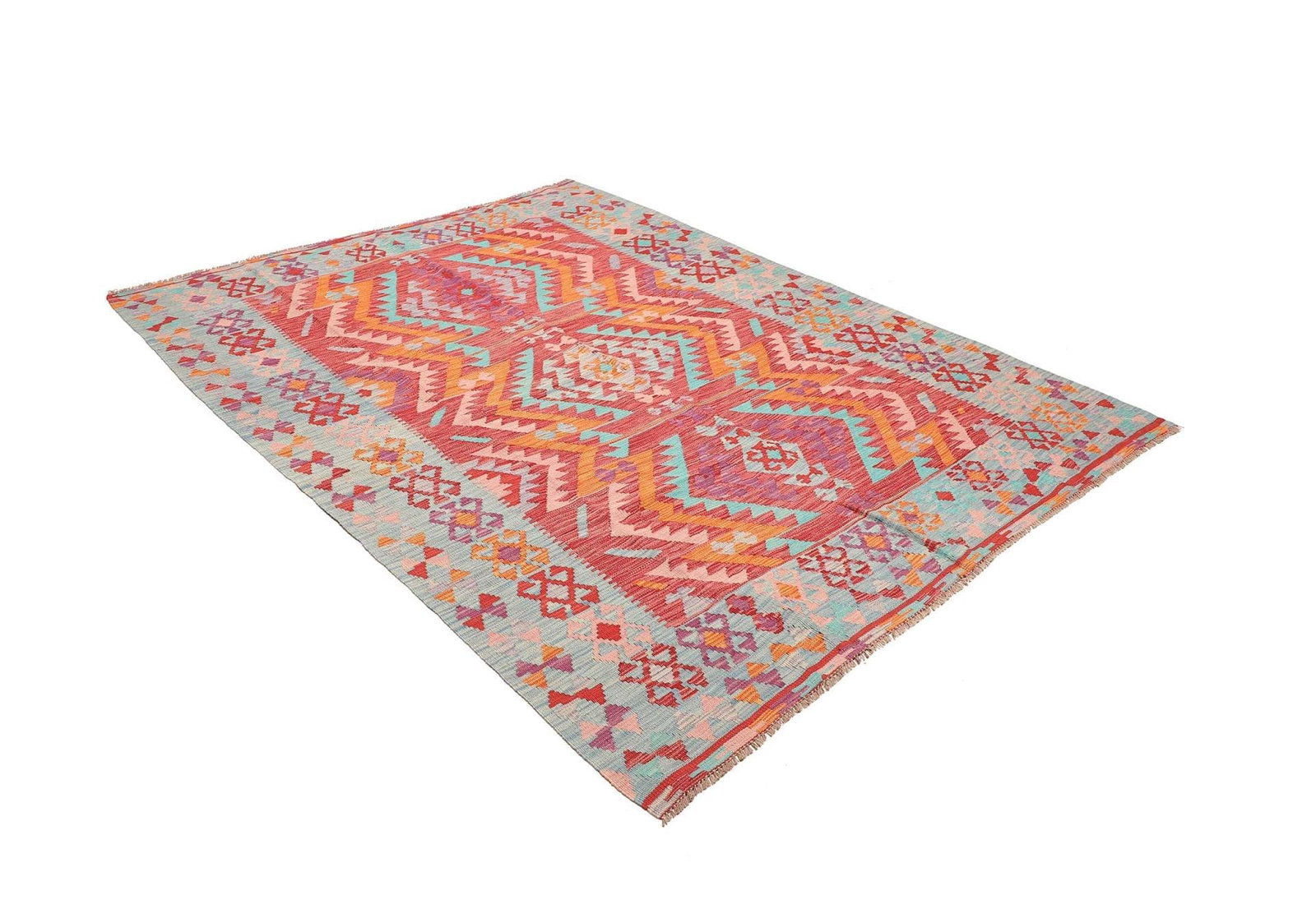 971$ In den WarenkorbKlassischer Orientteppich Kelim Hellblau 240×180 cm – Geometrisches Muster mit Medallion und roter Bordüre, Kurzflor, handgewebt