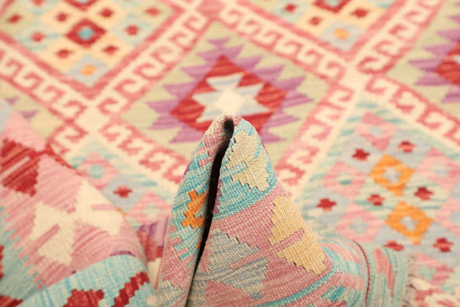 Ein besonderes Merkmal des Kelim Teppichs ist seine vielseitige Einsetzbarkeit. Ob im Wohnzimmer, im Schlafzimmer oder im Flur – dieser Teppich fügt sich nahtlos in jede Einrichtung ein. Die handgewebte Art sorgt dafür, dass jeder Teppich ein Unikat ist. Zudem ist Wolle von Natur aus schmutzabweisend und vielseitig in der Pflege. Ein weiterer Vorteil ist die ökologisch nachhaltige Herstellung, die durch die Verwendung von natürlichen Materialien und traditionellen Techniken gefördert wird.
