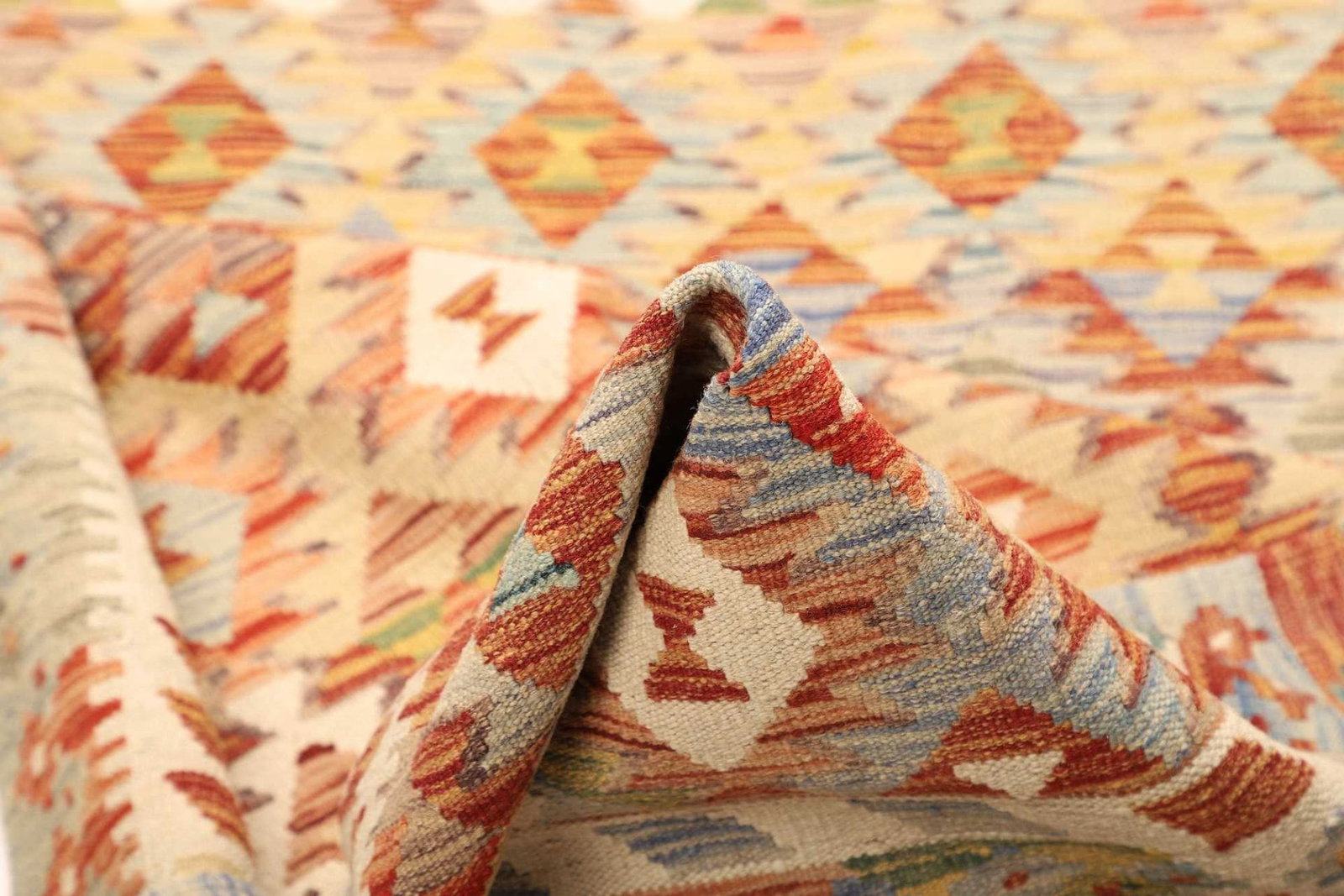 Unser Kelim Teppich besteht aus 100% hochwertiger Schurwolle, die für ihre Langlebigkeit und Widerstandsfähigkeit bekannt ist. Schurwolle ist nicht nur strapazierfähig, sondern bietet auch hervorragende Isoliereigenschaften, die Wärme spenden und gleichzeitig ein angenehmes Fußgefühl vermitteln. Die handgewebte Technik, die bei der Herstellung des Teppichs angewendet wird, trägt zur Robustheit und zum einzigartigen Charakter des Stücks bei. Jeder Teppich ist ein Unikat, das die Liebe und Sorgfalt widerspiegelt, die in seine Herstellung investiert wurden.