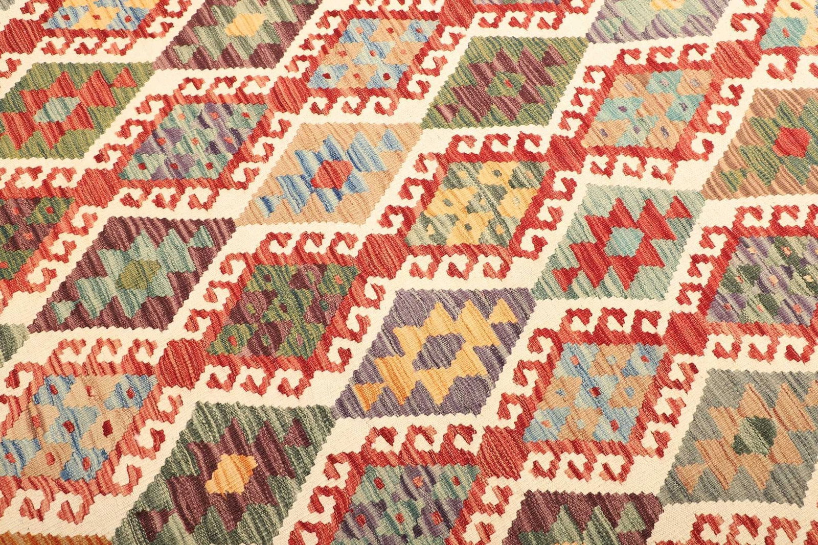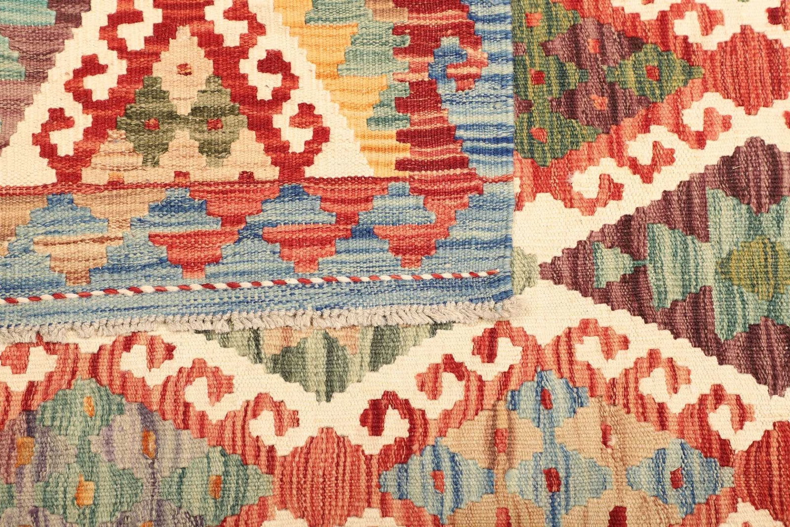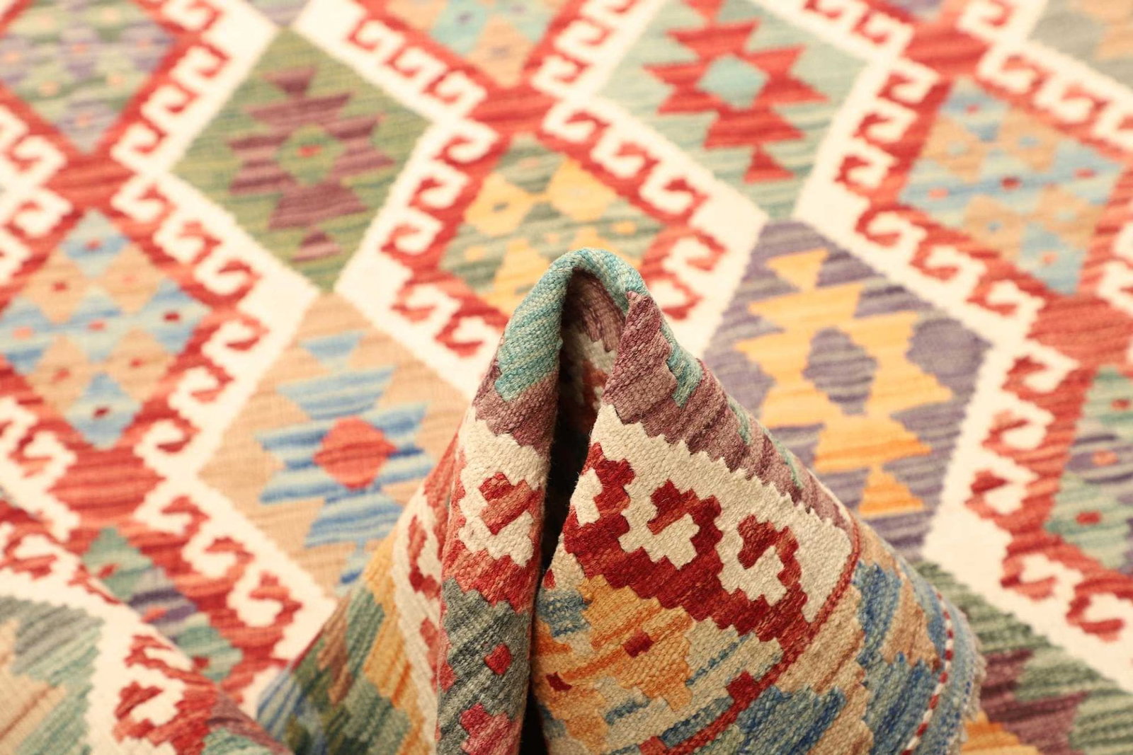 Unser Kelim Teppich ist aus 100% hochwertiger Schurwolle gefertigt. Dieses Material ist bekannt für seine Robustheit und Langlebigkeit. Die Verwendung von Schurwolle sorgt dafür, dass der Teppich nicht nur angenehm weich und warm ist, sondern auch eine hohe Strapazierfähigkeit bietet. Die handgewebte Technik verleiht dem Teppich eine besondere Note und macht jeden einzelnen Teppich zu einem Unikat. Die präzise Knotendichte sorgt für ein langlebiges und strapazierfähiges Produkt, das seinen ursprünglichen Charme über viele Jahre hinweg bewahrt.