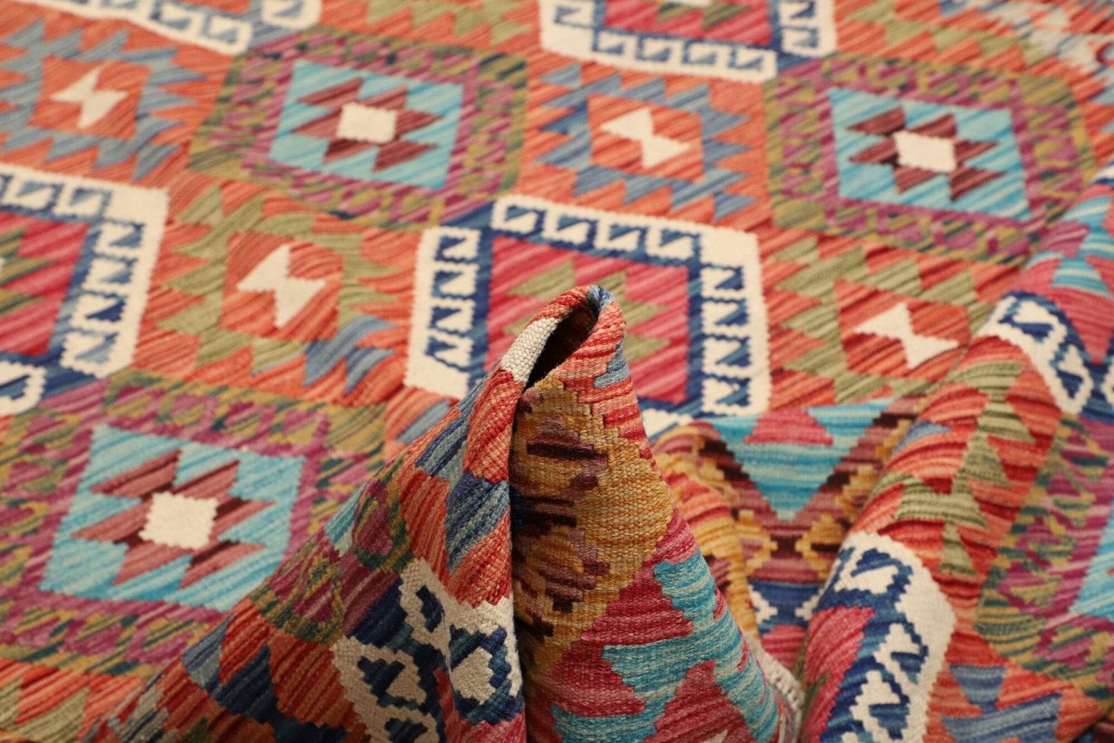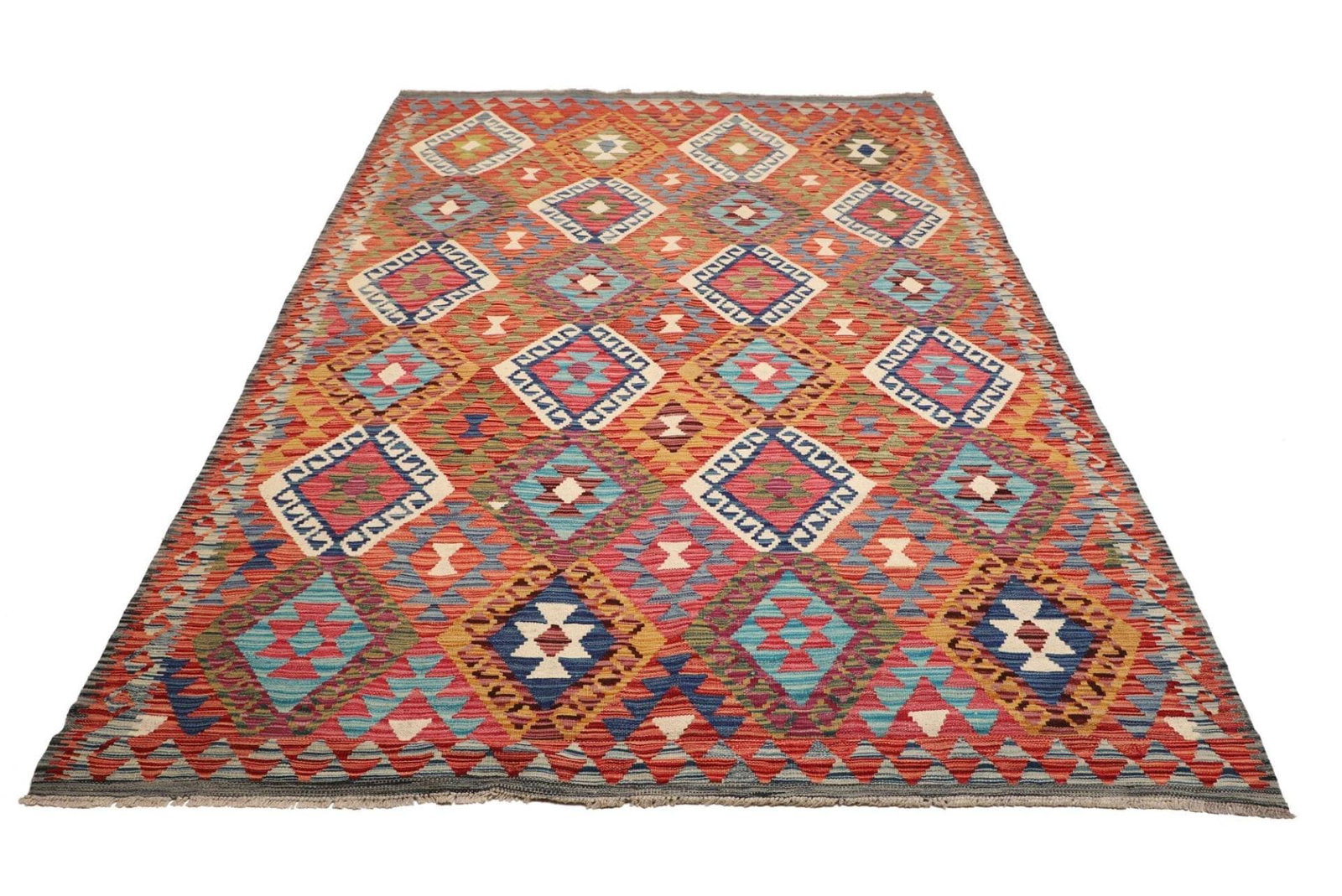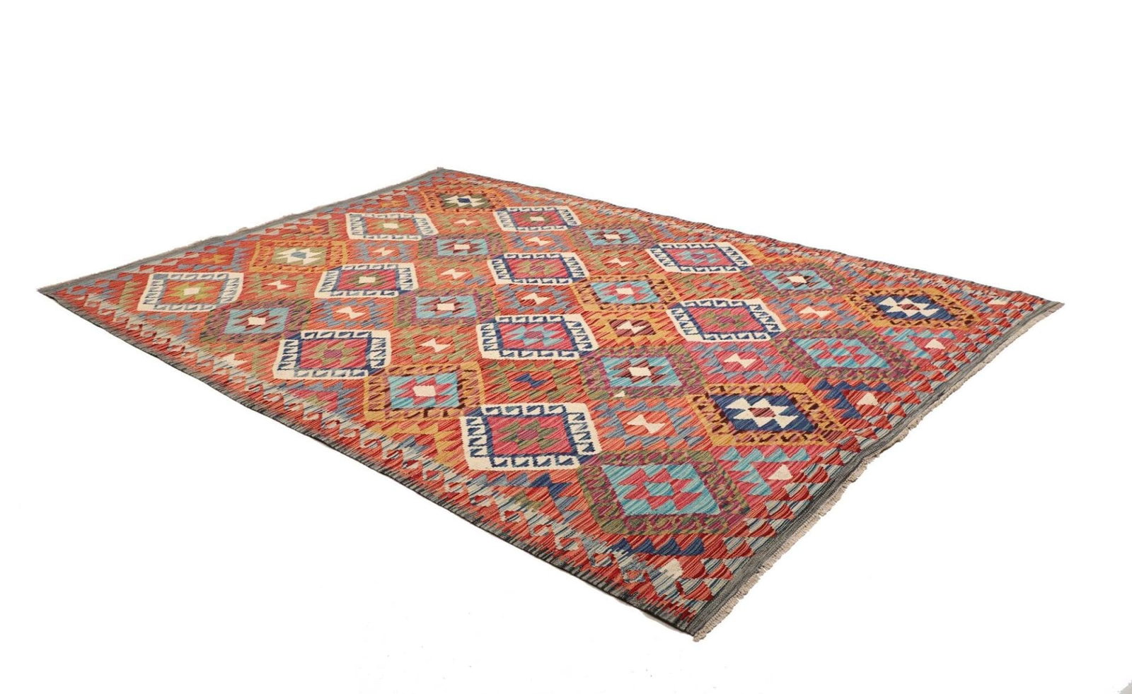Handgewebter Kelim Teppich | Knotendichte: ca. 200.000 Knoten/m² | Material: 100% Schurwolle und 100% Baumwolle | Größe: 184×251 cm | Herkunft: Pakistan | Florhöhe: ca. 5 mm | Beidseitig verwendbar