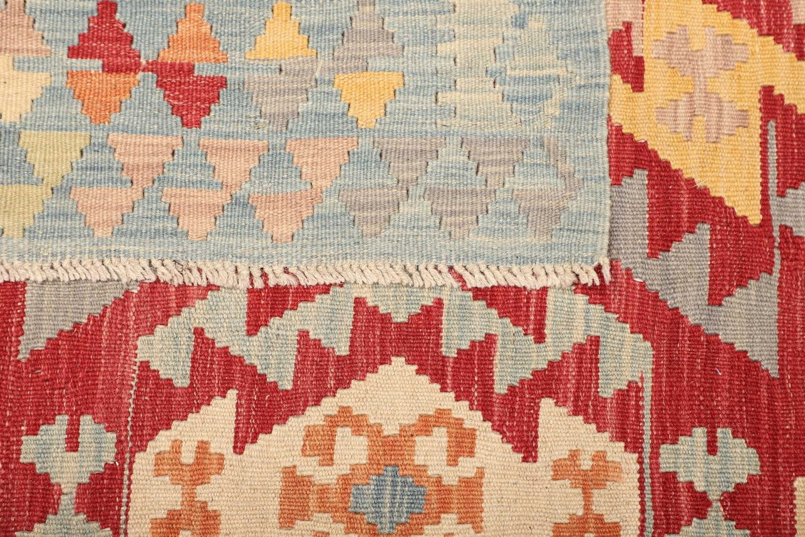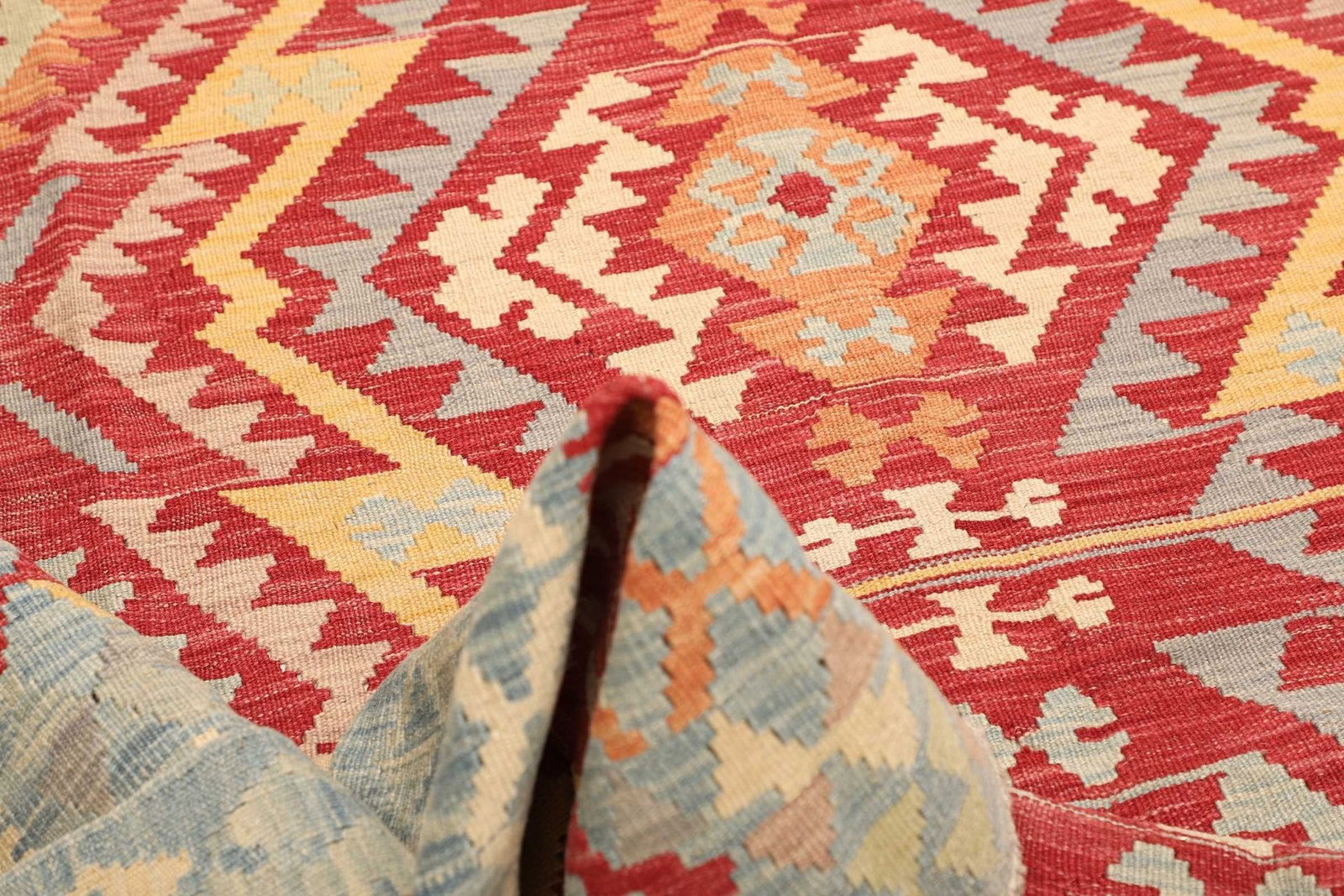 Um die Langlebigkeit Ihres Kelim Teppichs zu gewährleisten, empfehlen wir, ihn regelmäßig mit einem Staubsauger bei niedriger Leistungsstufe zu reinigen. Bei hartnäckigen Flecken sollten Sie nur einen feuchten Lappen verwenden und niemals den gesamten Teppich einweichen, um die Wolle nicht zu beschädigen.
