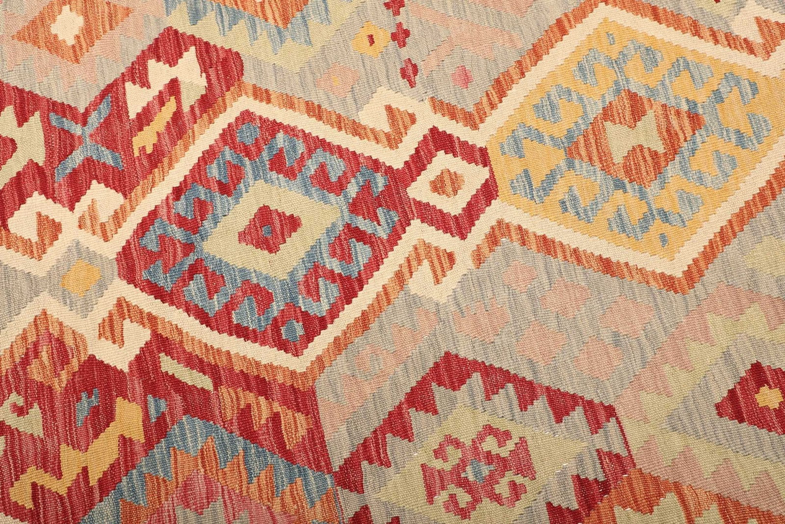 Dieser Kelim Teppich besteht ausschließlich aus hochwertiger Schurwolle. Schurwolle ist bekannt für ihre Langlebigkeit, Wärmeisolierung und die Fähigkeit, Feuchtigkeit zu regulieren. Der handgewebte Herstellungsprozess garantiert, dass jeder Teppich ein Unikat ist. Die Knotendichte ist optimal für einen robusten Teppich, der dennoch weich und bequem ist. Die natürliche Widerstandsfähigkeit der Wolle schützt vor Abnutzung und macht es einfach, ihn in stark frequentierten Bereichen zu verwenden.